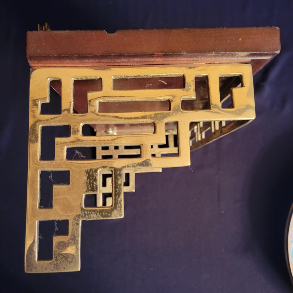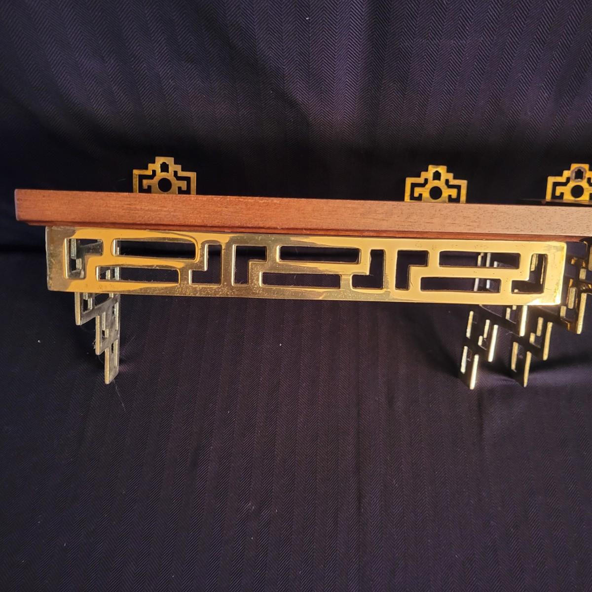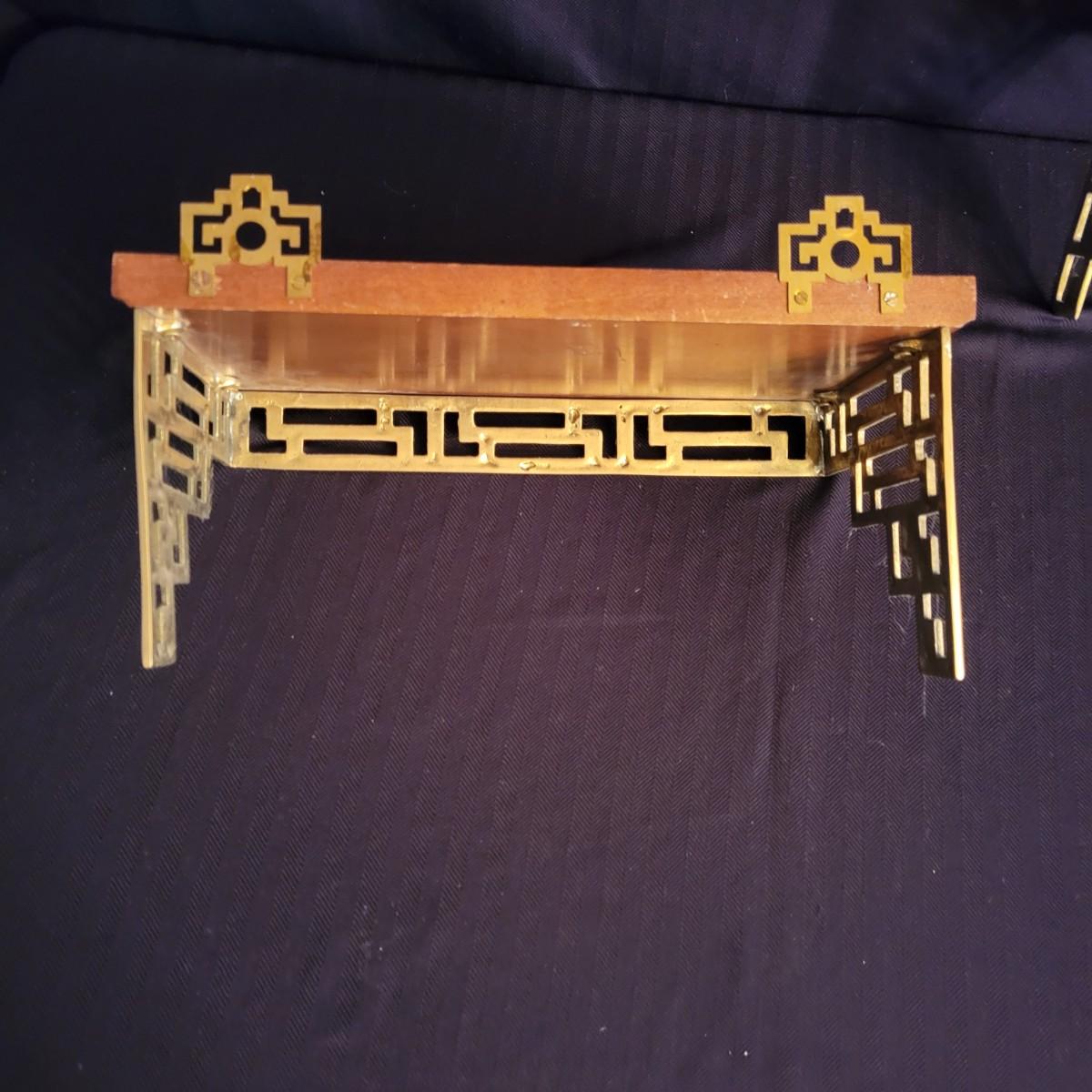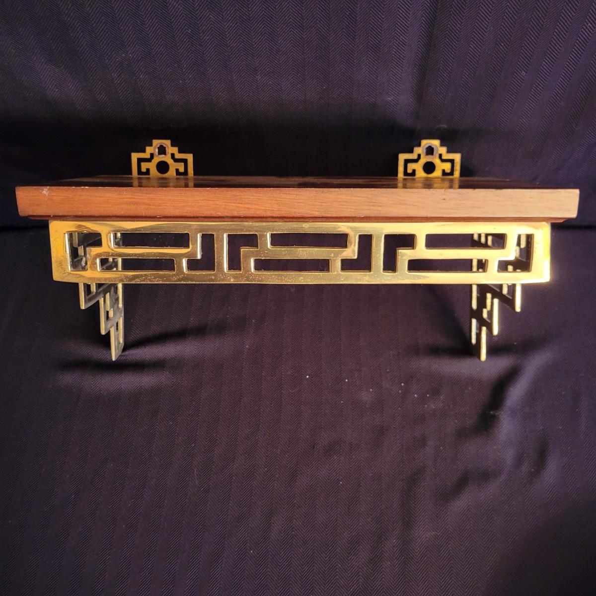 A pair of decorative Asian plates with a diameter of approximately 12". Also includes two brass easels and two wall shelves with wooden tops and an Asian themed brass base. Shipping available