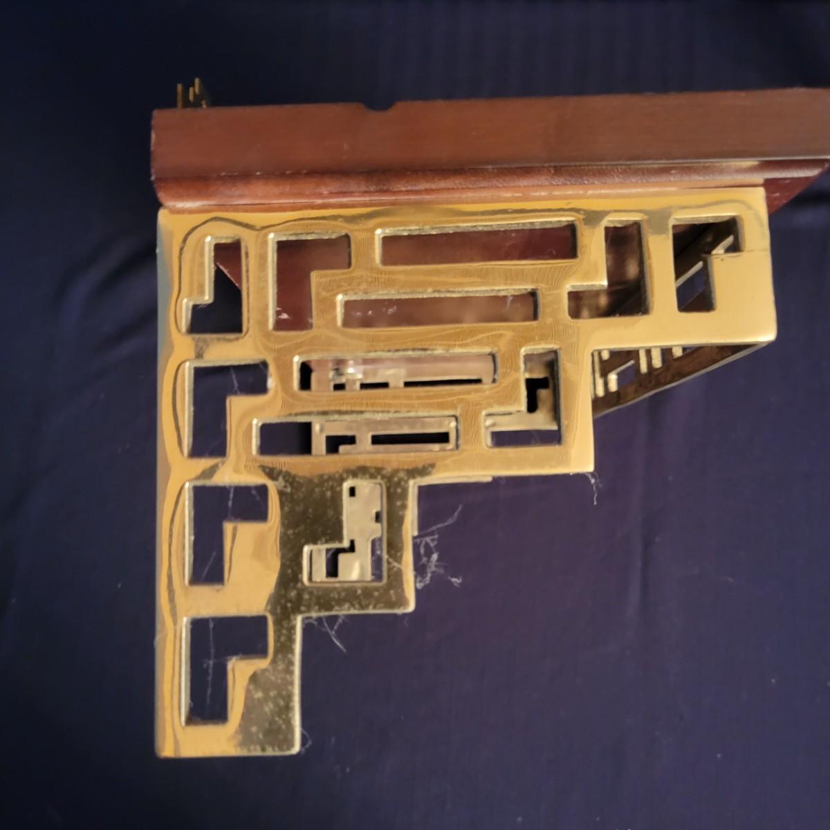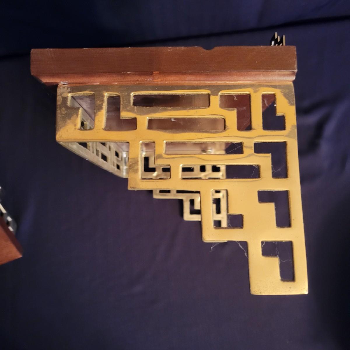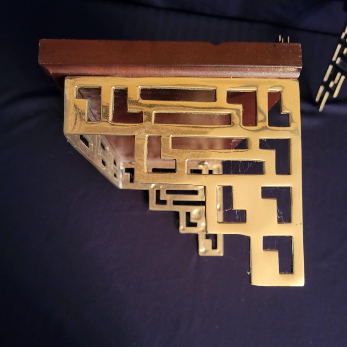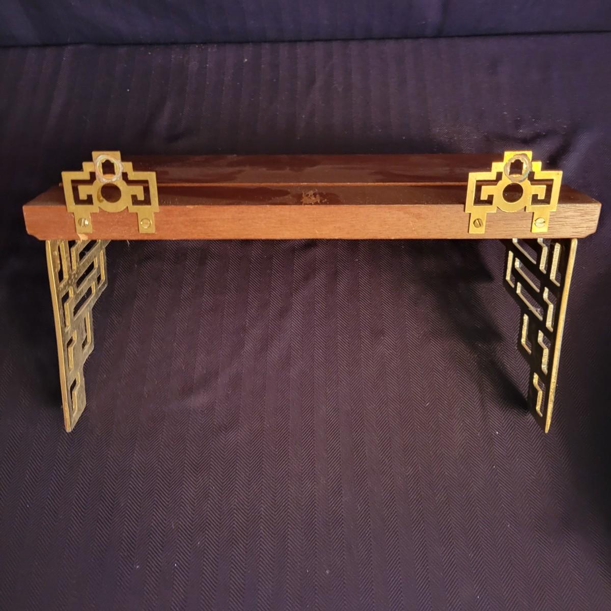 A pair of decorative Asian plates with a diameter of approximately 12". Also includes two brass easels and two wall shelves with wooden tops and an Asian themed brass base. Shipping available