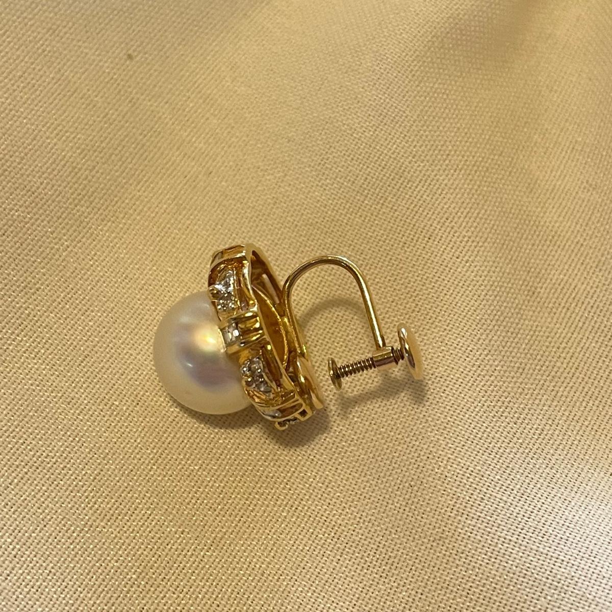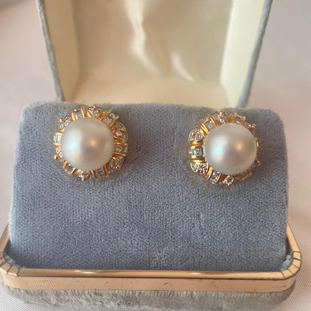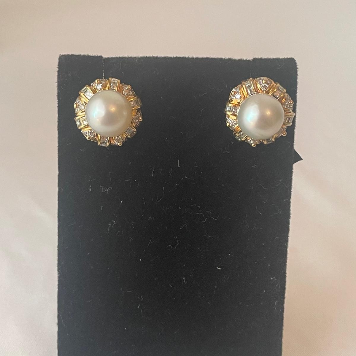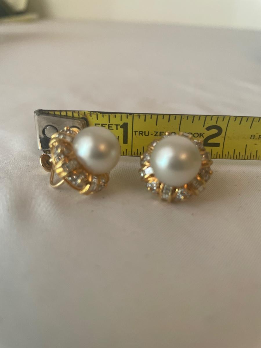This pair of earrings have the mark 14K. They also tested positive with our Diamond testers for their 12 per earring diamonds that are set around a large pearl; we cannot authenticate the pearls but the owner has stated that they are South Sea Pearls. They come in a grey velvet box that we are unsure if it is original box of these earrings. These earrings have a screw on assembly and it is on the back of this section you will find the 14K mark.
