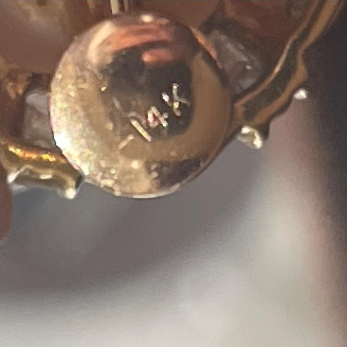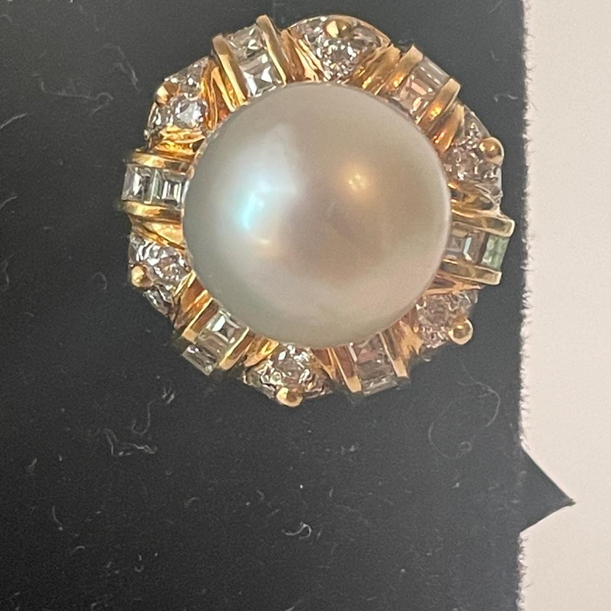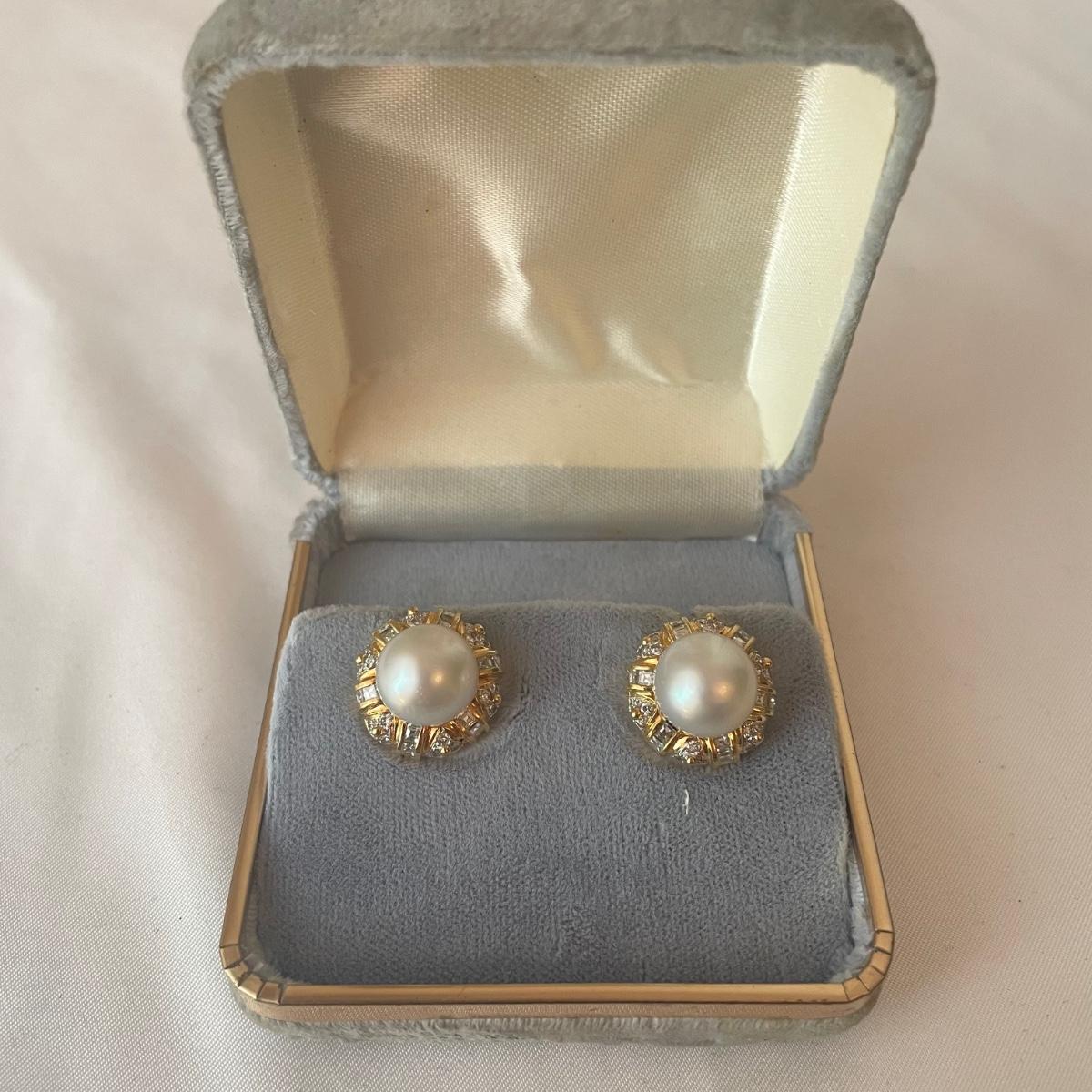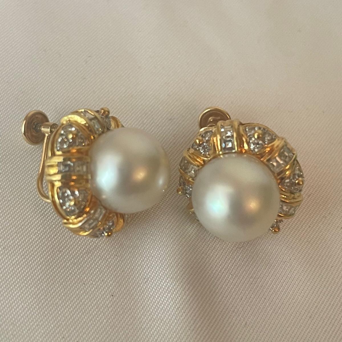 This pair of earrings have the mark 14K. They also tested positive with our Diamond testers for their 12 per earring diamonds that are set around a large pearl; we cannot authenticate the pearls but the owner has stated that they are South Sea Pearls. They come in a grey velvet box that we are unsure if it is original box of these earrings. These earrings have a screw on assembly and it is on the back of this section you will find the 14K mark.
