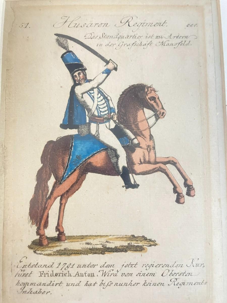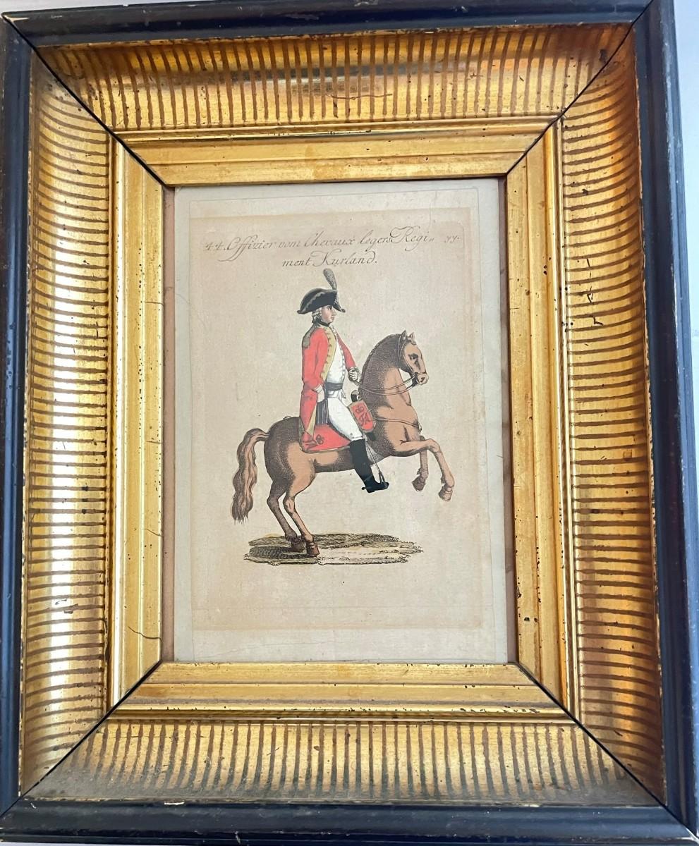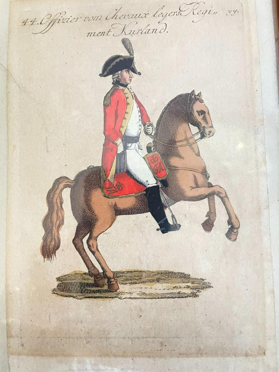 Plate 44 measures 7' X 4.5" sight view, no date, Kurkland regiment. Plate number 51 published by Frederich Anton in 1792, hand colored lithograph, measures 6.5" X 4.75" sight view. Left top corner missing about 1/2 cm or less.