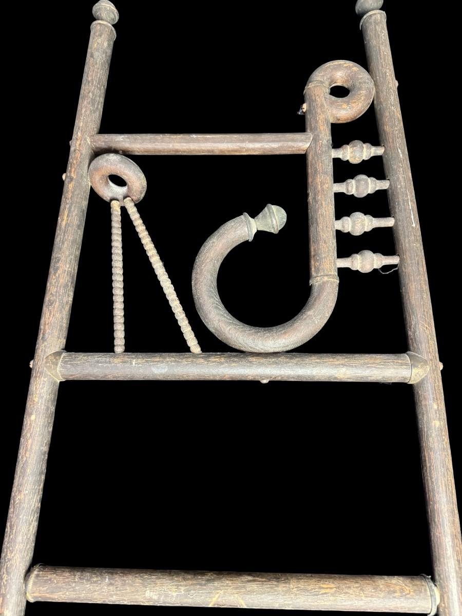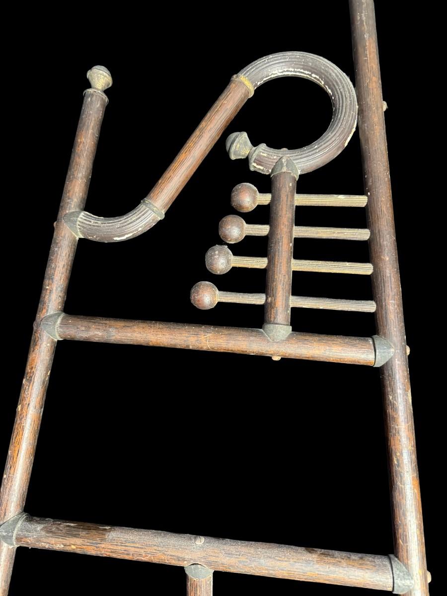 These pieces each feature a classic Art Deco motif at the top. They are constructed of wood, with metal art holders. There is age related wear to both, including some loose hardware and warping. These are nice period pieces. Measurement: 66”H x 20”W at base (each). [SR]