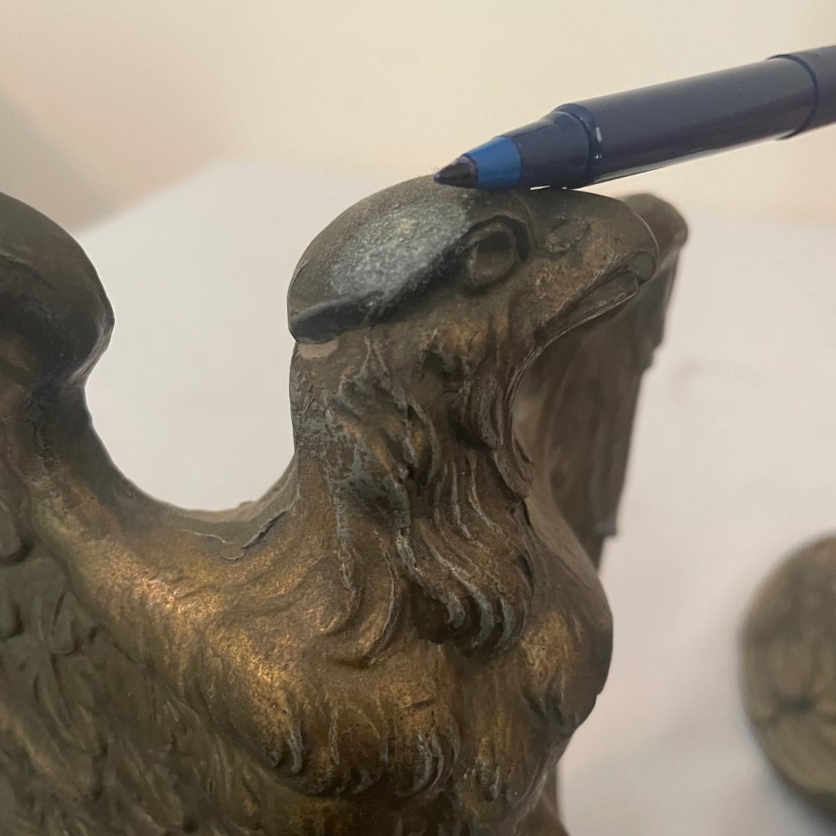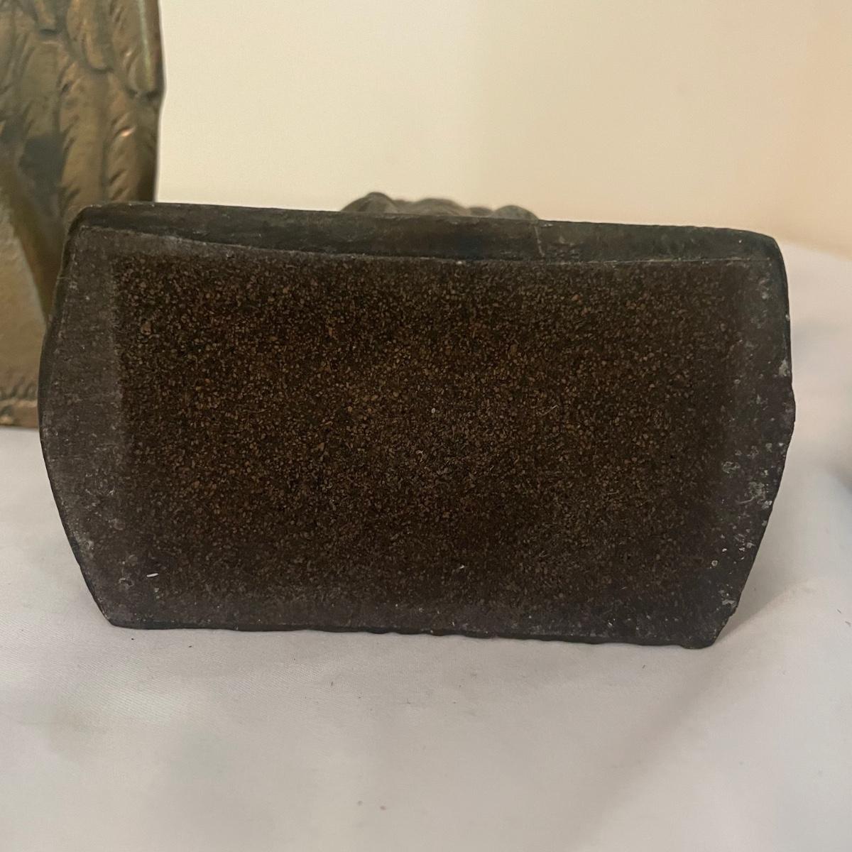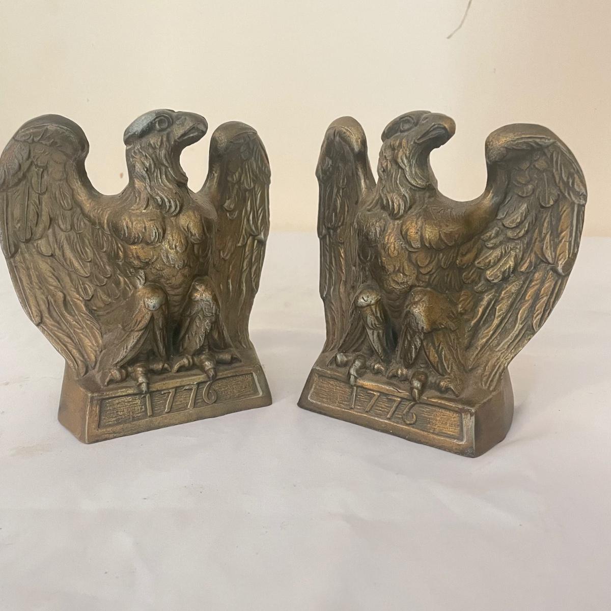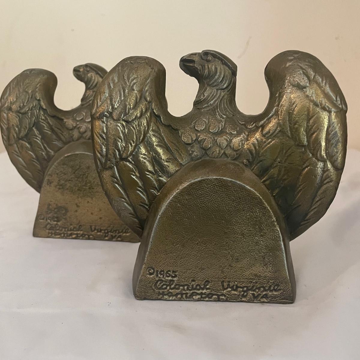 This matching pair of solid brass eagle bookends are stamped on their backs - "1965 Colonial Virginia Hampton VA". Note that one eagle has a spot on its head of oxidation, see image.