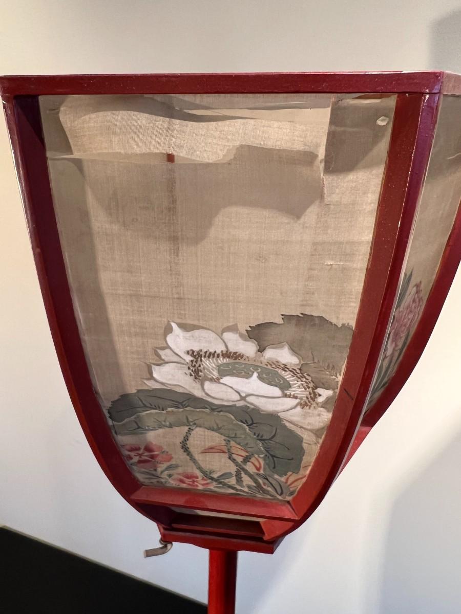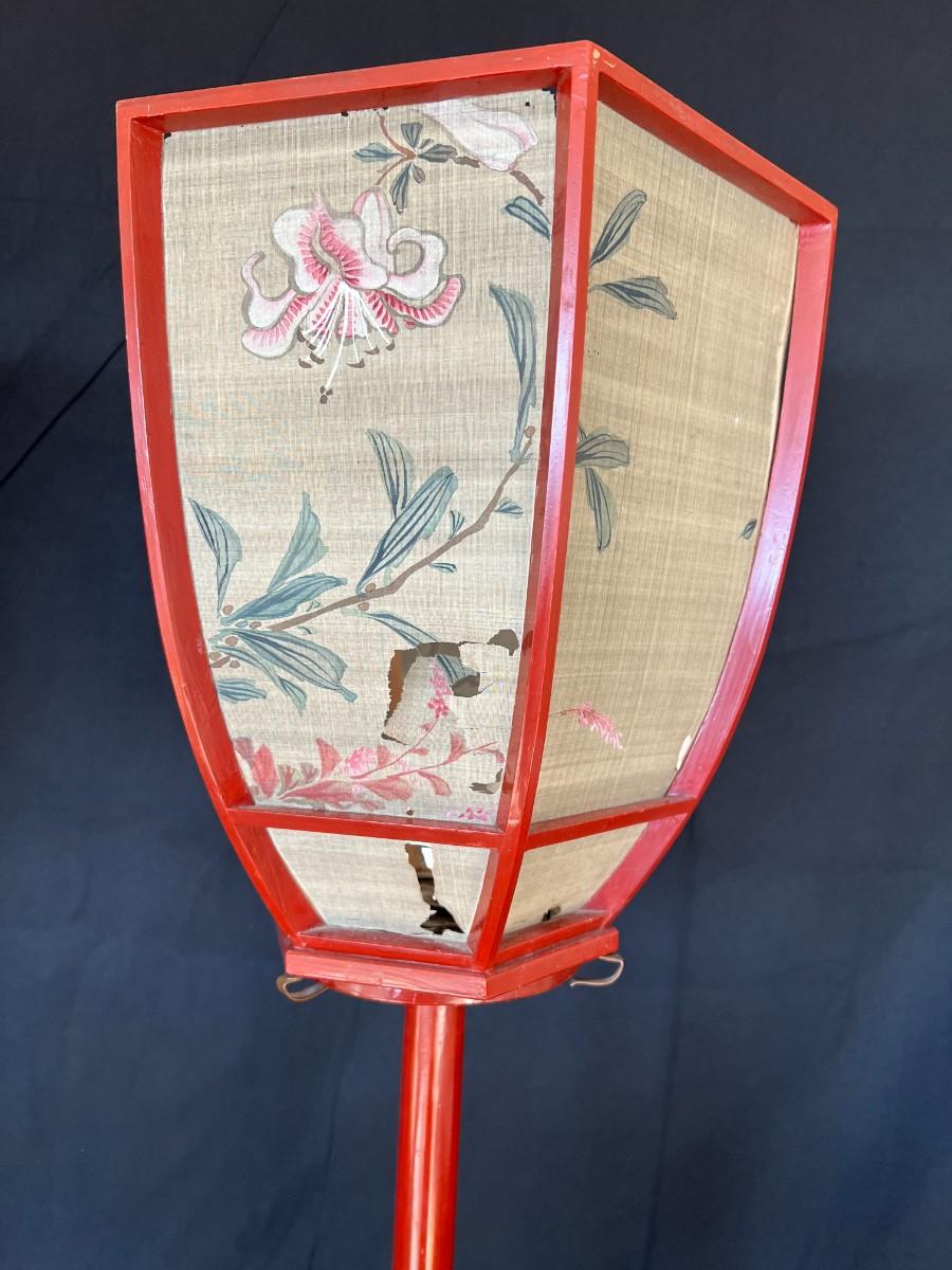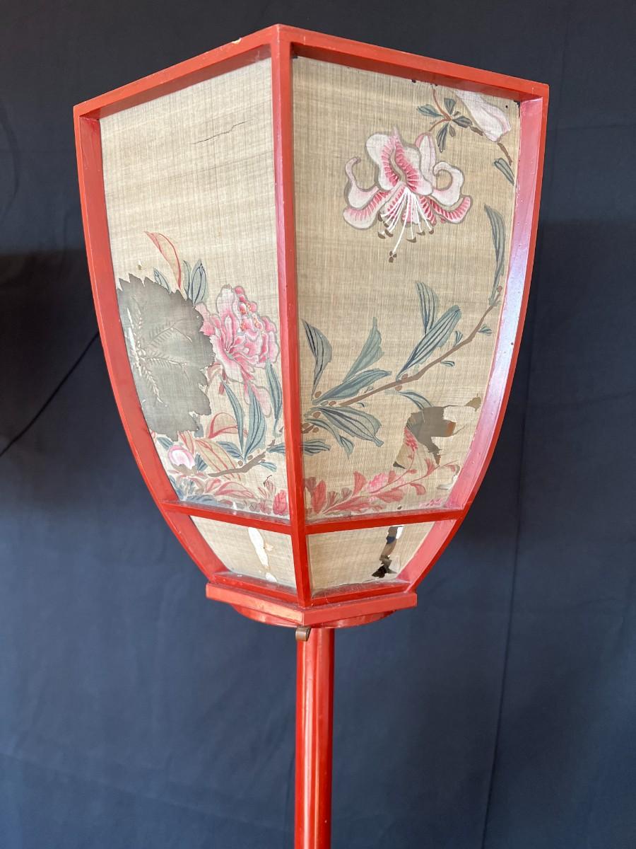 Pair of 19th century deep red lacquer candlesticks with a floral painted silk housing. The candle holders stand at approximately 40 inches tall. Provenance from the estate indicates that these were purchased in 1997 from the Honeychurch Antiques gallery in Seattle, WA. In good condition, with some rips in the silk housing (shown in photos). Photos provided in indoor and bright natural light, and against a light and dark backdrop (to represent the colors and finishes as accurately as possible).