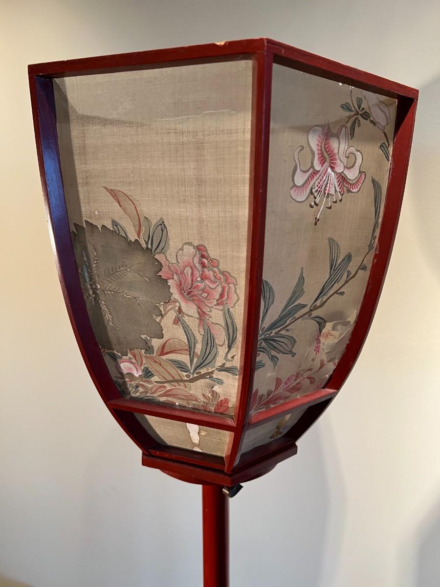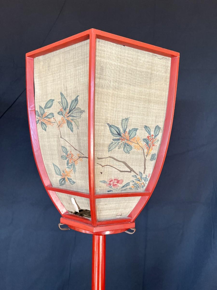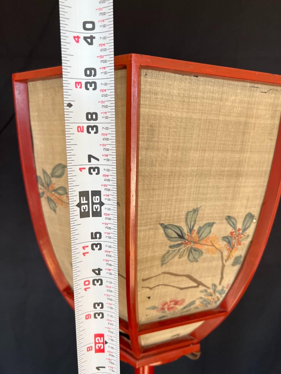 Pair of 19th century deep red lacquer candlesticks with a floral painted silk housing. The candle holders stand at approximately 40 inches tall. Provenance from the estate indicates that these were purchased in 1997 from the Honeychurch Antiques gallery in Seattle, WA. In good condition, with some rips in the silk housing (shown in photos). Photos provided in indoor and bright natural light, and against a light and dark backdrop (to represent the colors and finishes as accurately as possible).