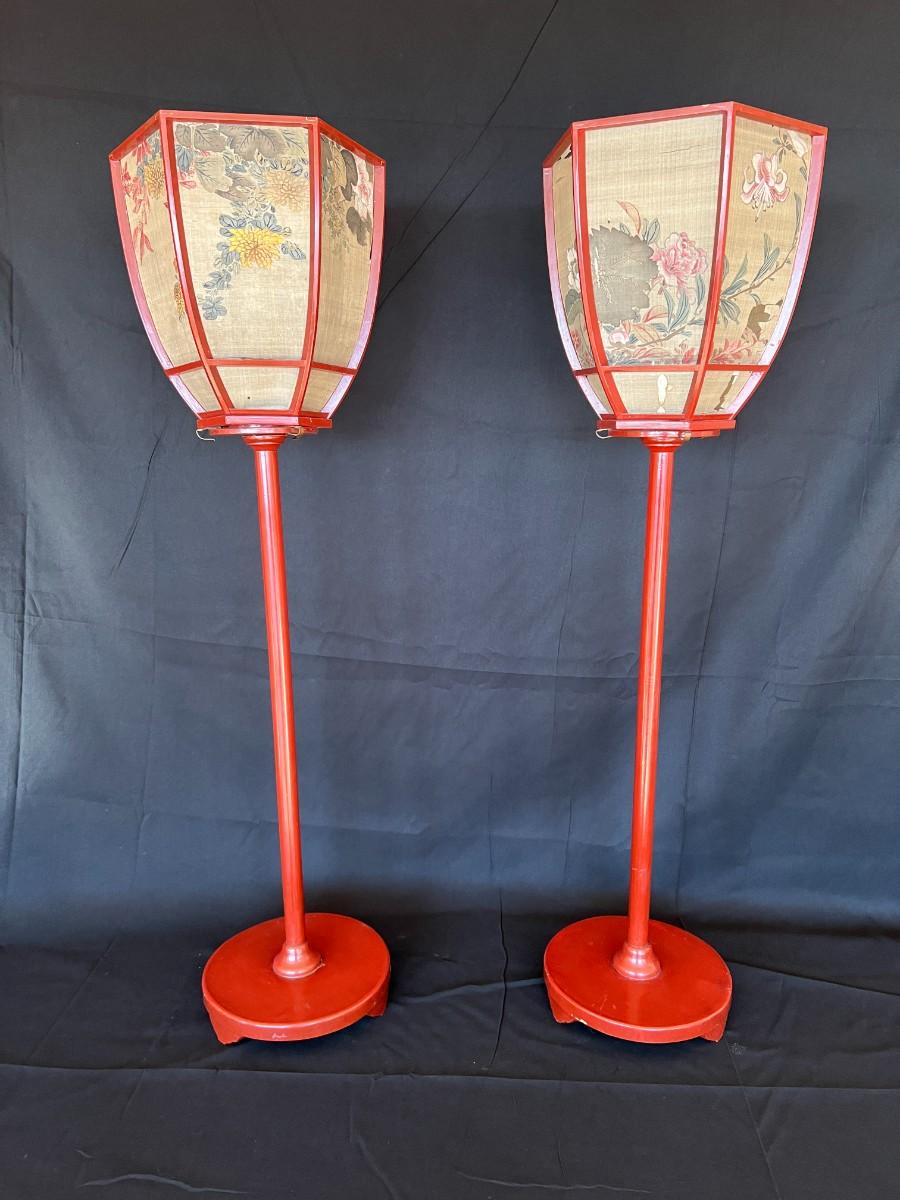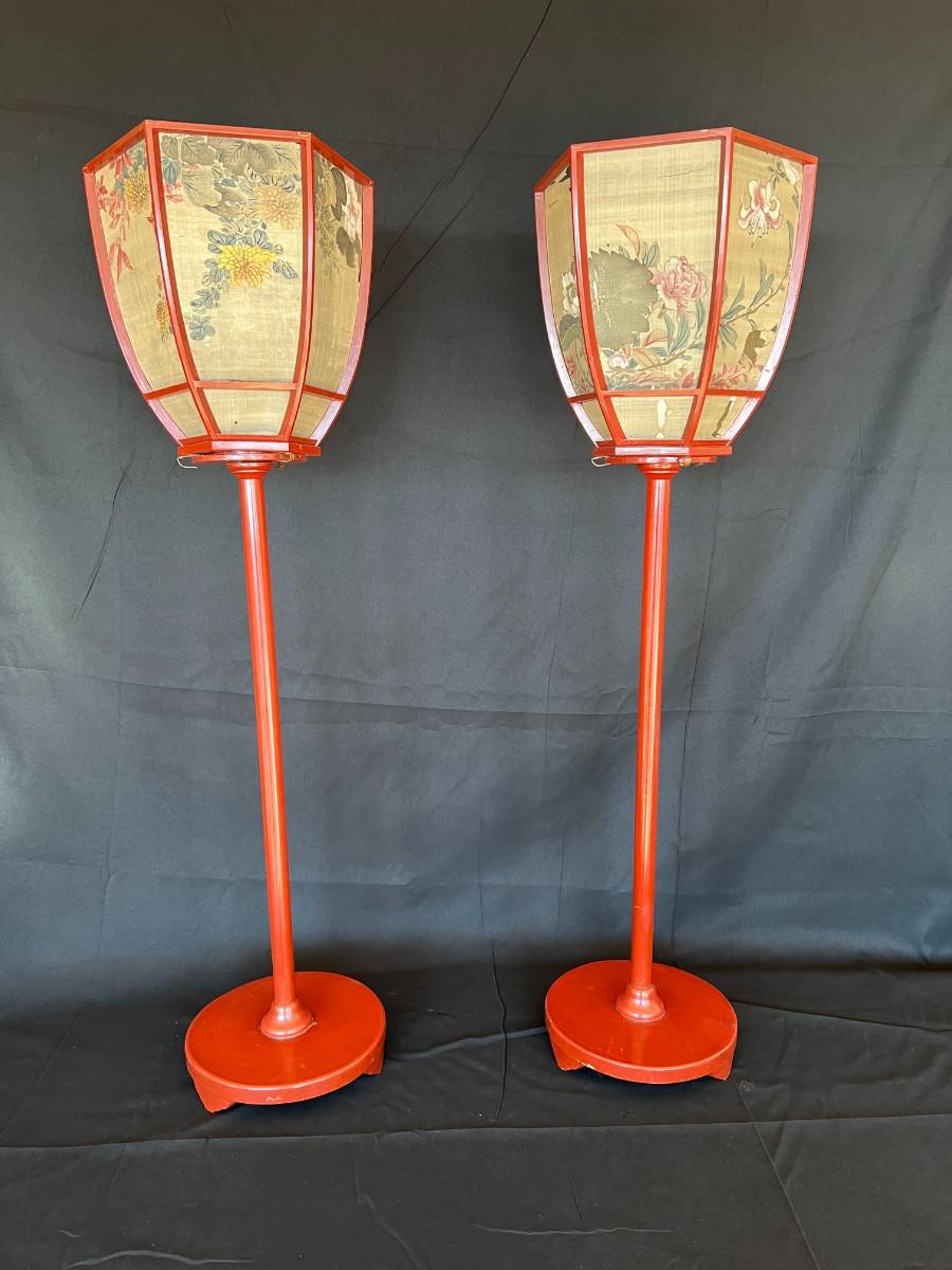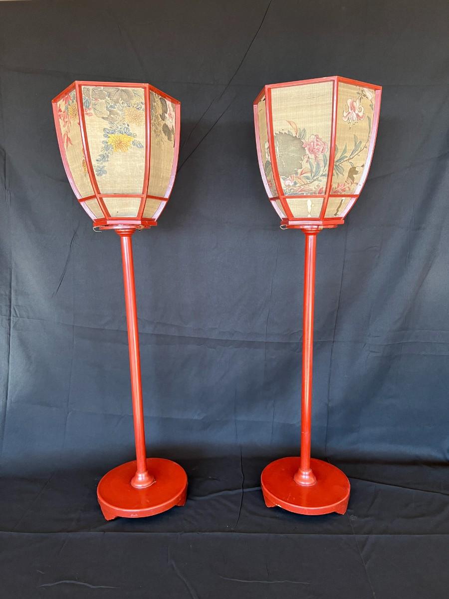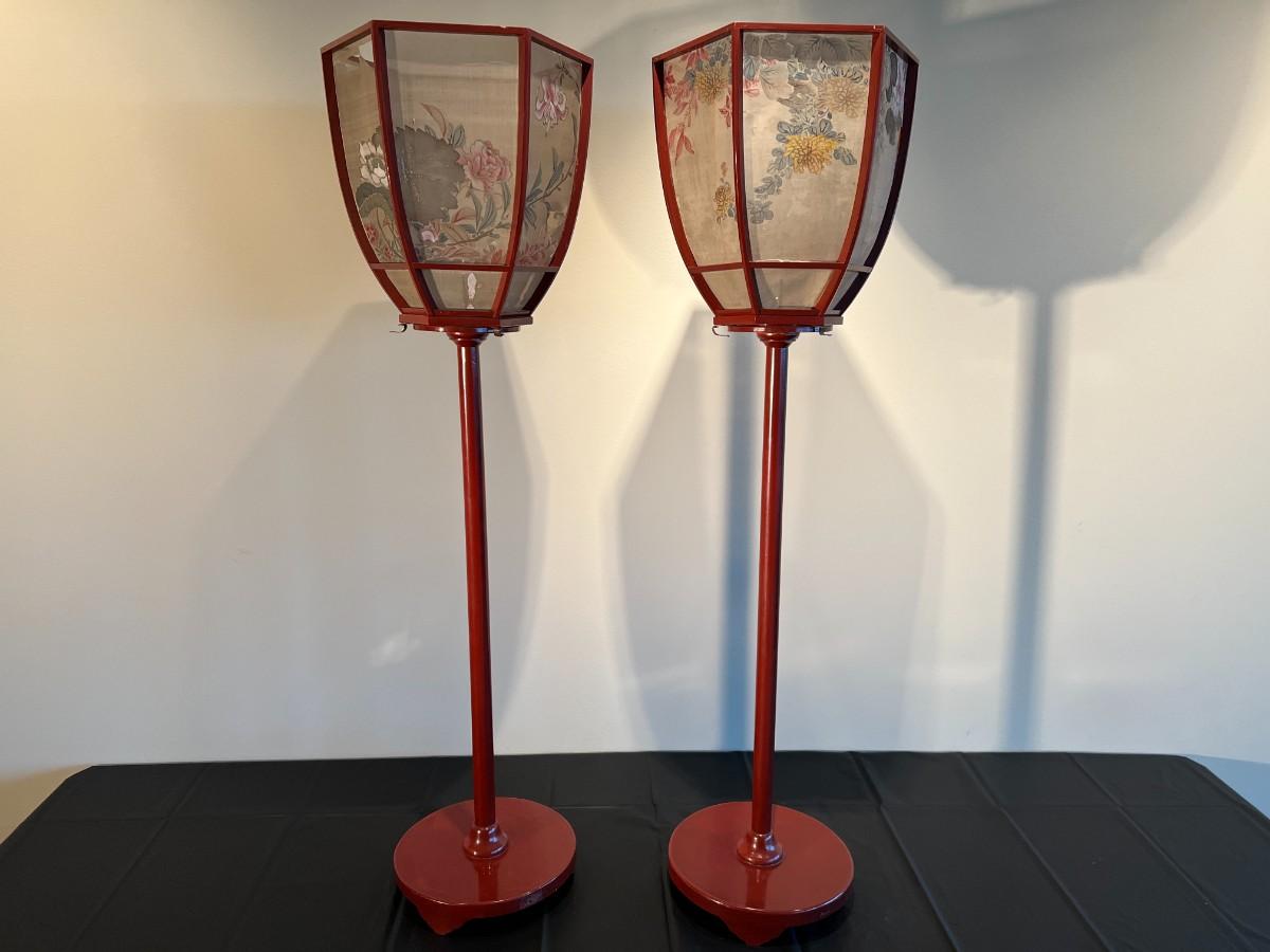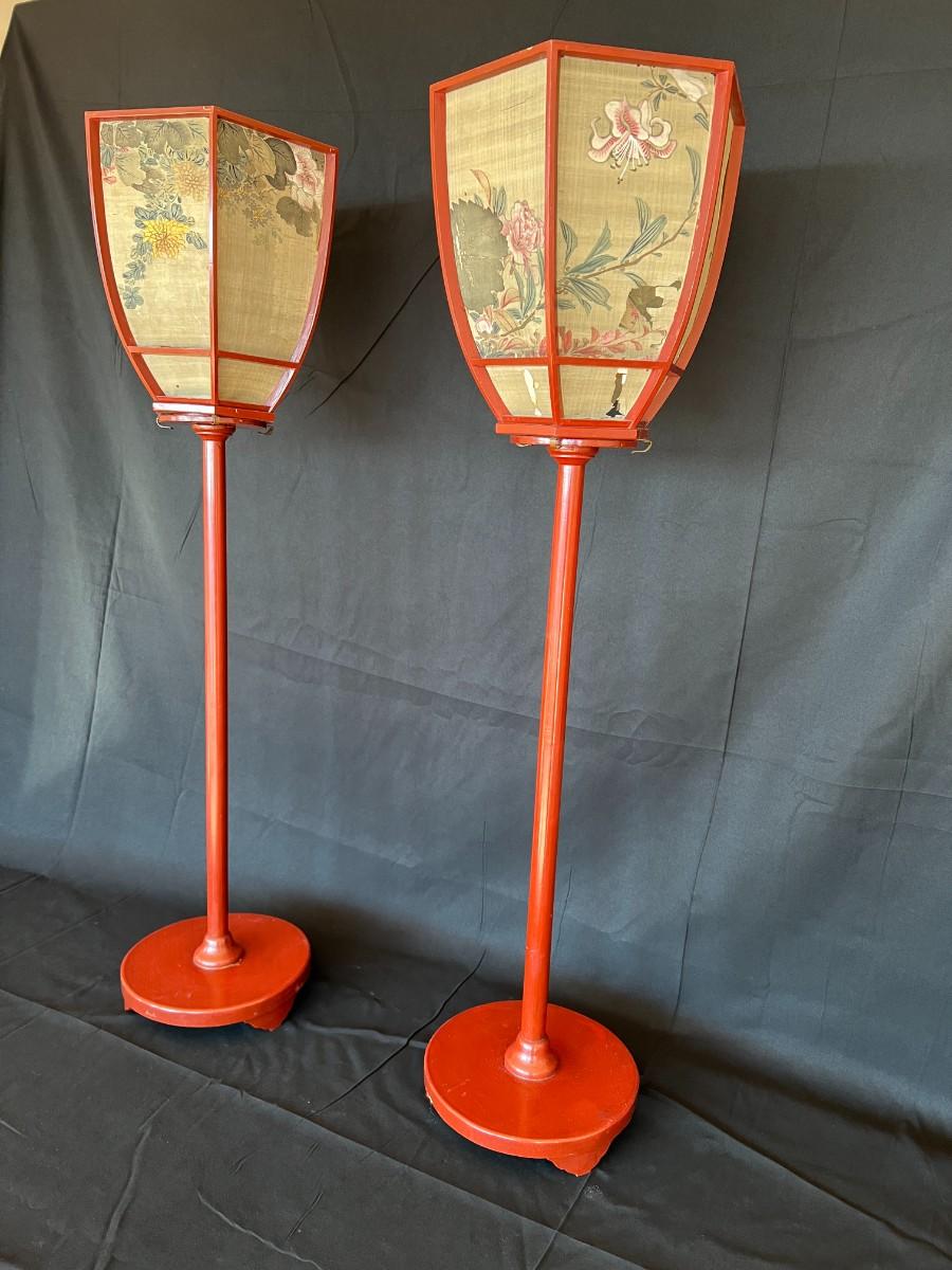 Pair of 19th Century Japanese Red Lacquer Candlesticks with Painted Silk Lamp Housing