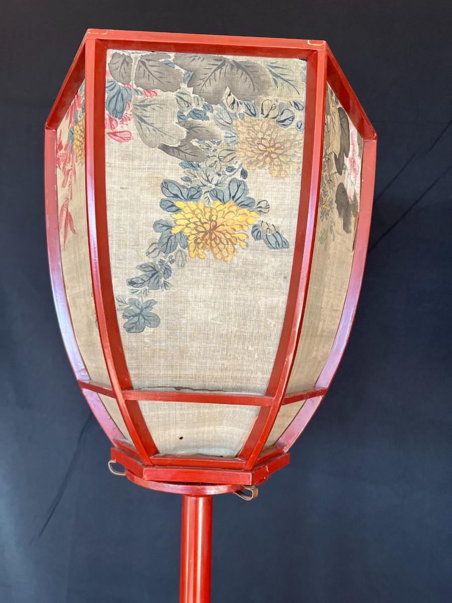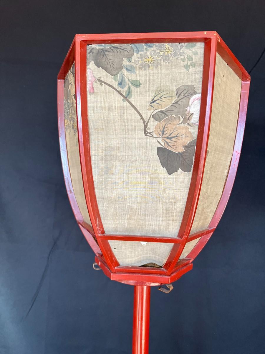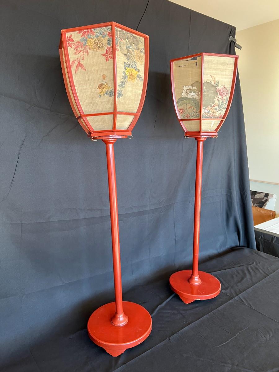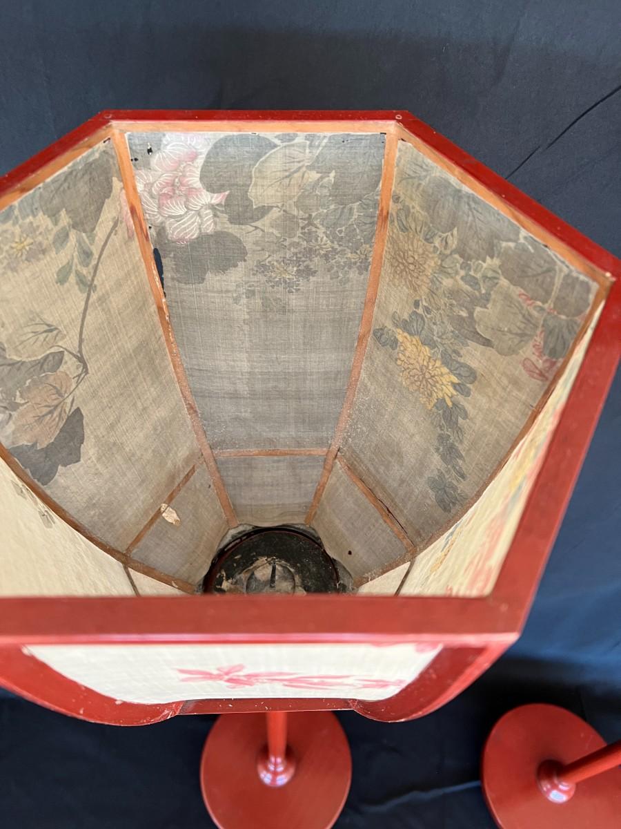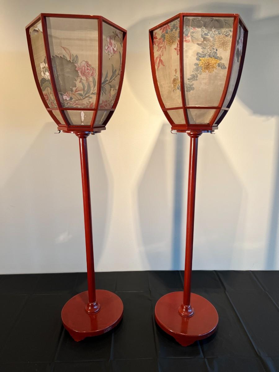 Pair of 19th Century Japanese Red Lacquer Candlesticks with Painted Silk Lamp Housing