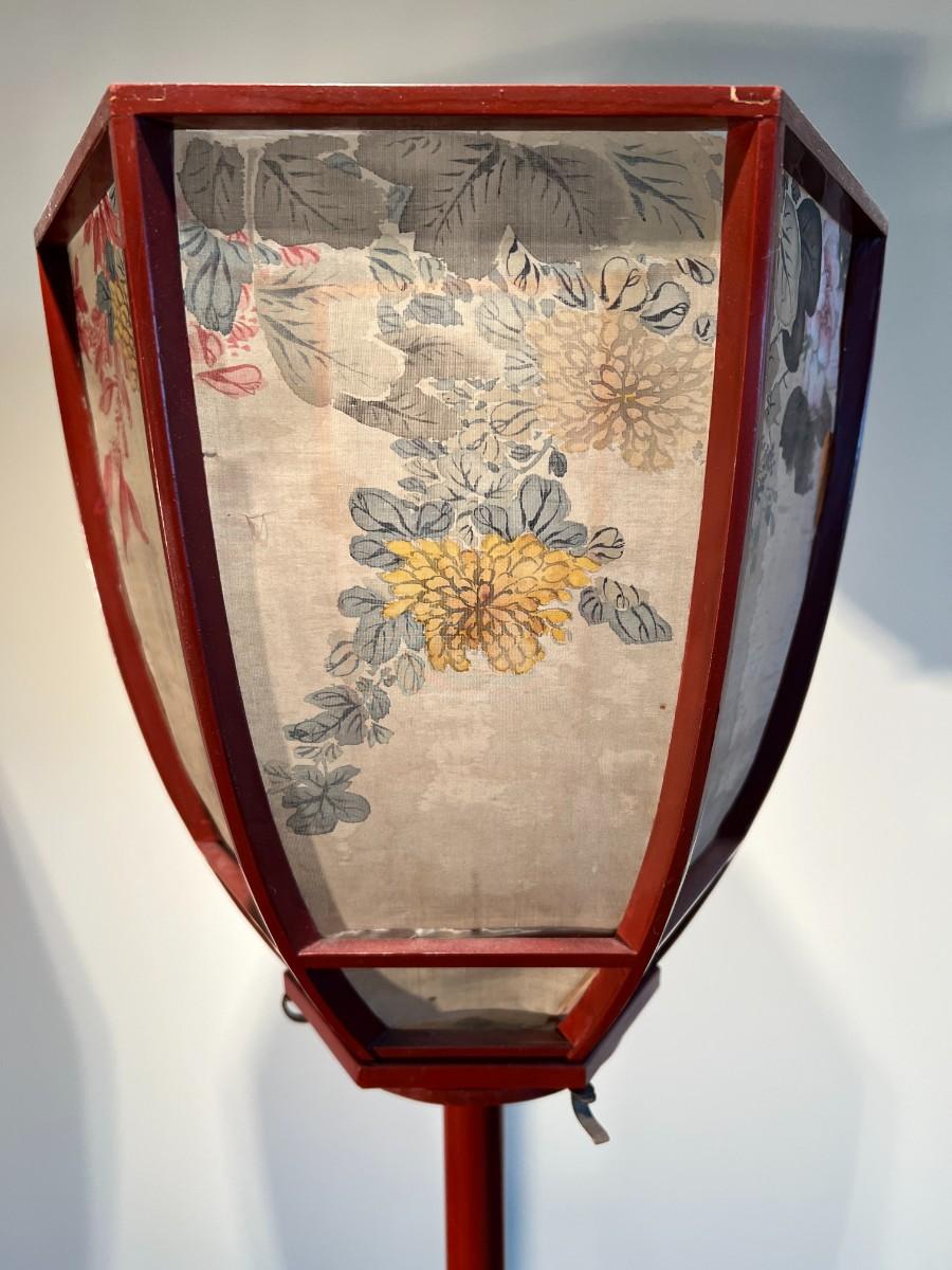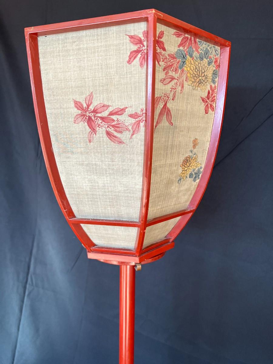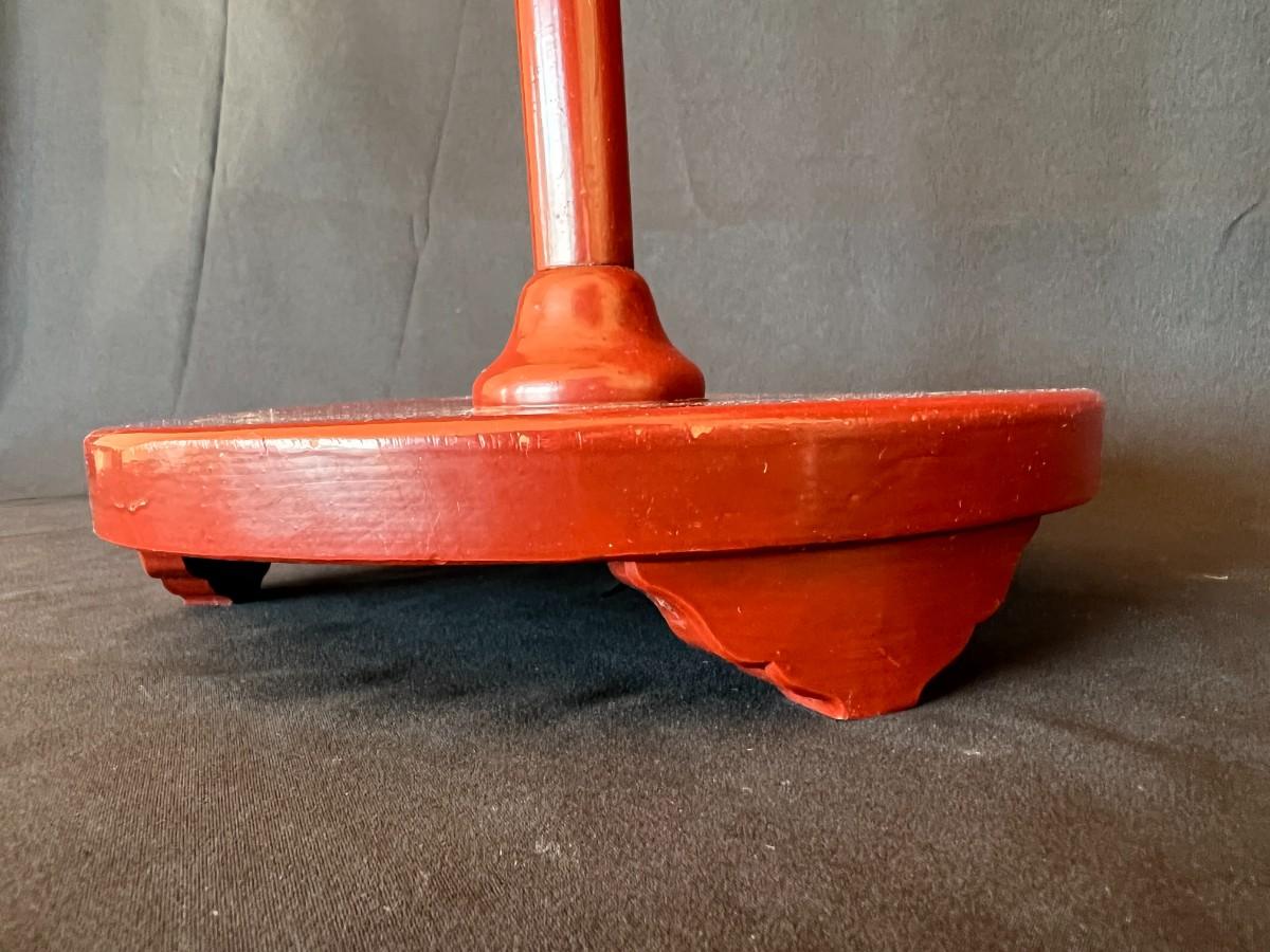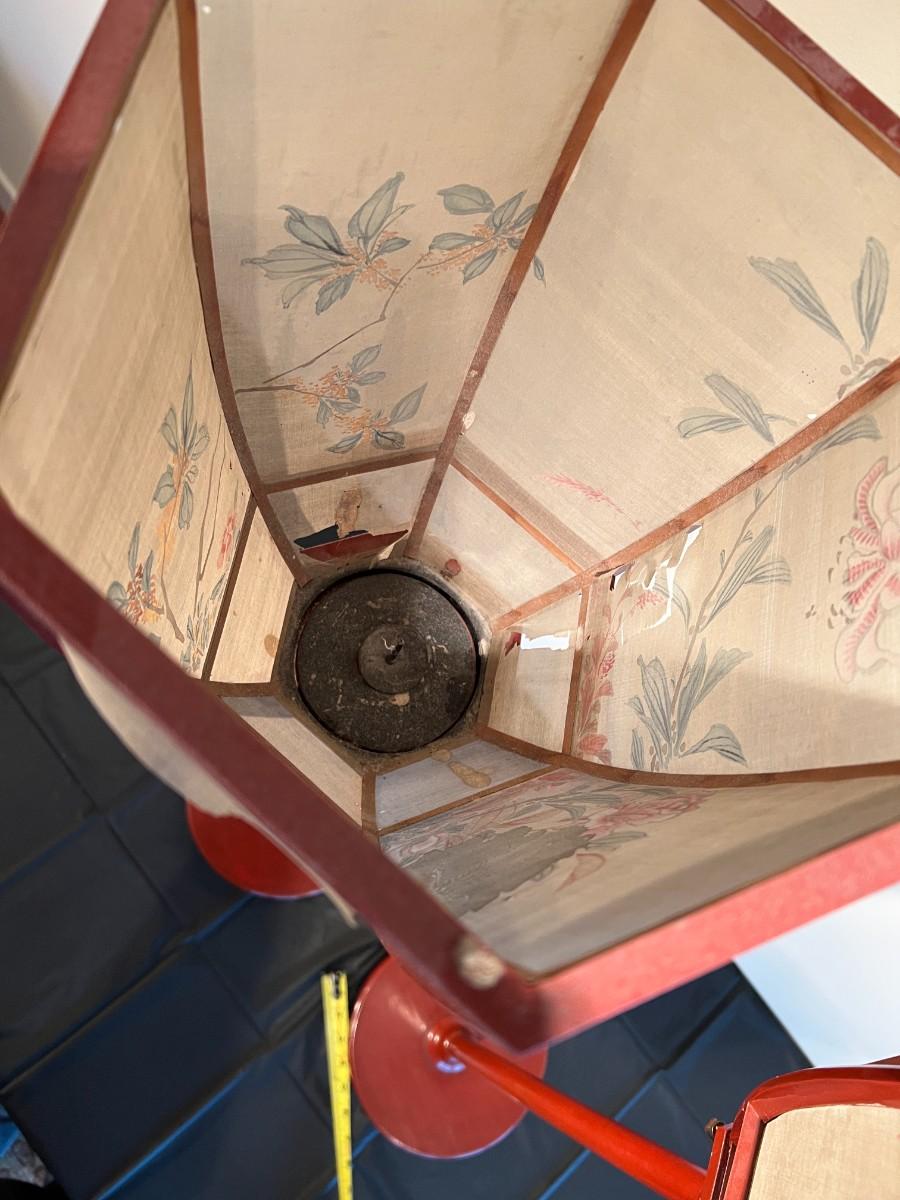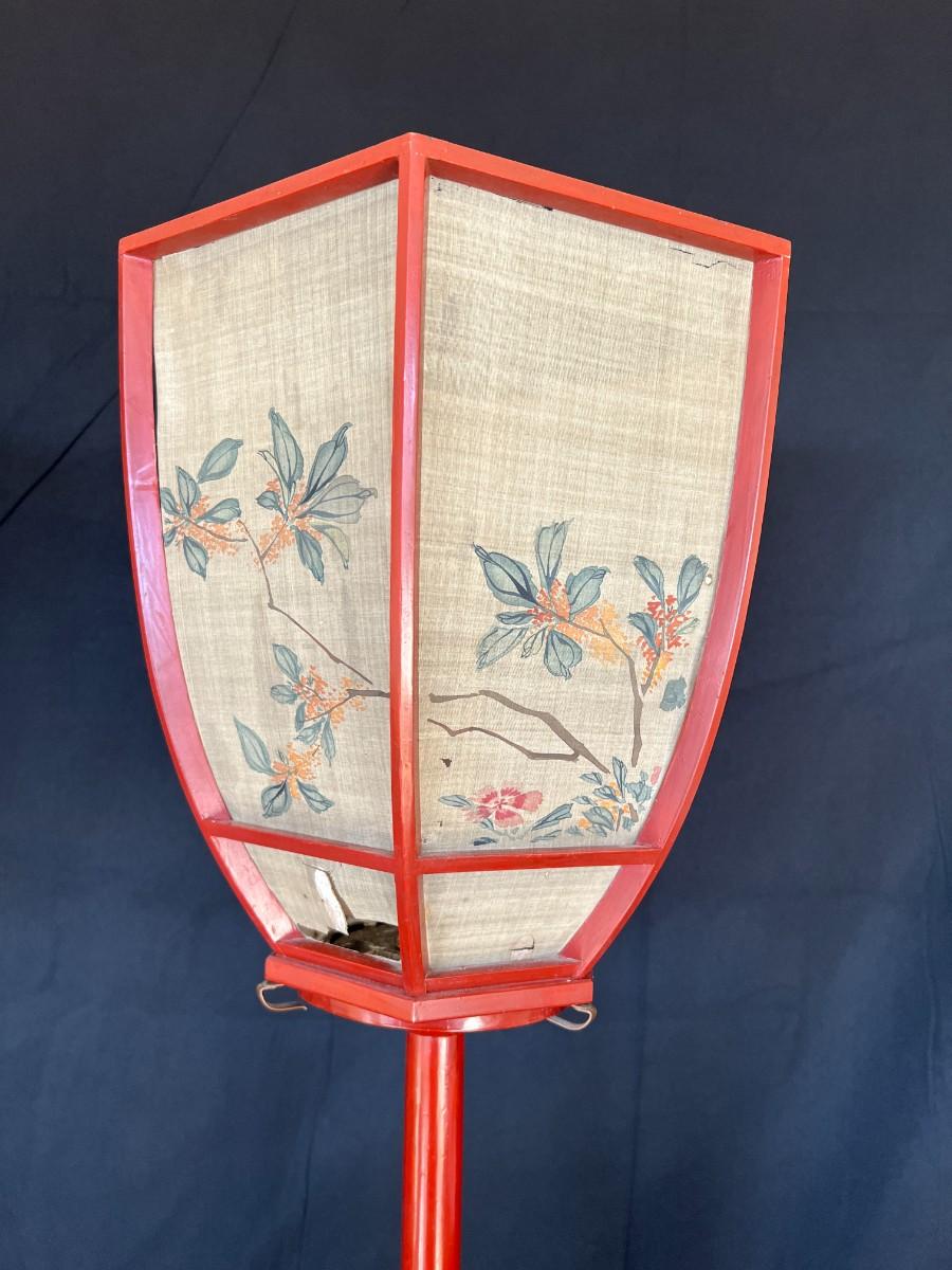Pair of 19th Century Japanese Red Lacquer Candlesticks with Painted Silk Lamp Housing