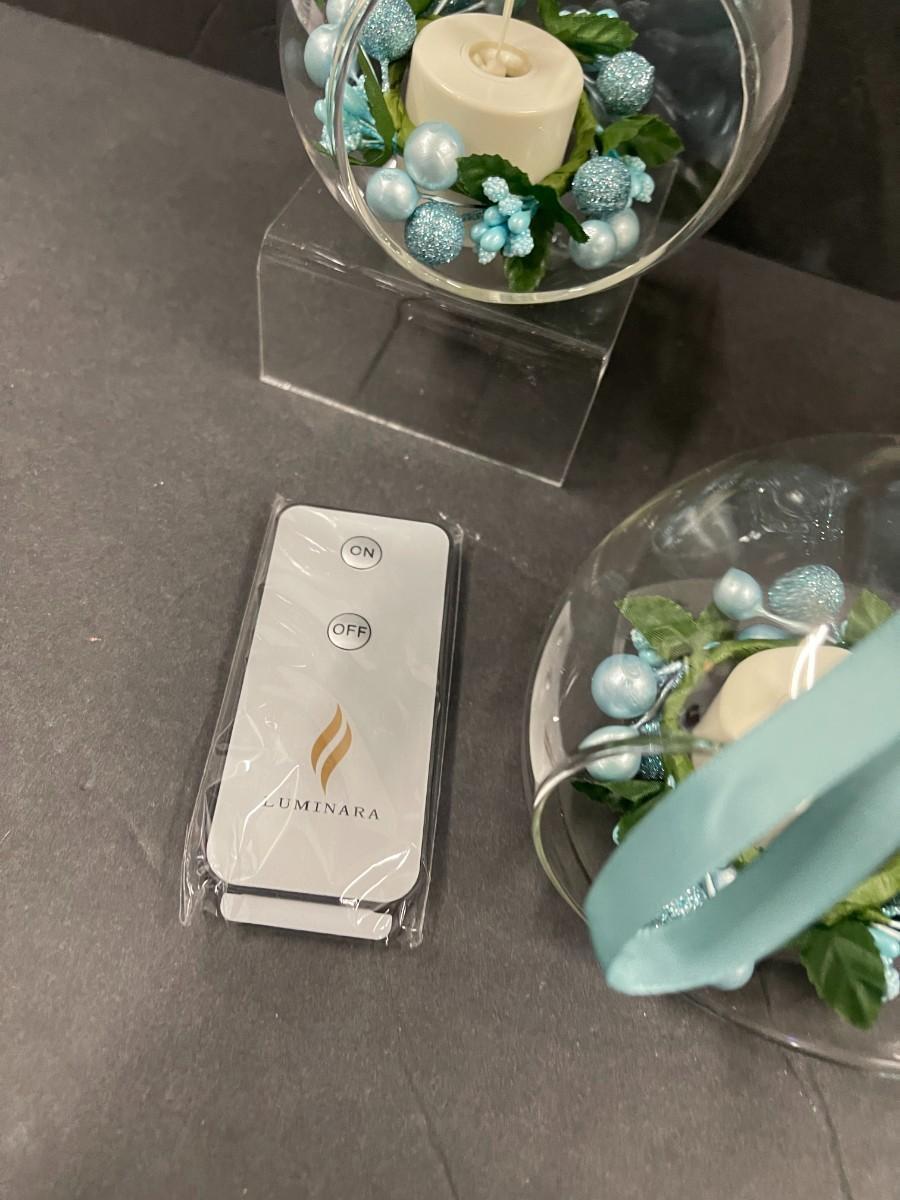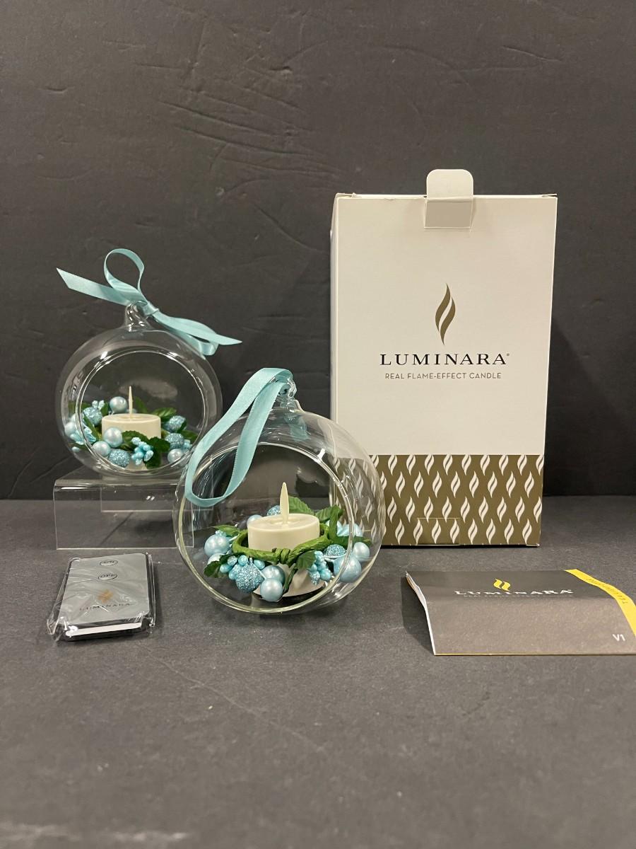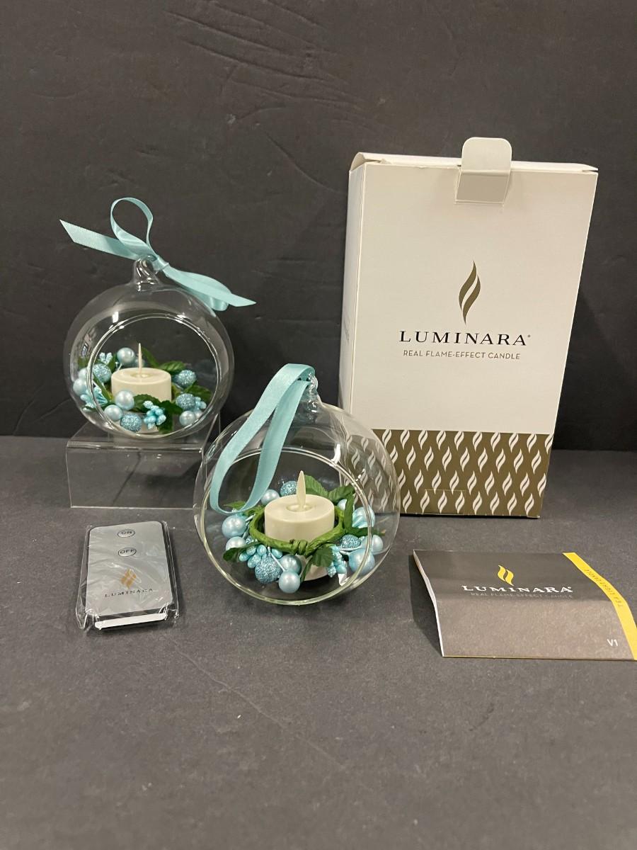 Luminara Gold Berry ornament candles with real flame effect. One is in original box with new batteries and remote. The other does not have new batteries. Remote control will operate both.