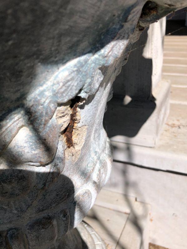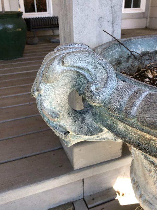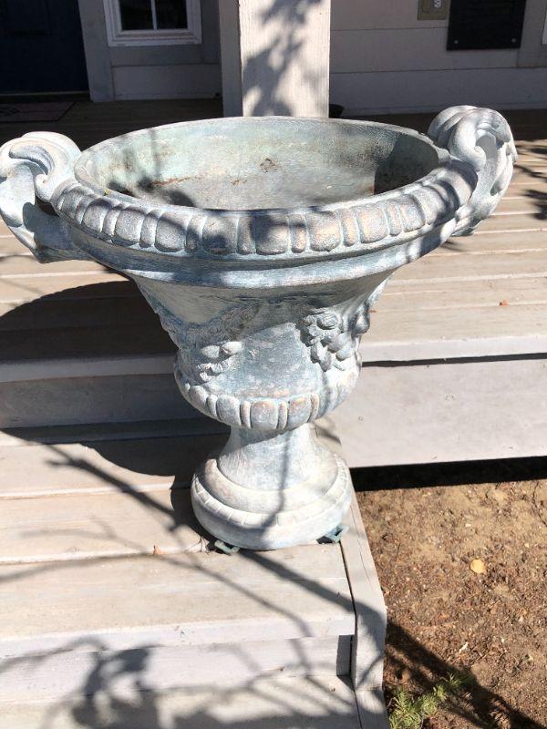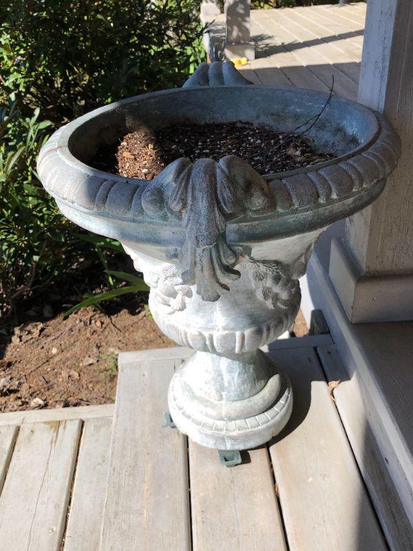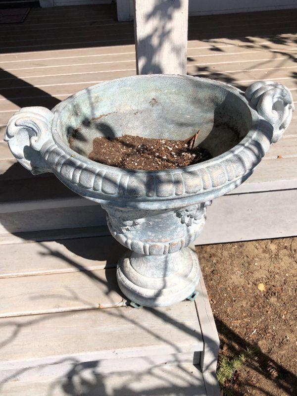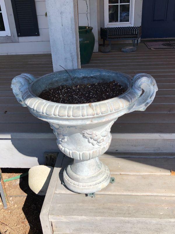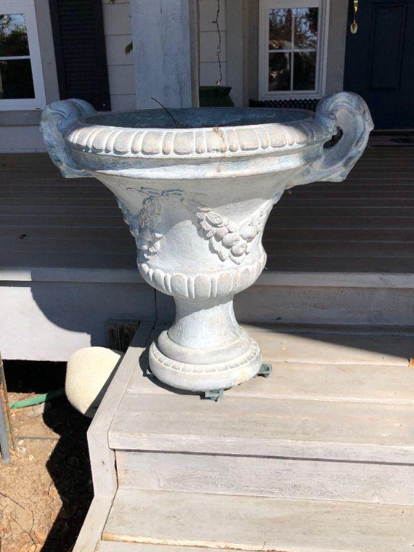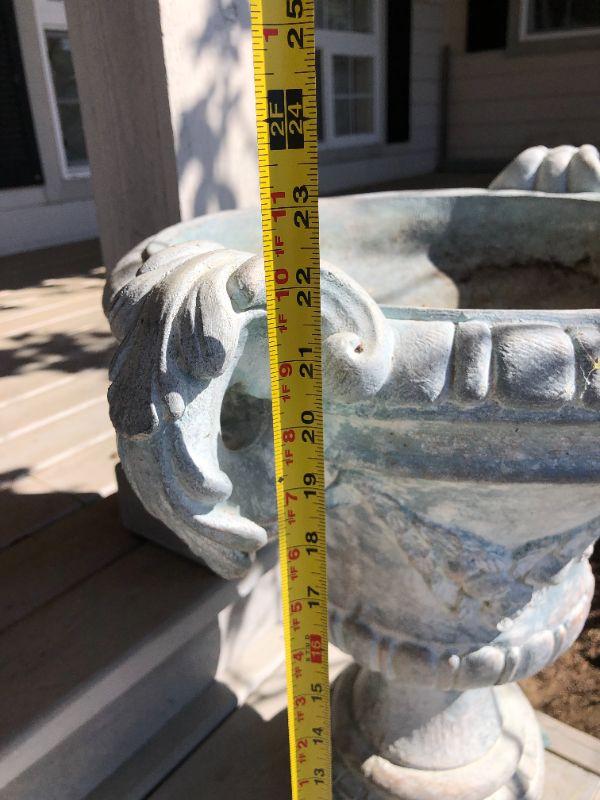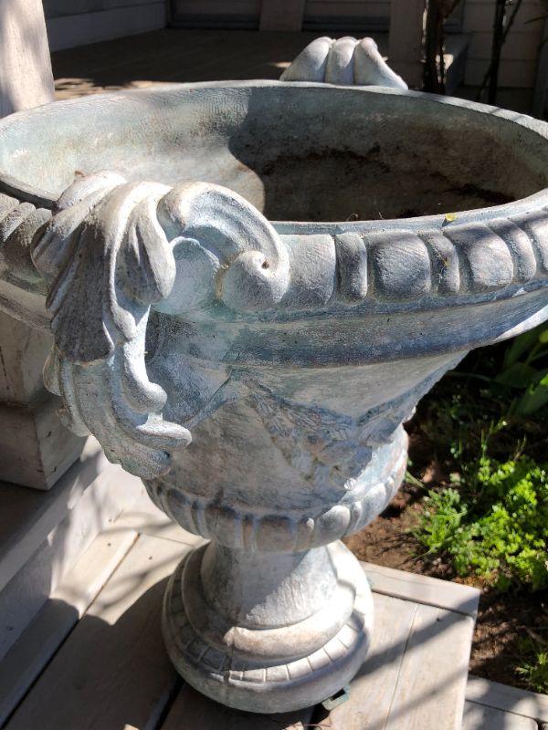 Pair of two matching classic white cement planters. European style. In good condition, with some small damage to one (shown in photo).