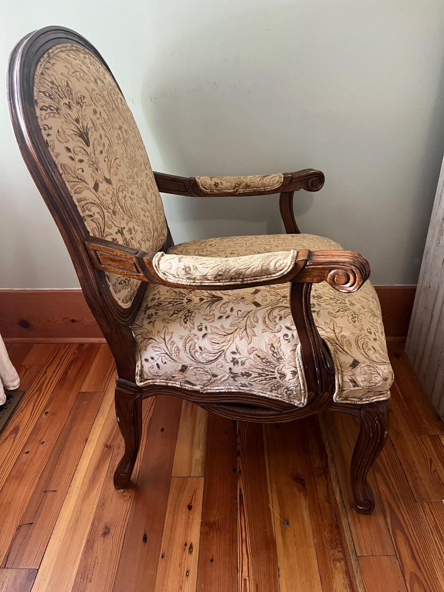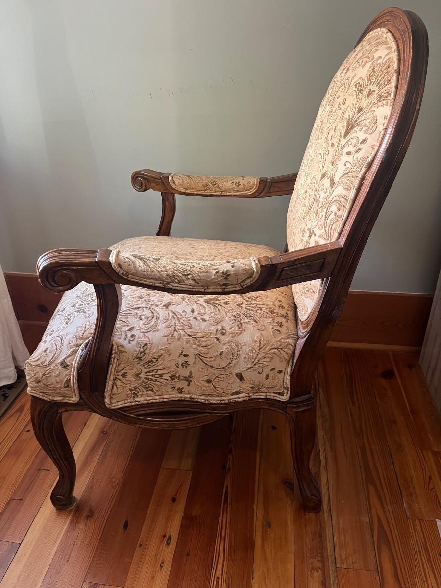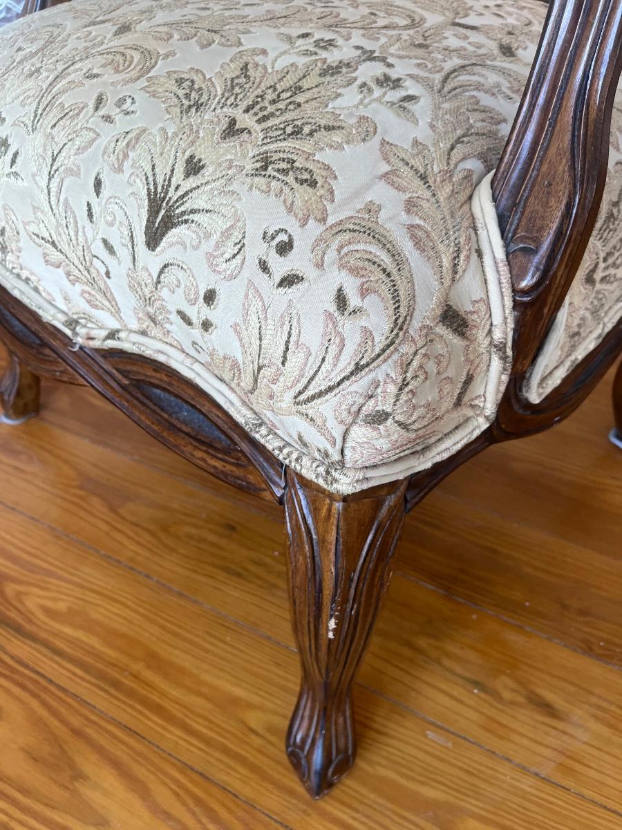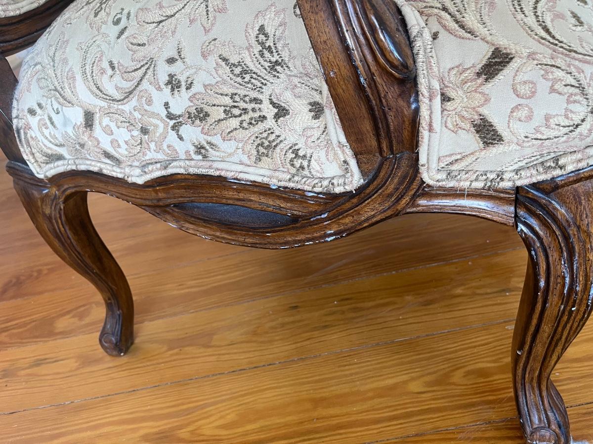 Pair of 20th C. upholstered armchairs; approx. 20" (seat) x 27" x 27", 42" H back; wear and losses to legs from use