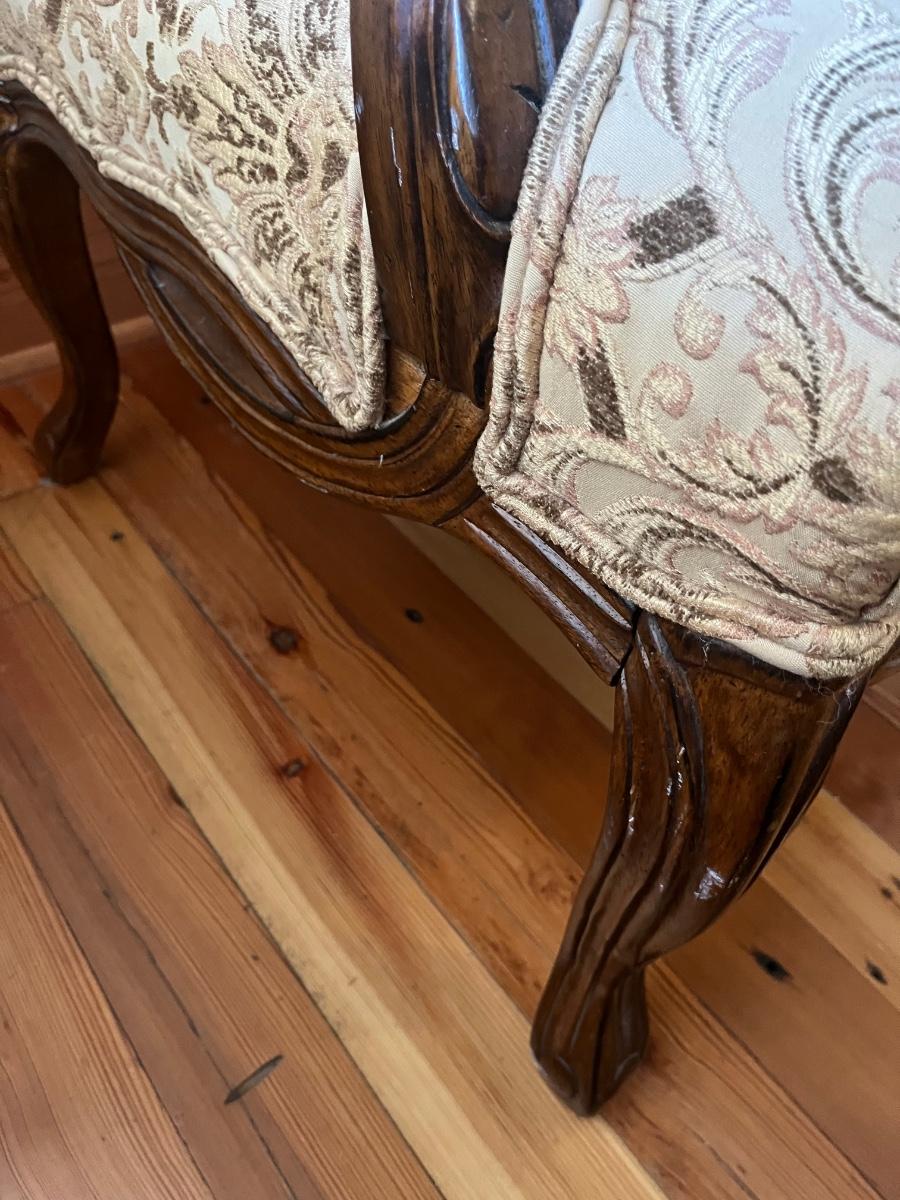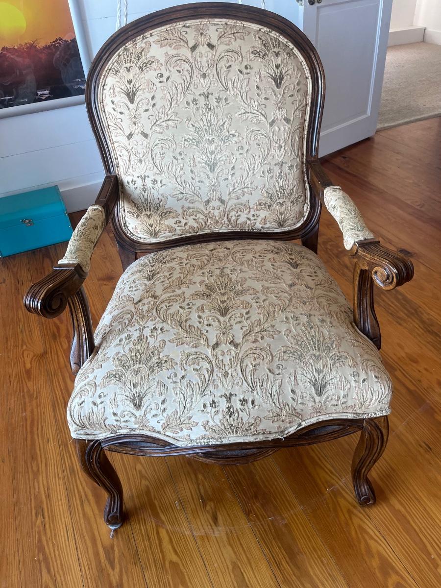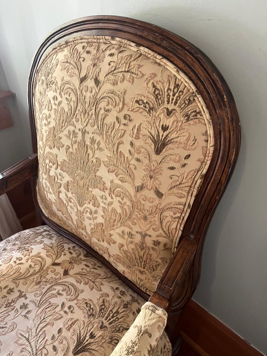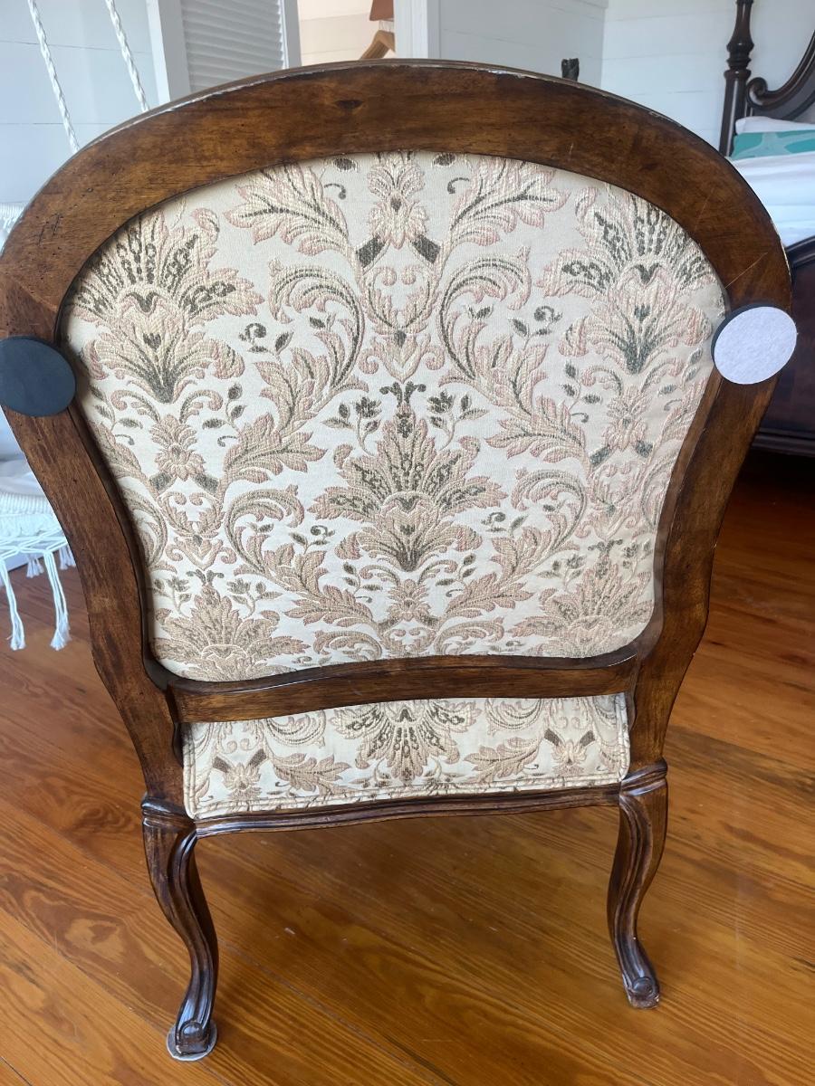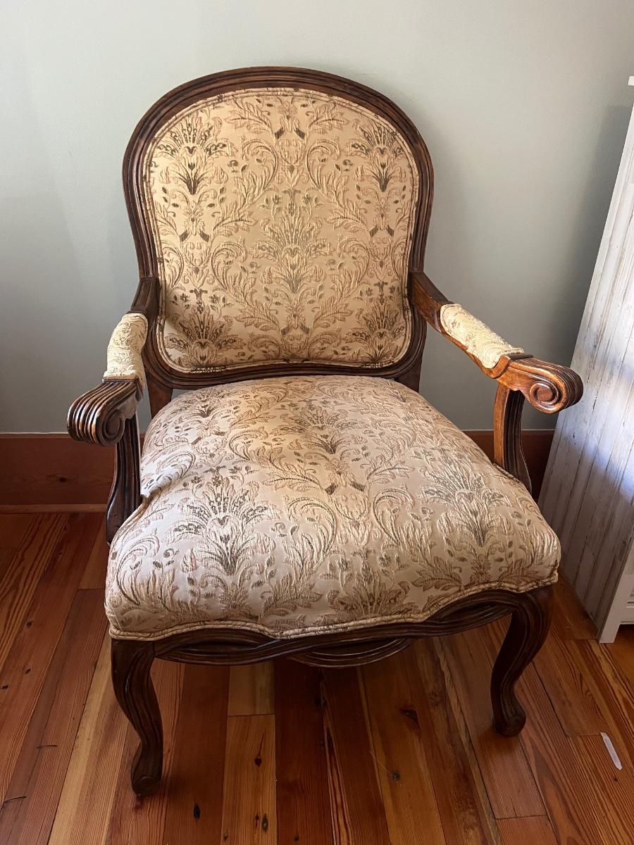 Pair of 20th C. upholstered armchairs; approx. 20" (seat) x 27" x 27", 42" H back; wear and losses to legs from use