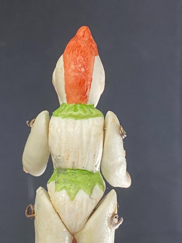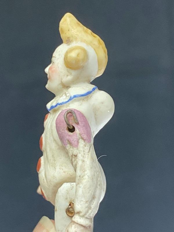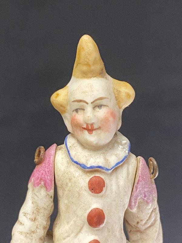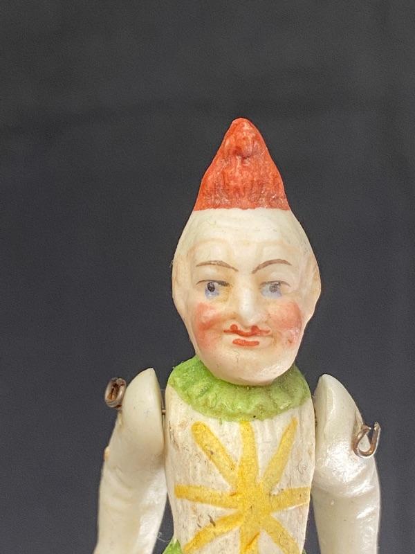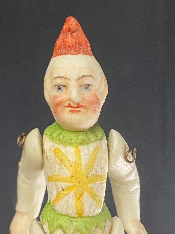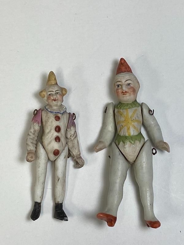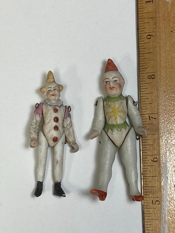 Pair of antique bisque jointed clown dollhouse dolls. One is 3" and the other 3.5". Both in good antique condition, paint looks good. The larger looks to be missing the tip of his right hand. Display great.