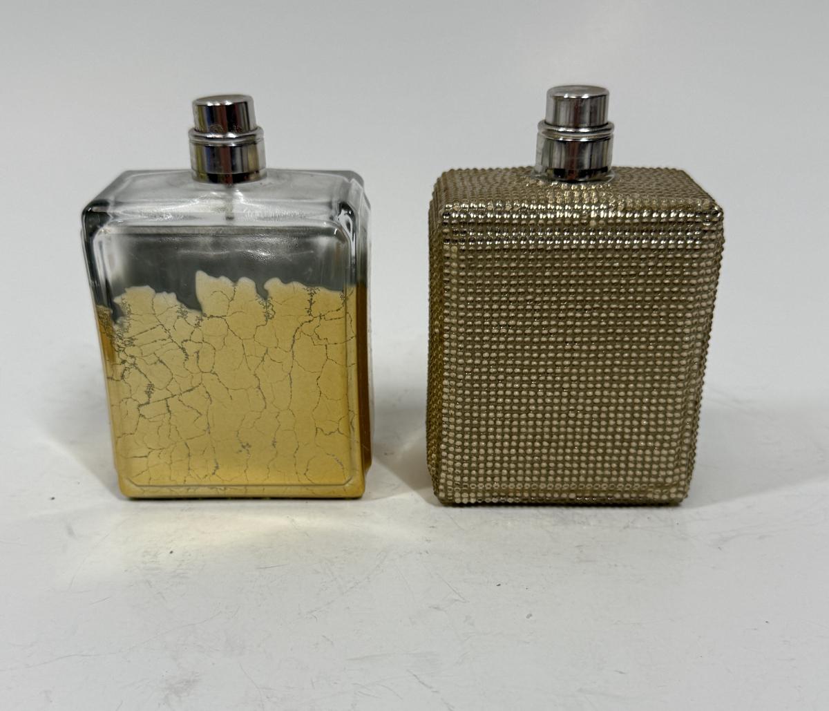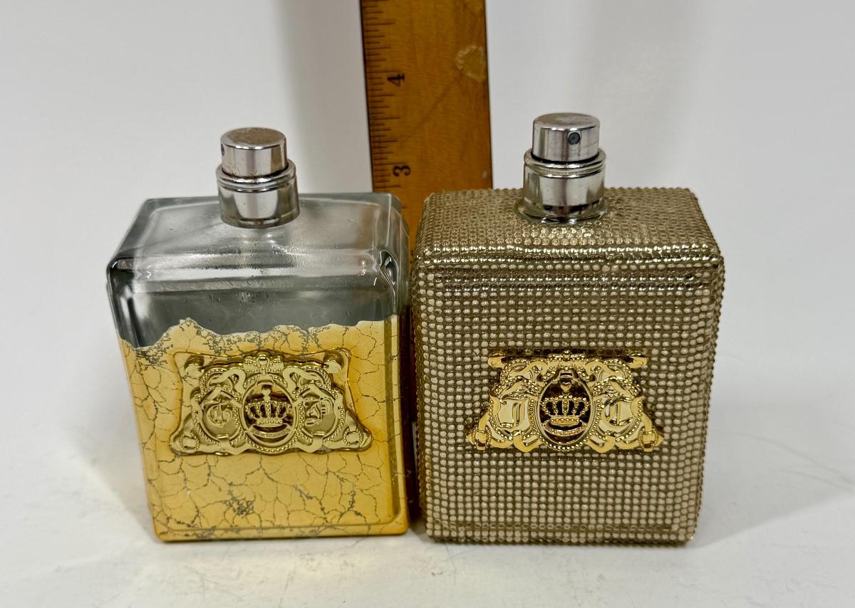 Viva La Juicy Limited Edition 3.4oz Parfum Spray with gold beaded glass bottle (still contains some perfume), and another Viva La Juicy Limited Edition 3.4oz Parfum Spray with gold gilt glass bottle (worn/crackled finish), that one appears to be empty.