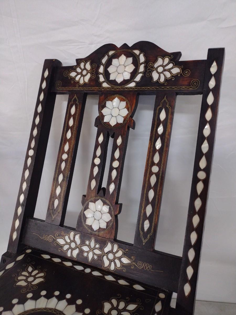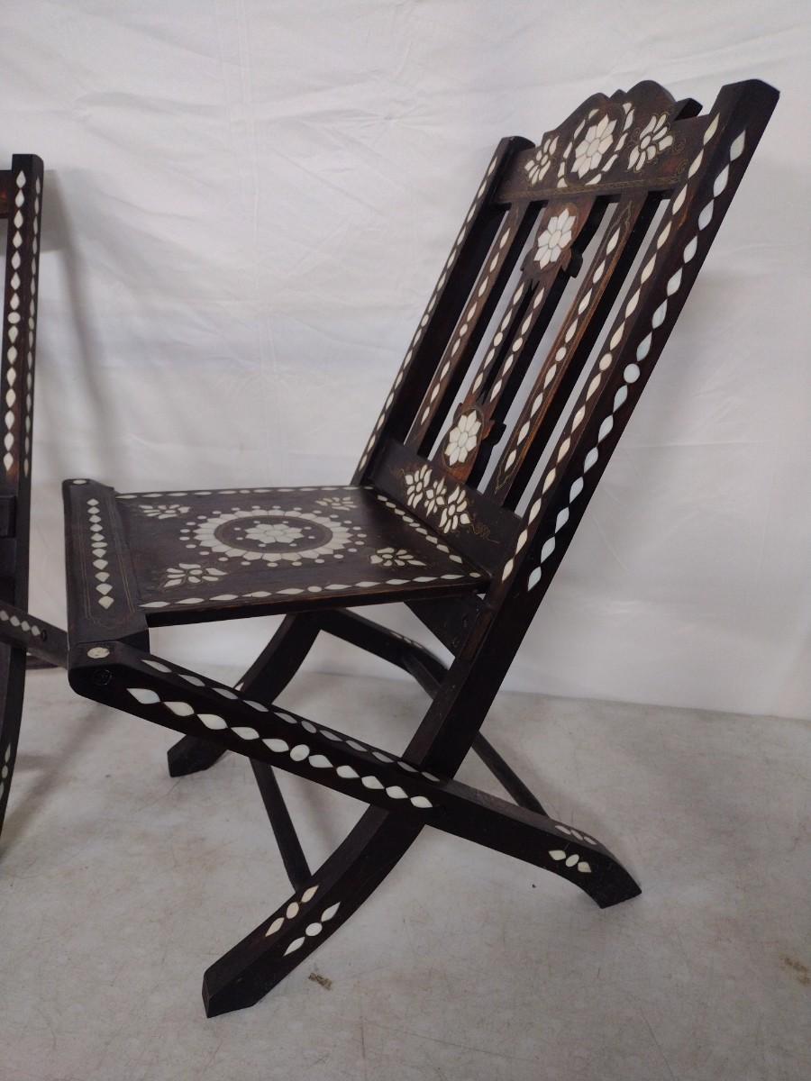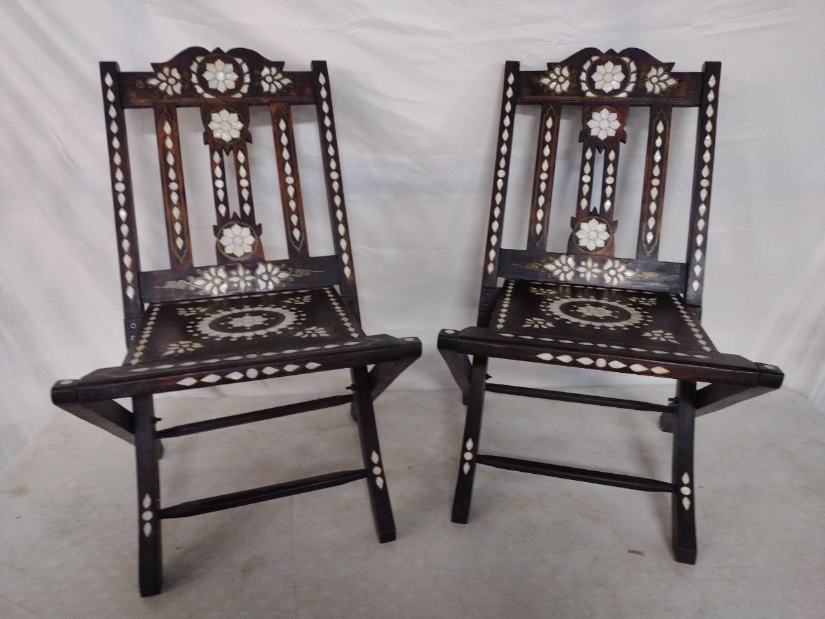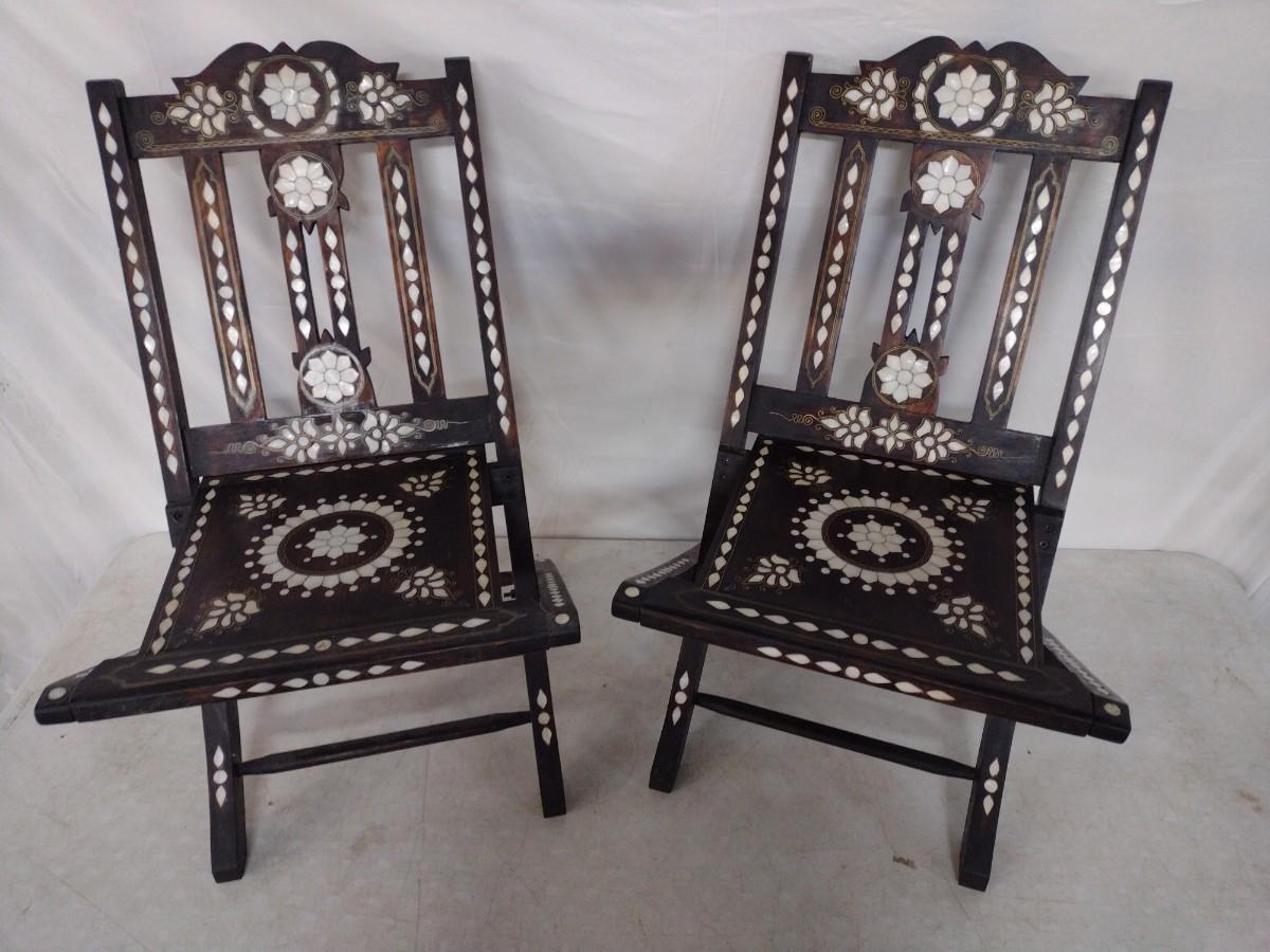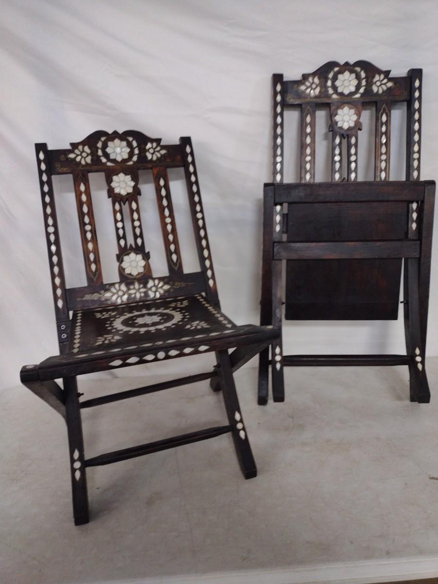 Pair of Egyptian Mahogany Finish Mother of Pearl Inlay Folding Chairs Lotus Flower Theme Design Accents