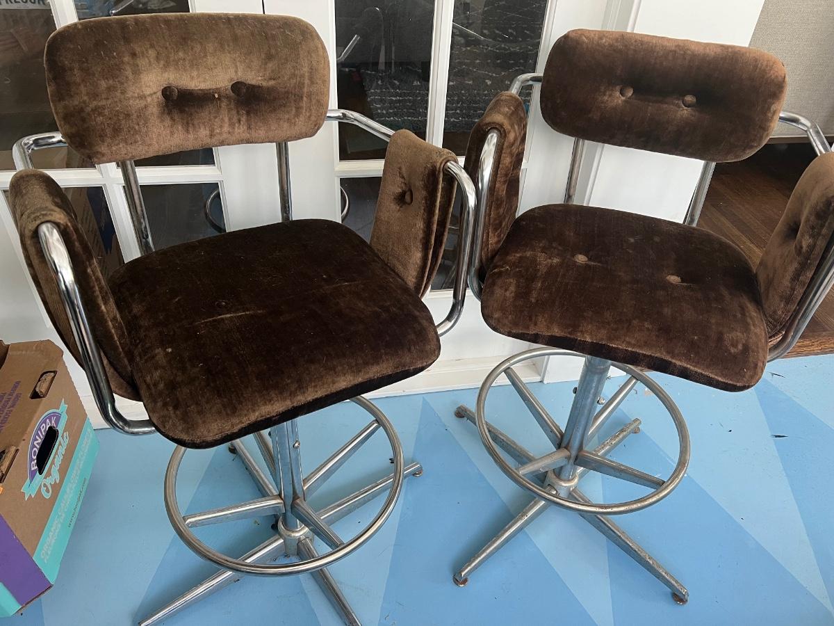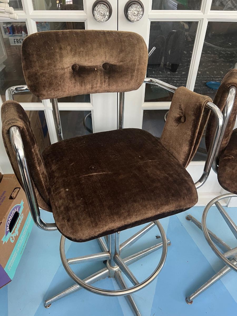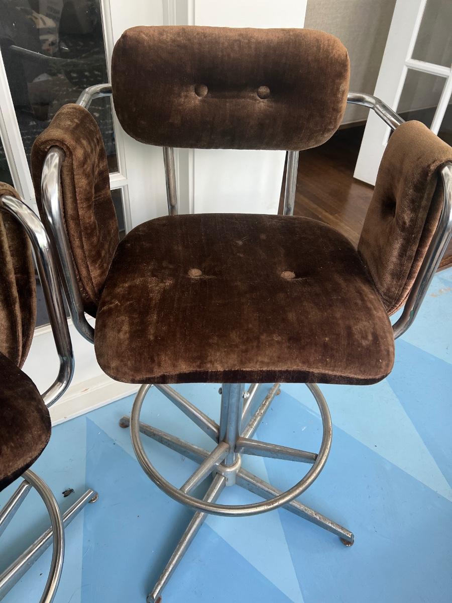 Pair of Adjustable Brown Velour Upholstered Chrome Bar Stools
