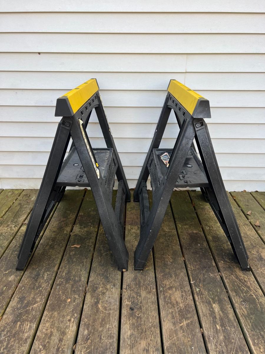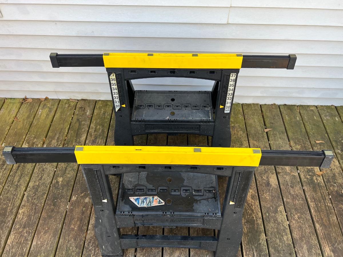 Plastic saw horses. Very solid. Tops extend out as pictured and height can adjust from 31” to 37”.