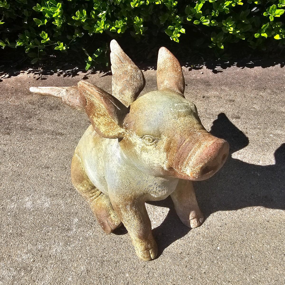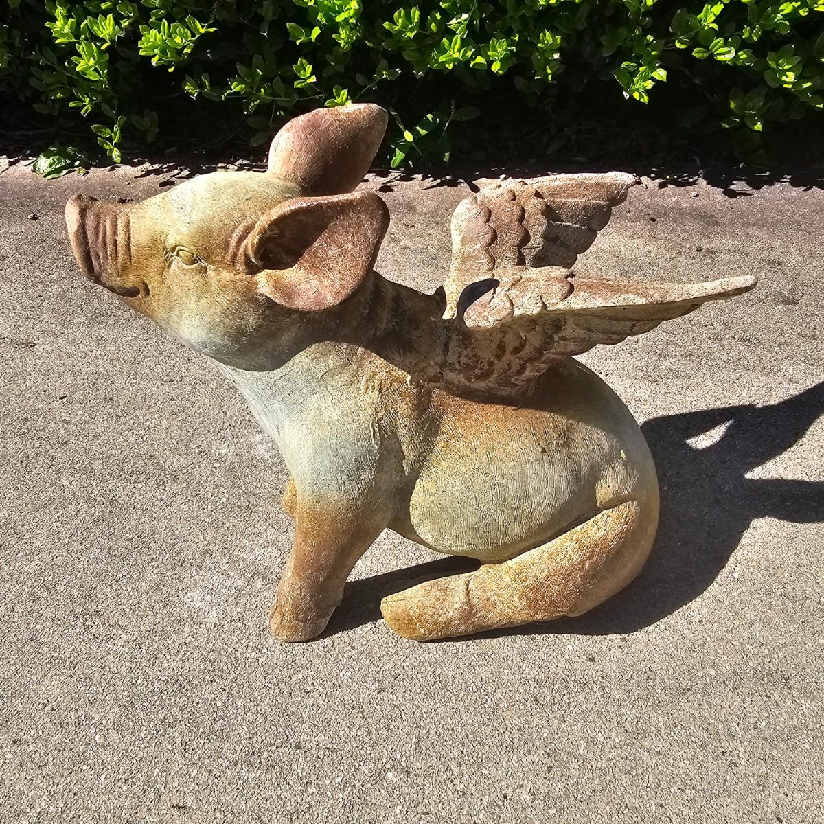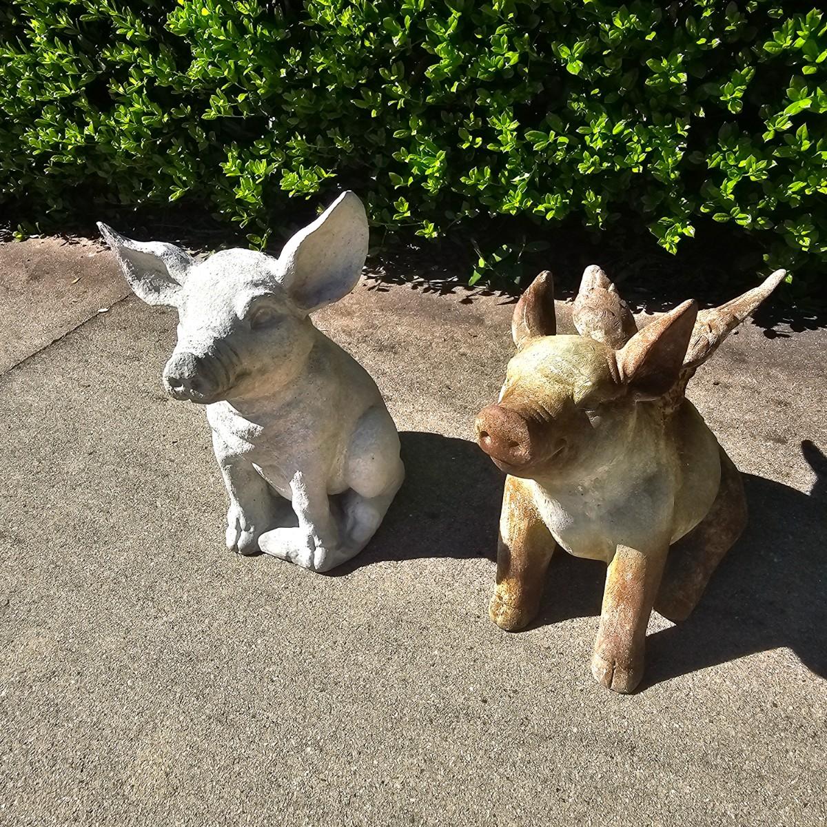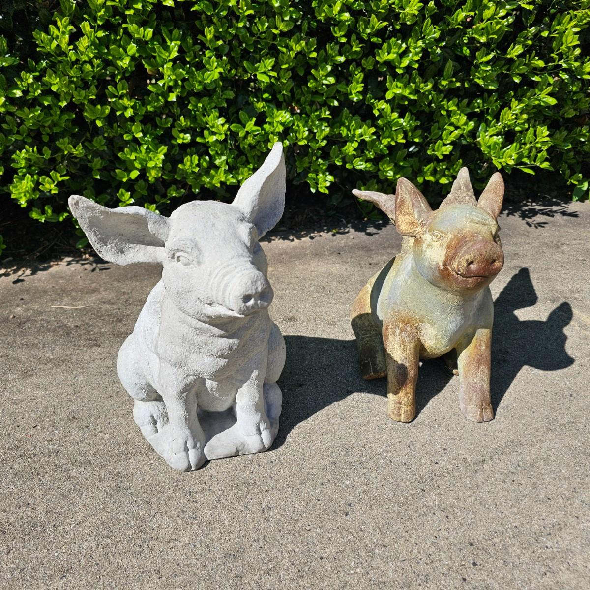 Two whimsical cute pigs to decorate your yard or home. Grey pig is concrete, measures 8.5" x 12" x 13.5"H. Pig with wings is resin or fiberglass, measures 8.5" x 12" x 13.5"H. Some wear on both, see photos for details. Local pickup only.
