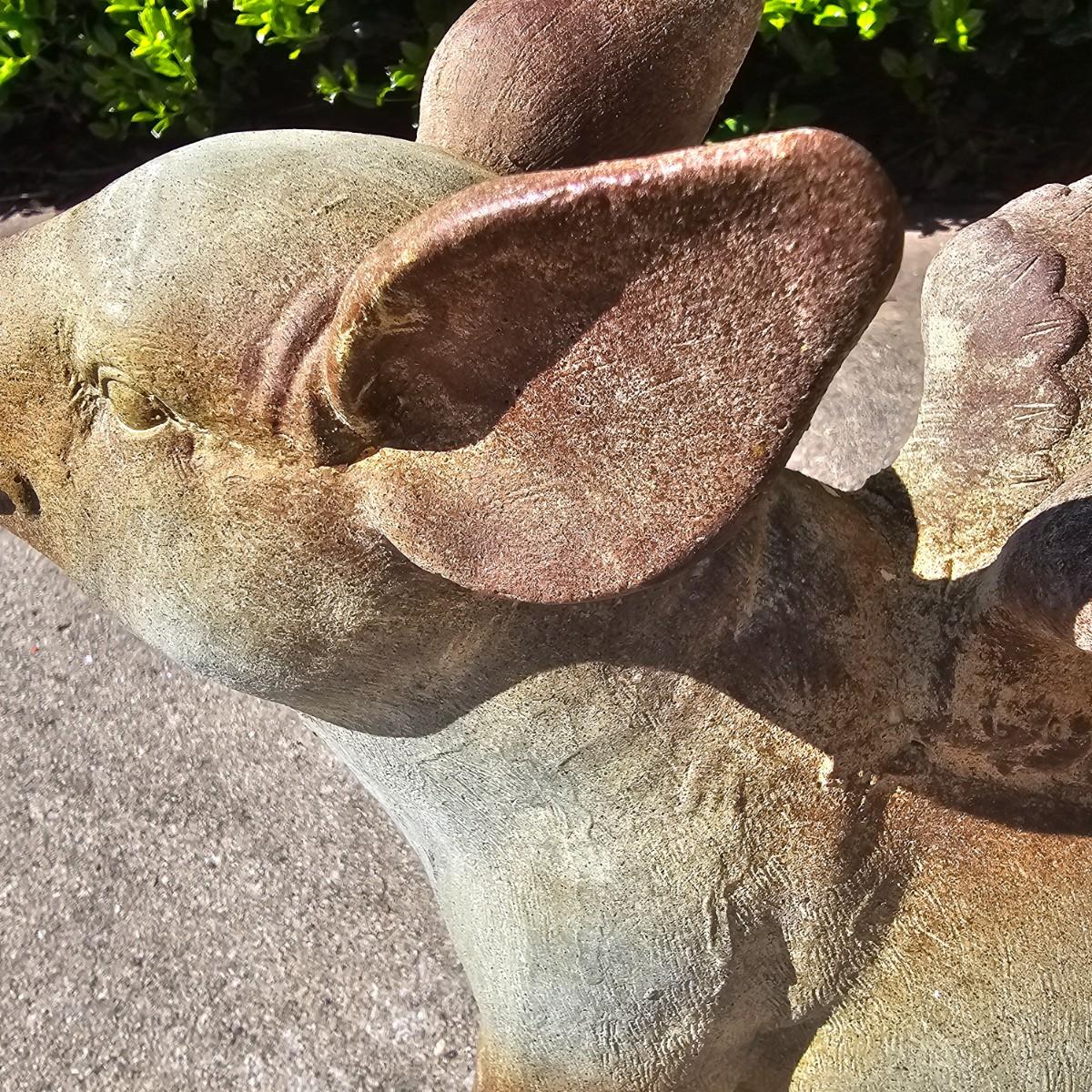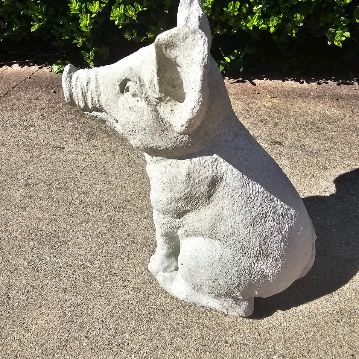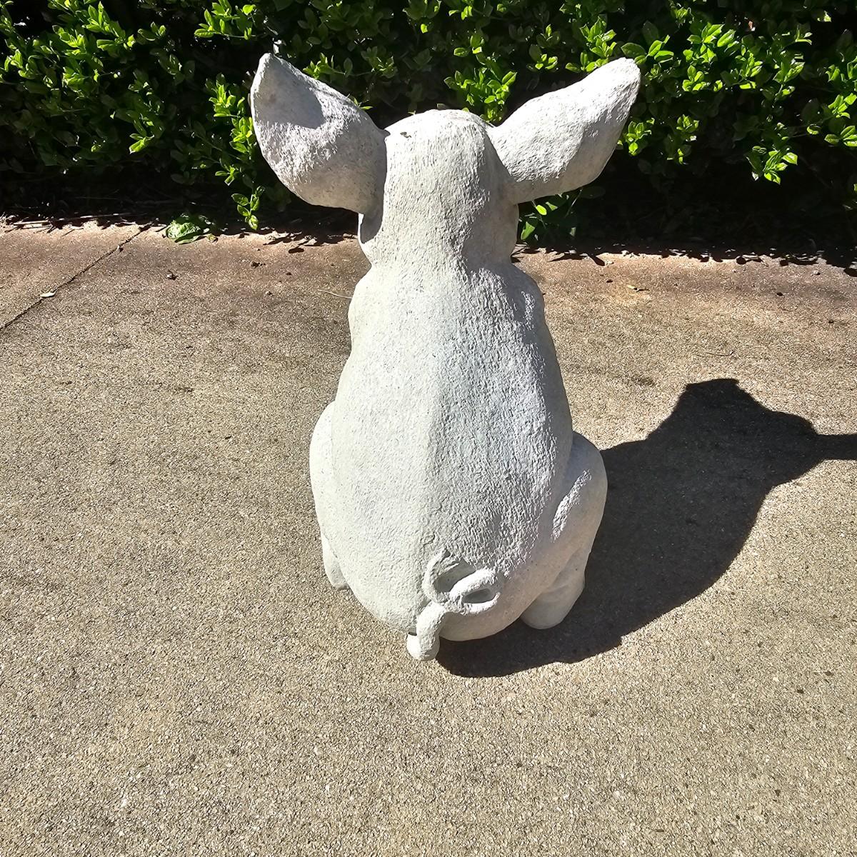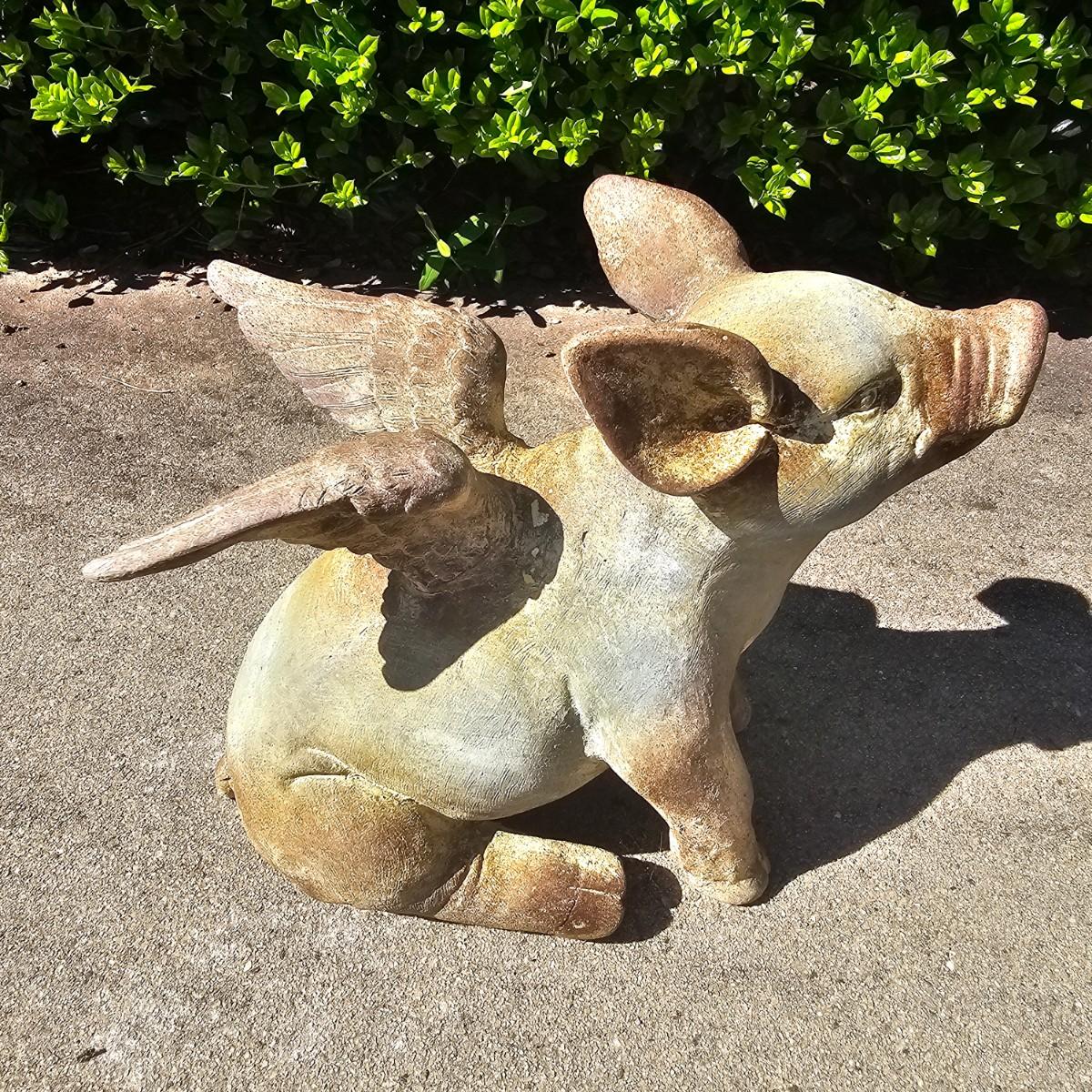 Two whimsical cute pigs to decorate your yard or home. Grey pig is concrete, measures 8.5" x 12" x 13.5"H. Pig with wings is resin or fiberglass, measures 8.5" x 12" x 13.5"H. Some wear on both, see photos for details. Local pickup only.