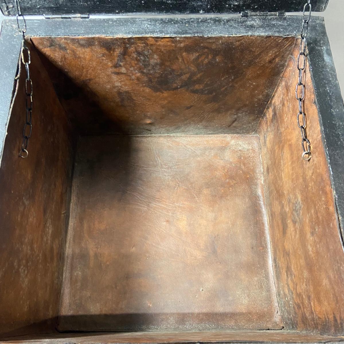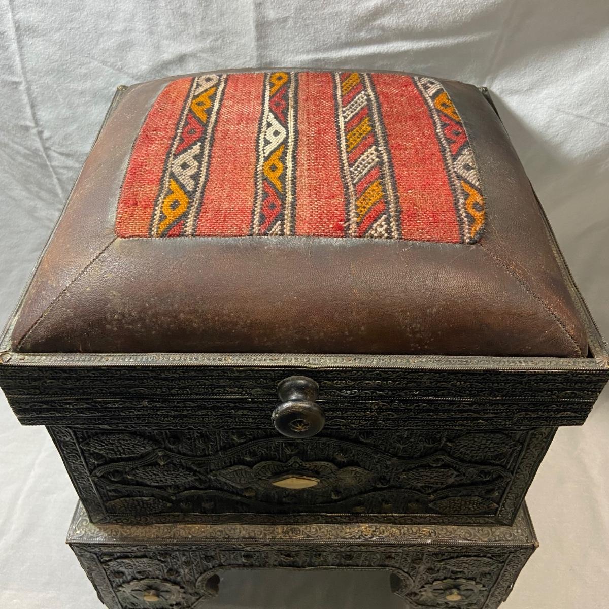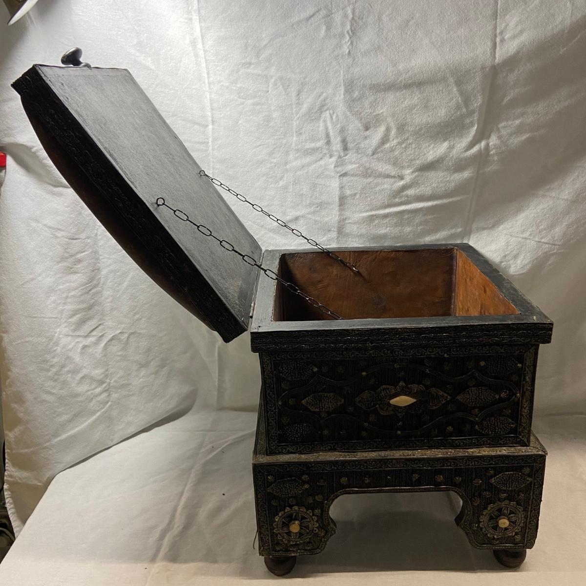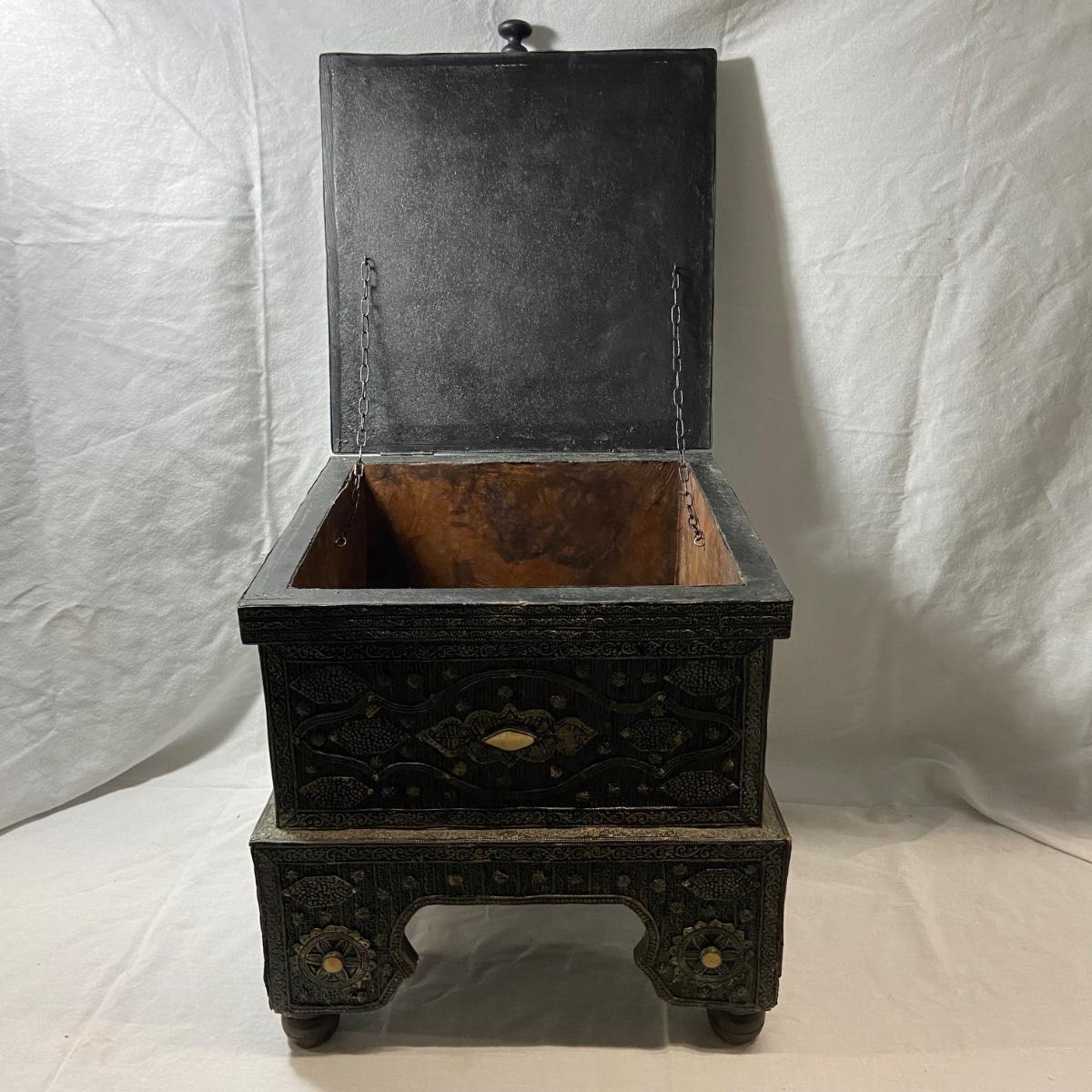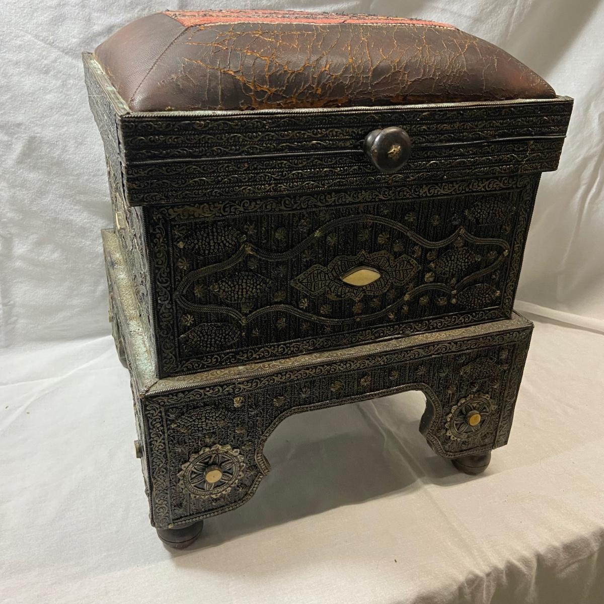This lot is a pair of beautifully crafted embossed small chests. The base of the chests seem to be wood and they both have a decorative metal exterior. Again, both chests are clad in elaborate hand-tooled metal with bone medallions on Moorish arched legs over turned wood feet. There is some wear on the leather seats. Both chests are bejeweled with ivory colored decorative stones. They both measure 15” x 15” x 18”H. Local pick up only.