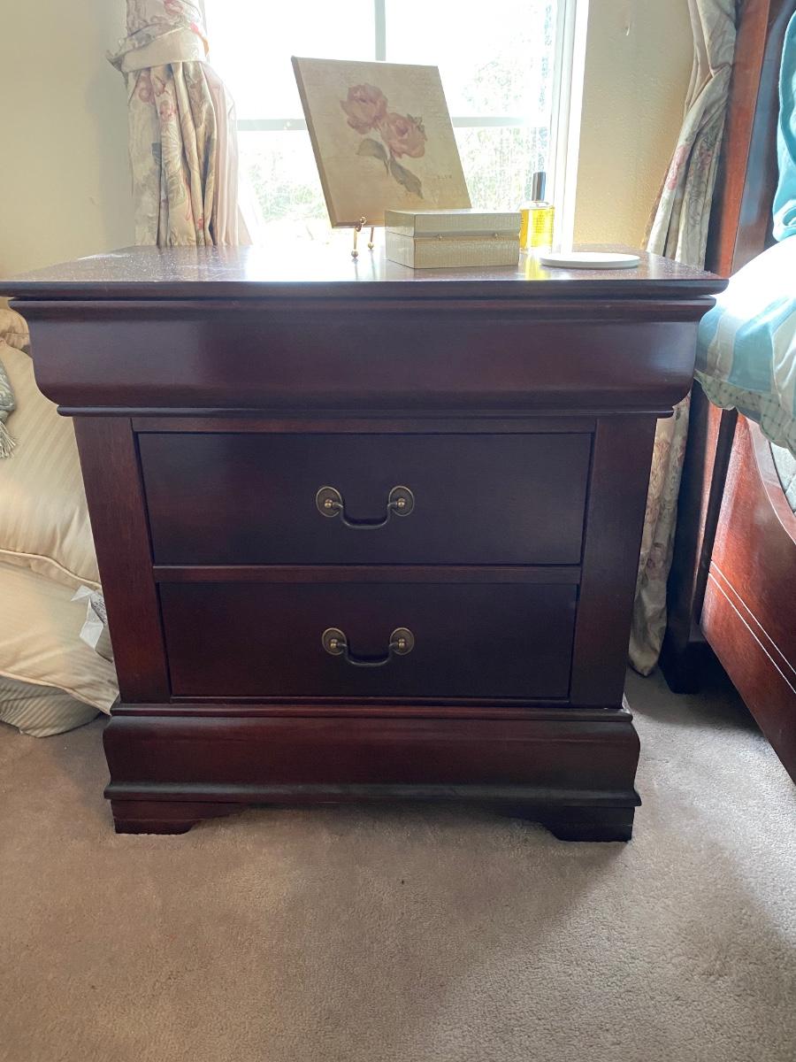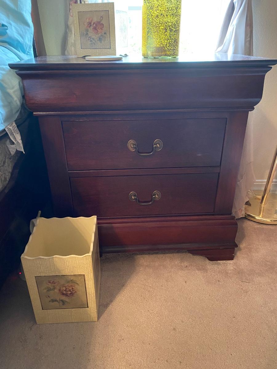 Pair of all-wood nightstands, classic styling, dovetail drawers with velvet lined top drawers. In excellent condition