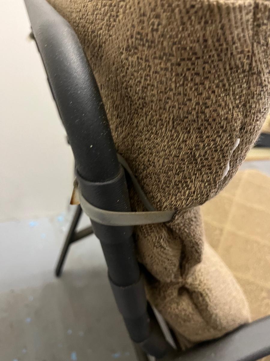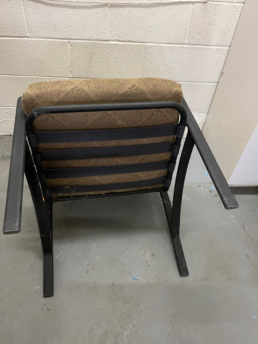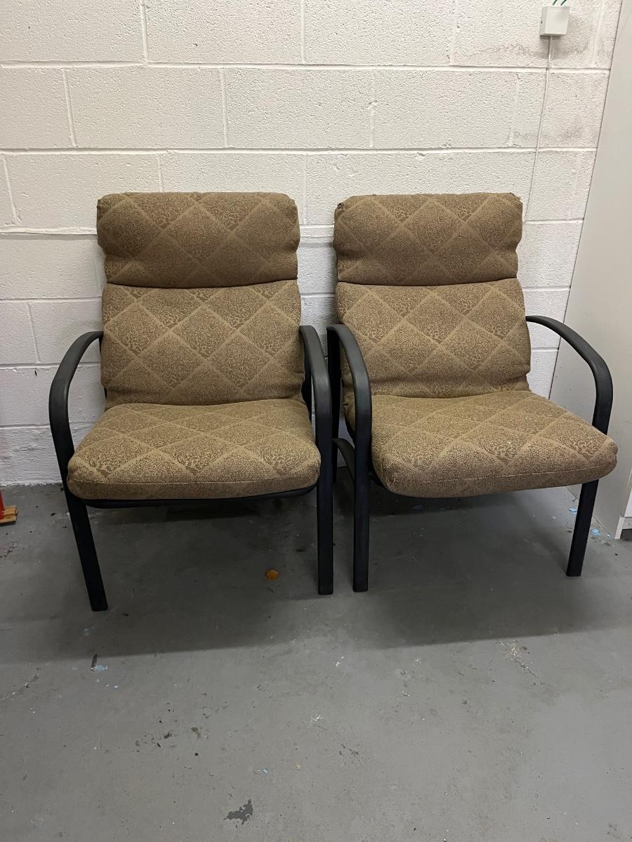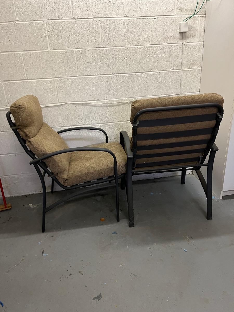 Lot includes two aluminum patio chairs with removable cushions. Chairs measure 24” x 33” x 36” with a seat height of 19”.