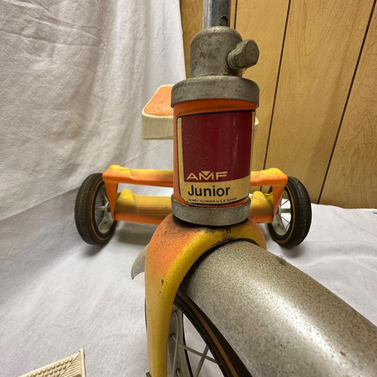 Pair of AMF Junior tricycles. Both measure 23” c 19.5” x 22.5”H. Seat height is 12” and handlebar height is 22.5”.