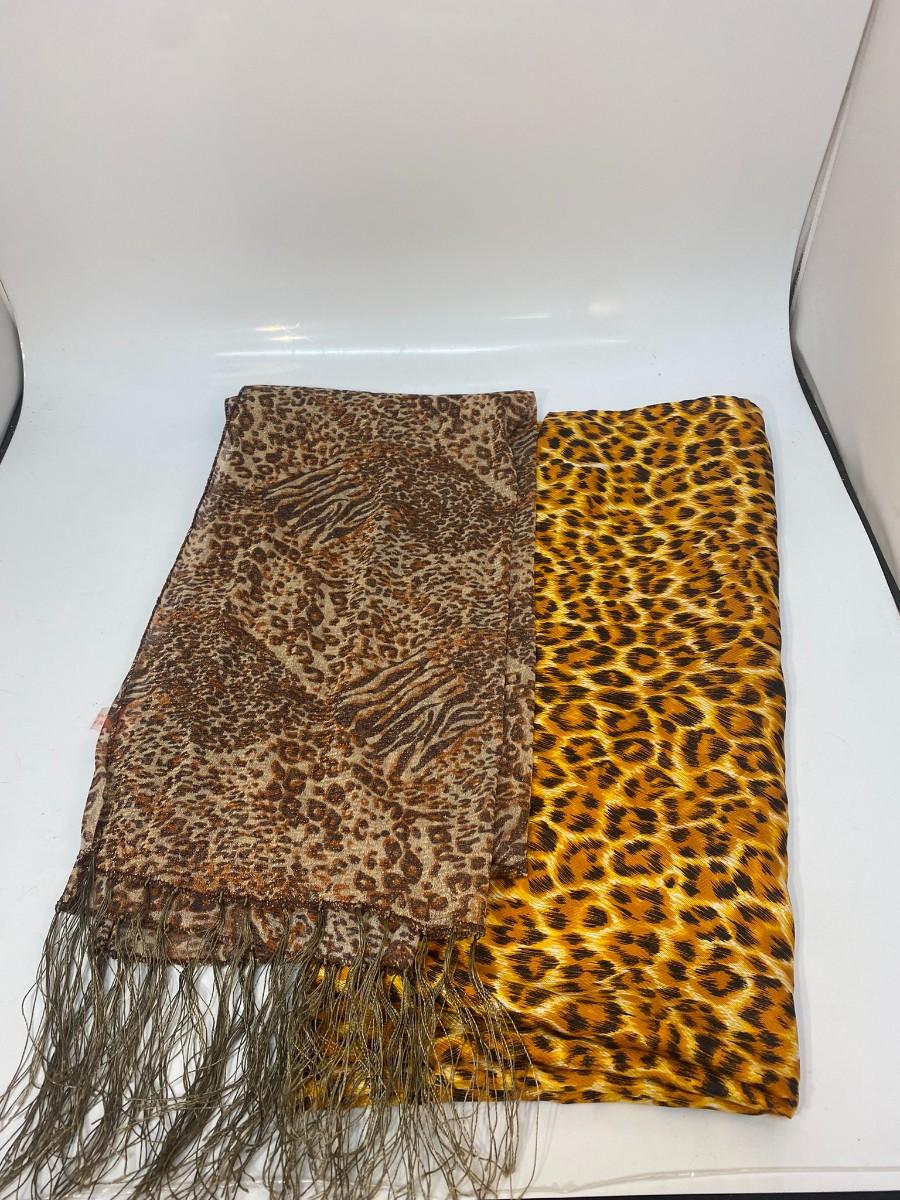 Pair of Animal Leopard Print Scarves. One long with fringe, the other is square. Good condition.