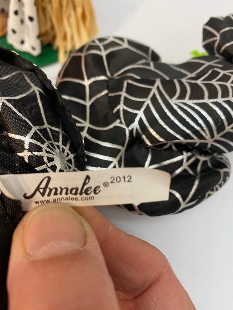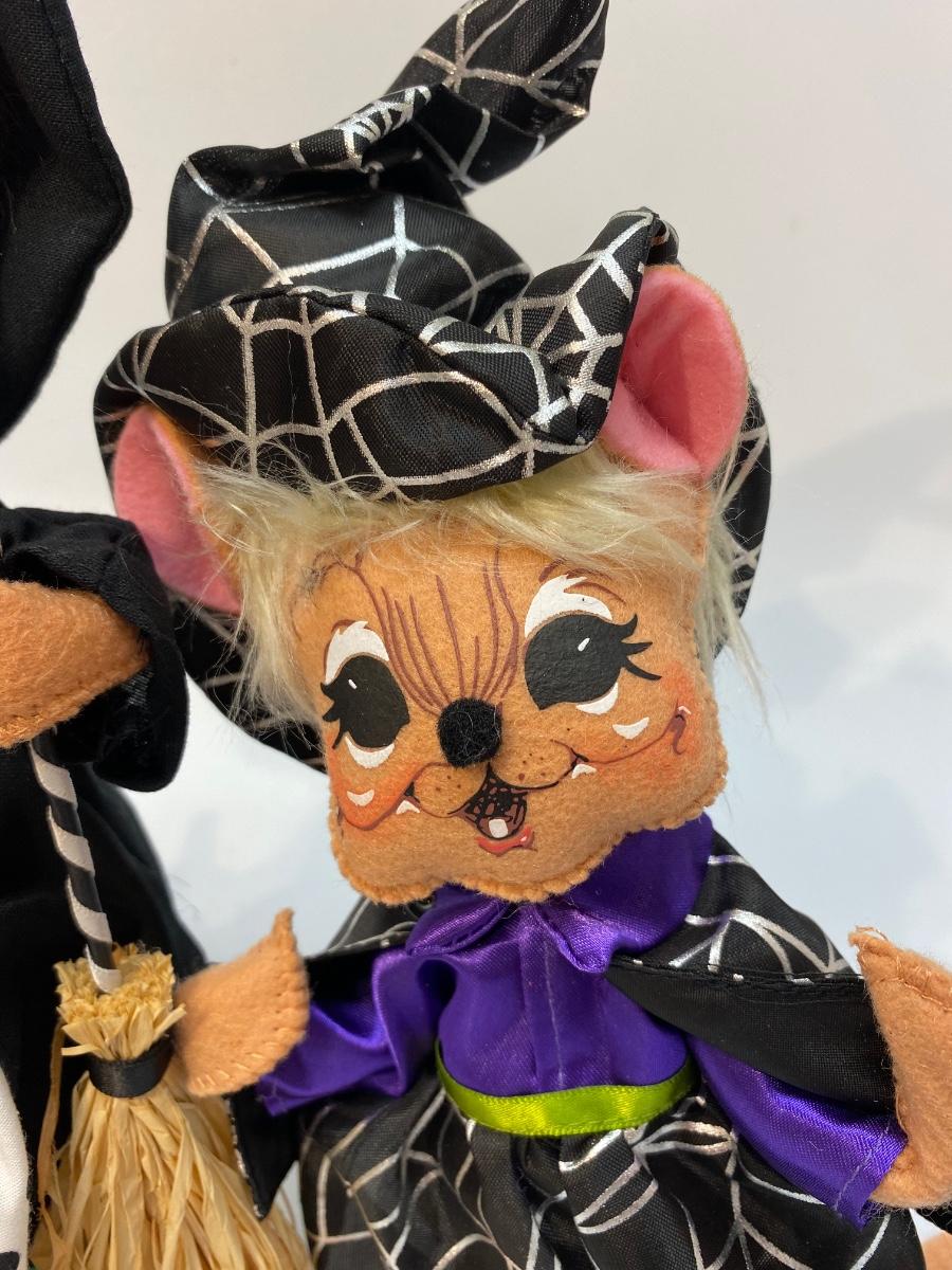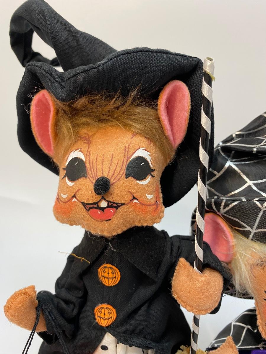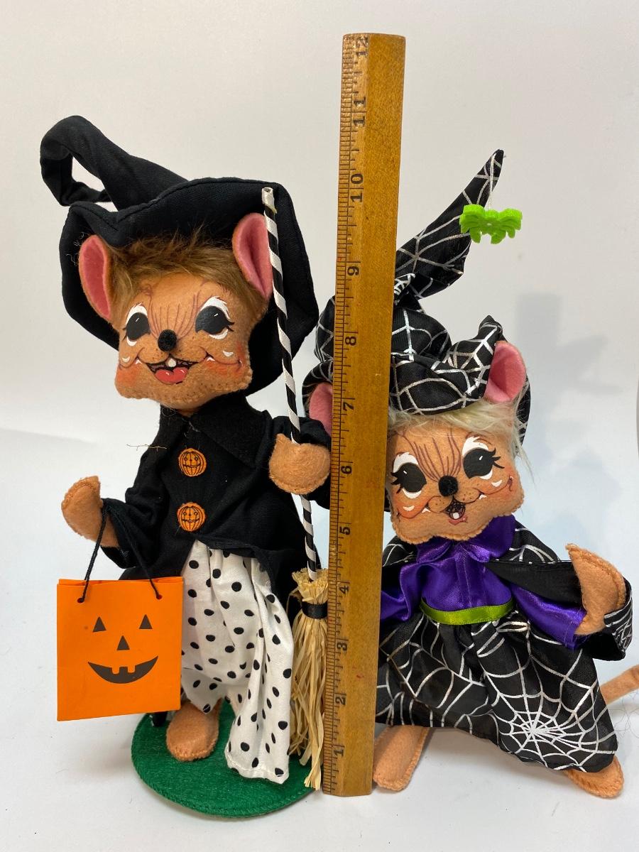 Pair of Annalee Halloween Trick or Treat mice dolls. Poseable plush dolls in Halloween costumes. One from 2011, the other 2015. Both in good condition, about 10" size and smaller.
