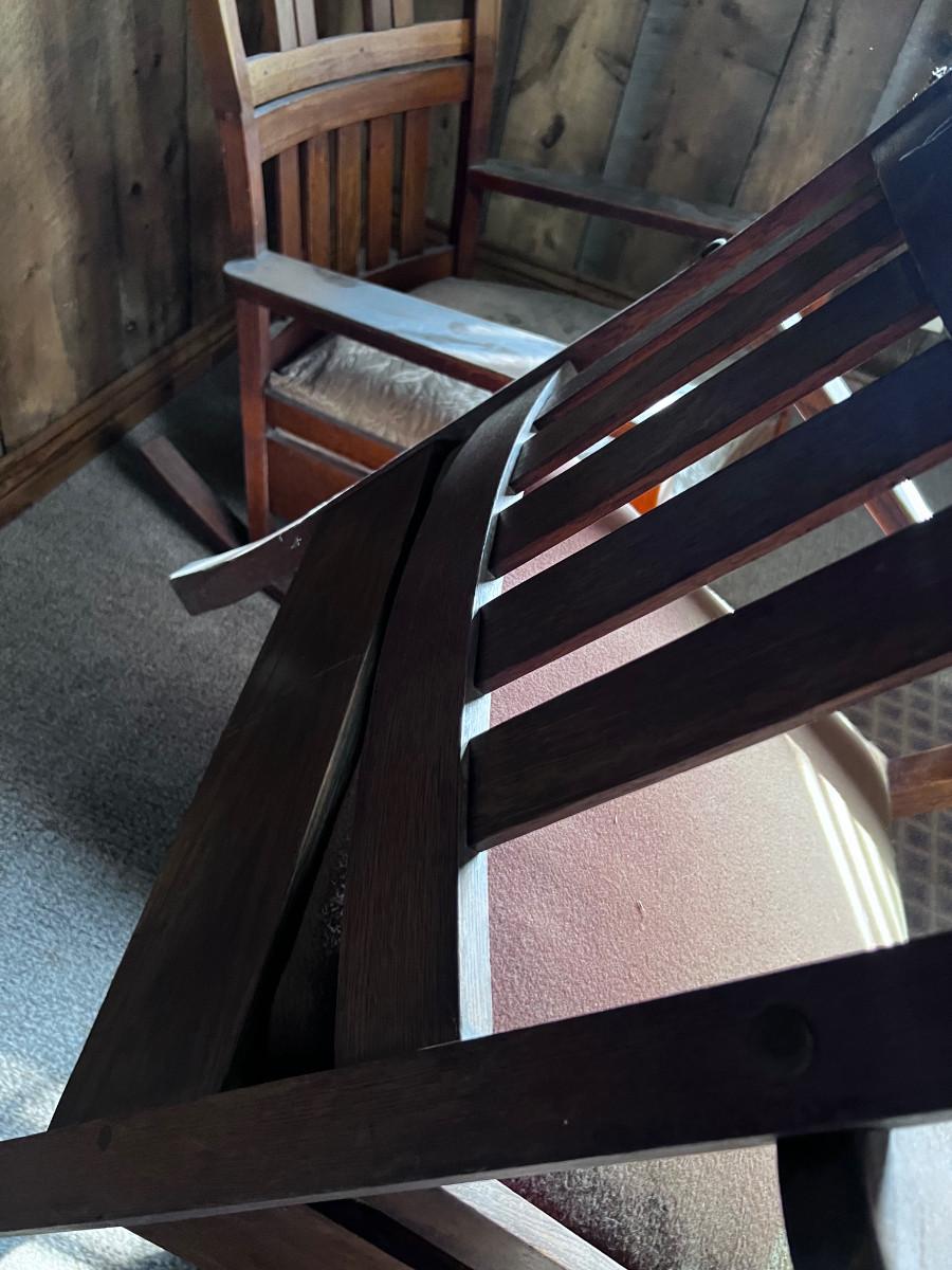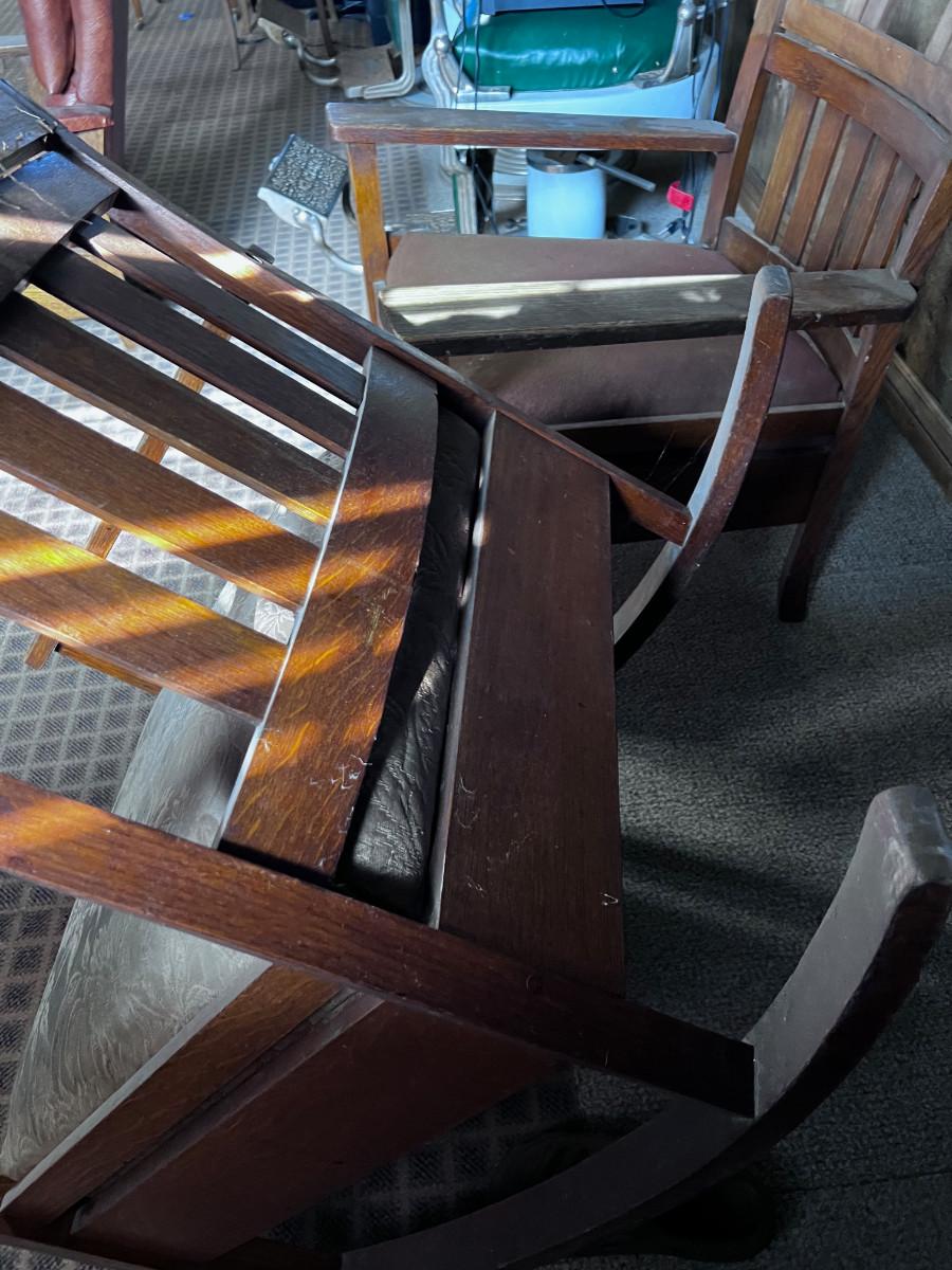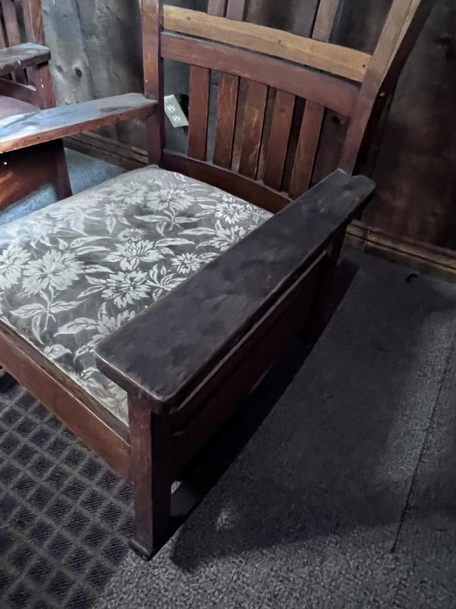 One rocker one arm chair made by the Quant Furniture Co. Grand Rapids Michigan. Need work, should have upholstered head rest see photos.