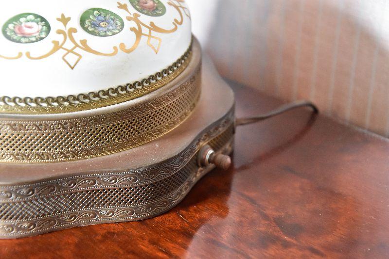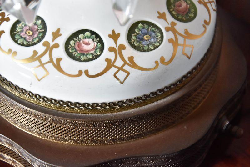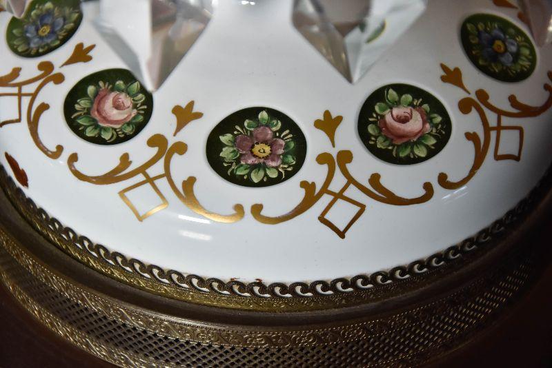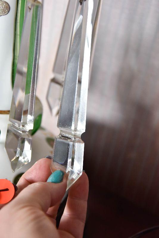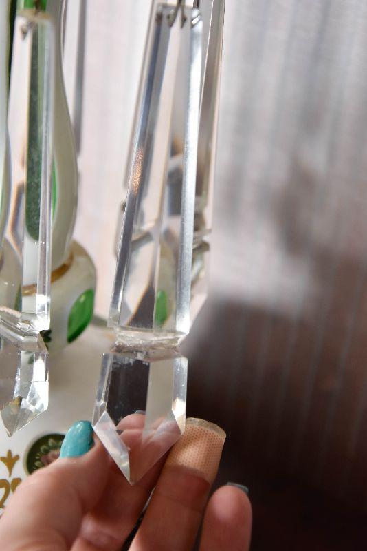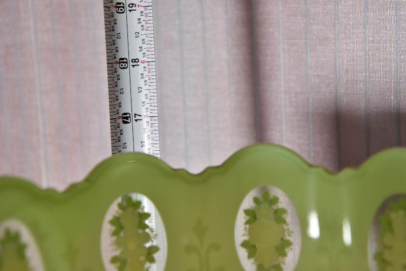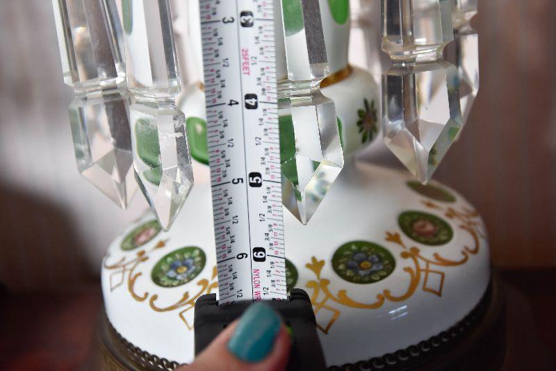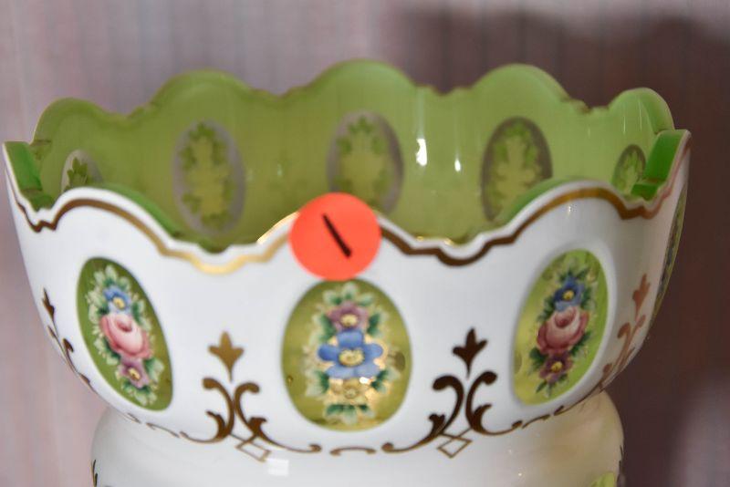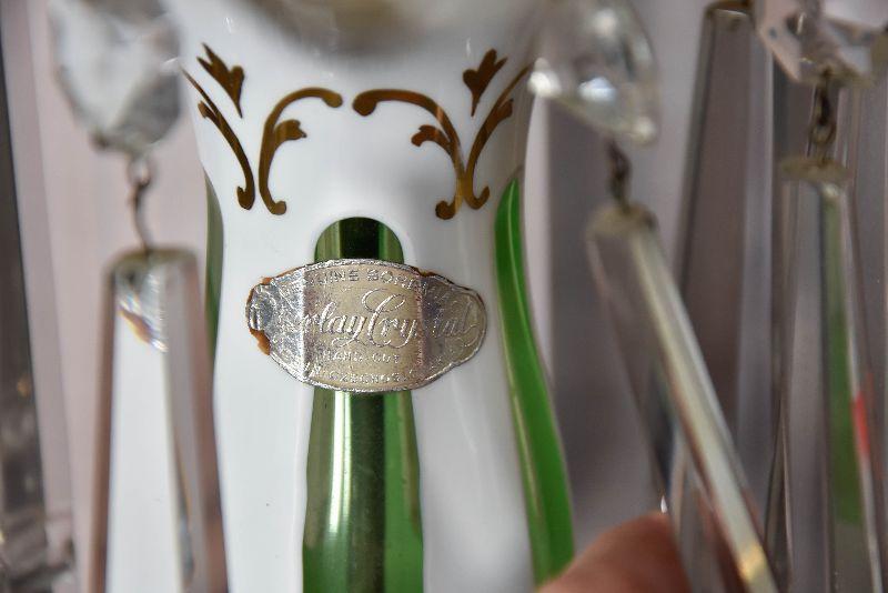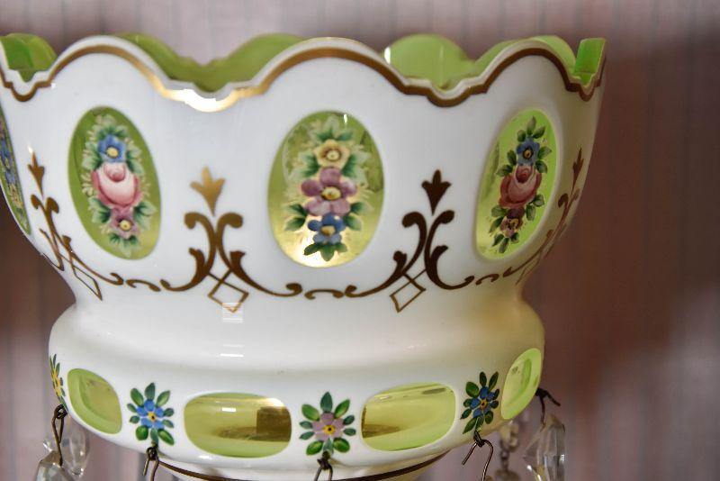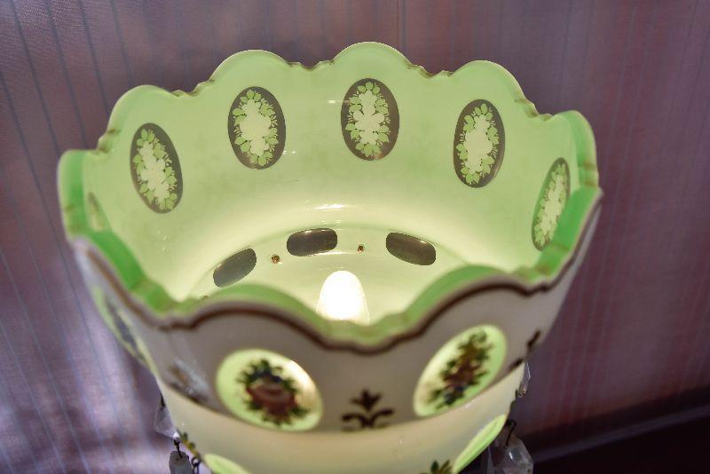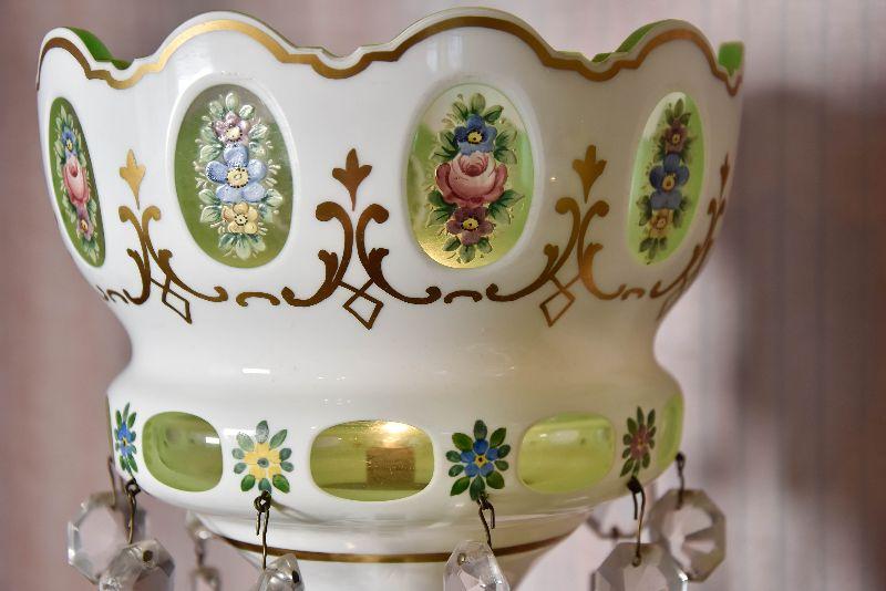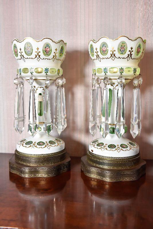 Antique Bohemian White Enameled Cut to Green Art Glass Luster Lamps with 5 in. prisms. Gorgeous green glass with hand-painted flowers. The filigree in the brass base is beautifully intricate. One of the prisms was repaired (photo 12-13), and there is a small area where the enamel has been nicked (photo 6). These are a truly stunning pair of lamps.