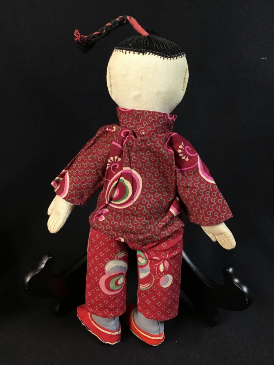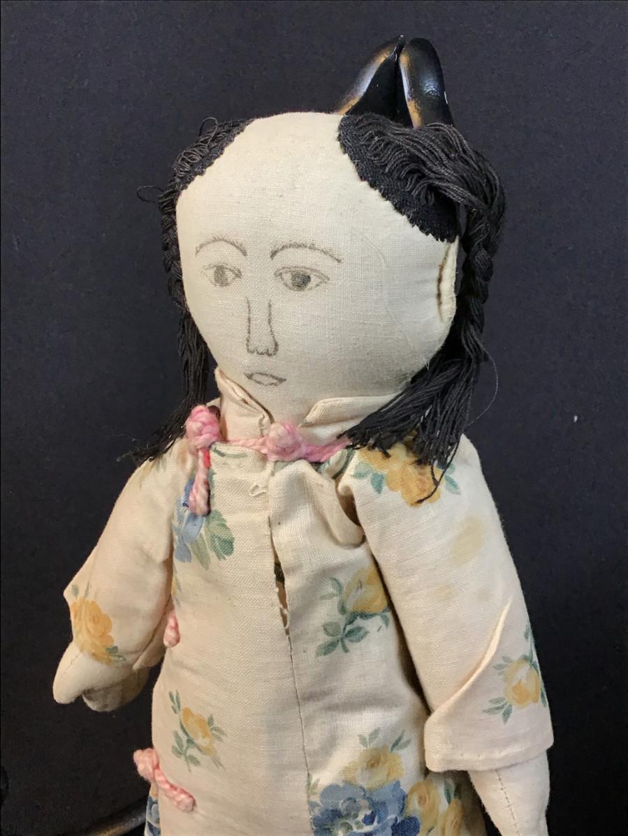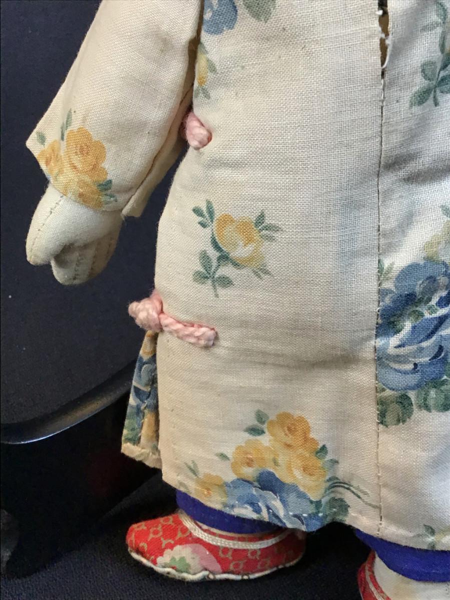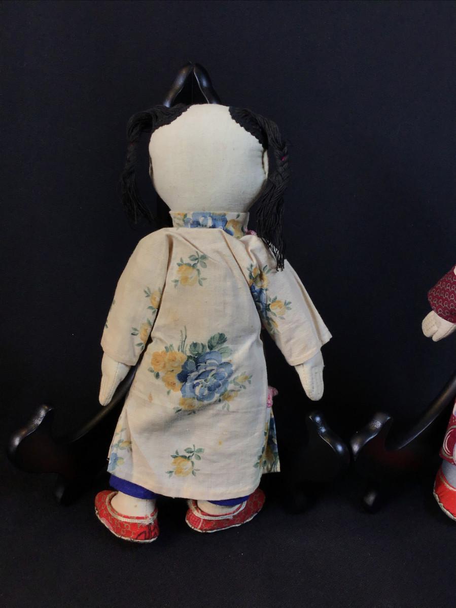 DESCRIPTION: This folk art pair of hand-made Chinese dolls are all hand made, including there elaborate costumes! Both doll bodies are hand constructed of cotton muslin. The facial details appear to be hand drawn onto the faces. Both doll heads are finished with braided black string and sewn to the top of the head.
