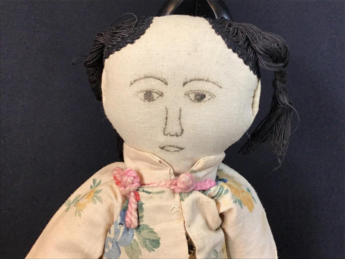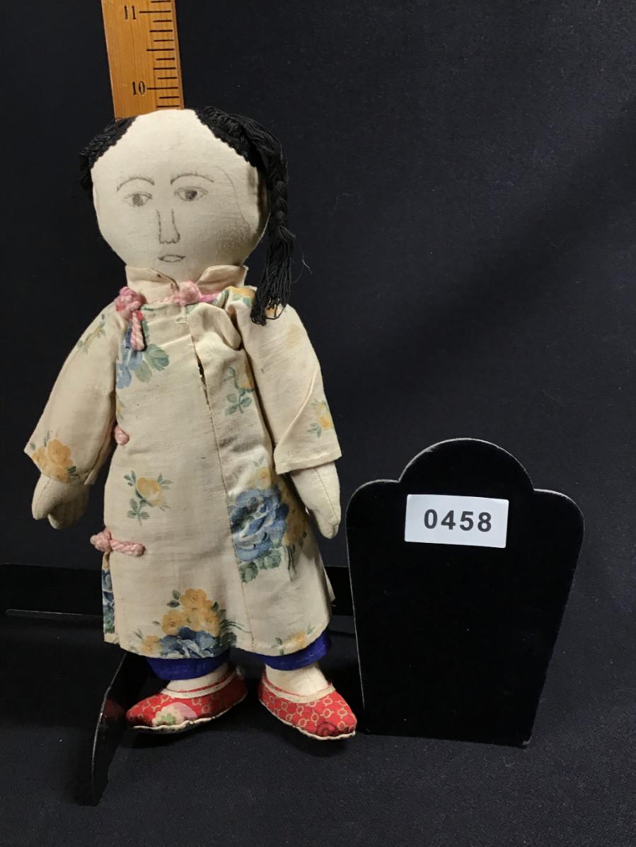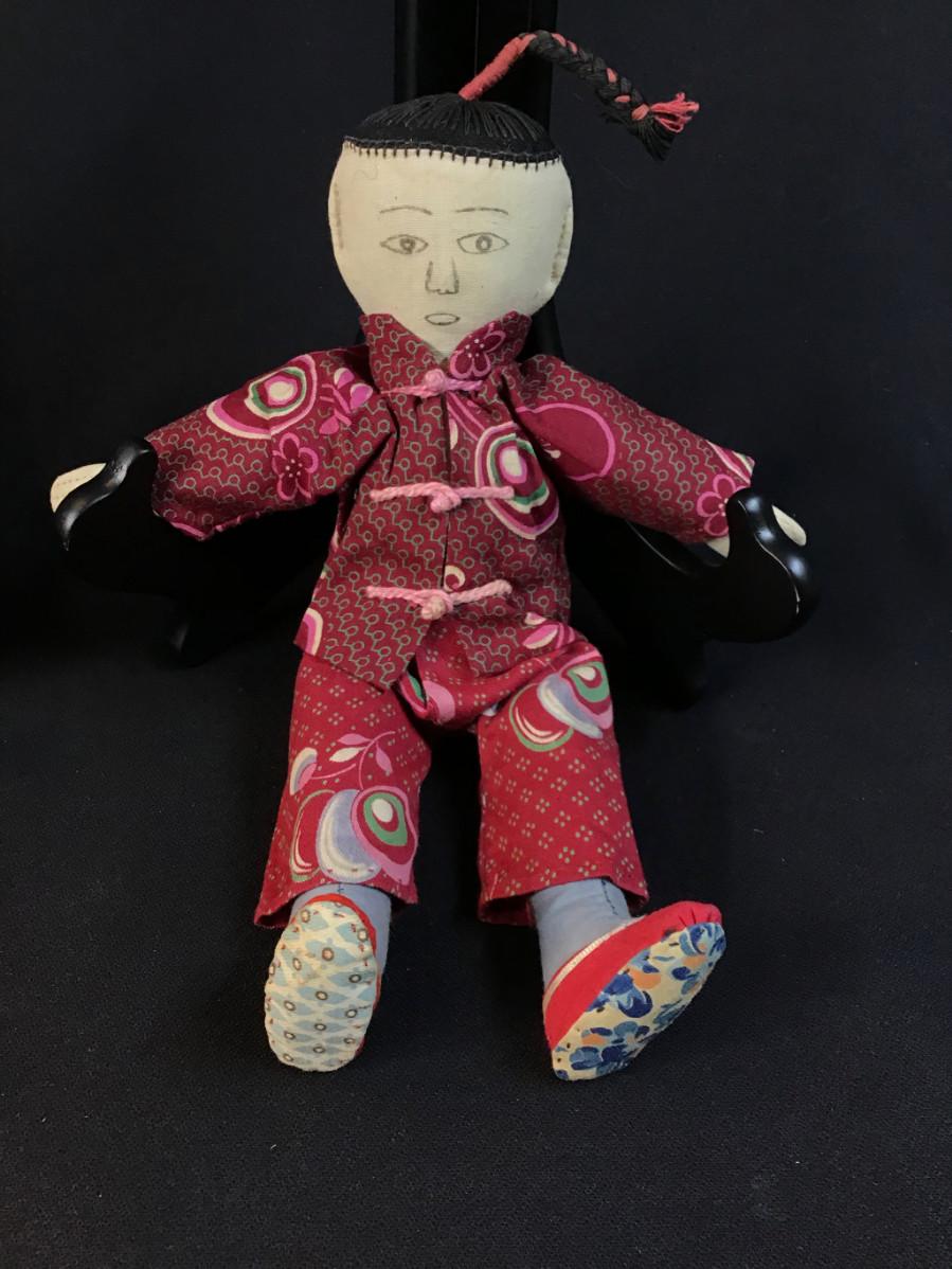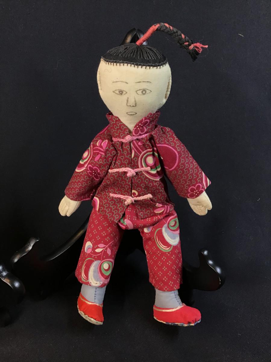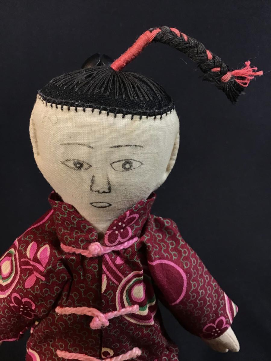 DESCRIPTION: This folk art pair of hand-made Chinese dolls are all hand made, including there elaborate costumes! Both doll bodies are hand constructed of cotton muslin. The facial details appear to be hand drawn onto the faces. Both doll heads are finished with braided black string and sewn to the top of the head.