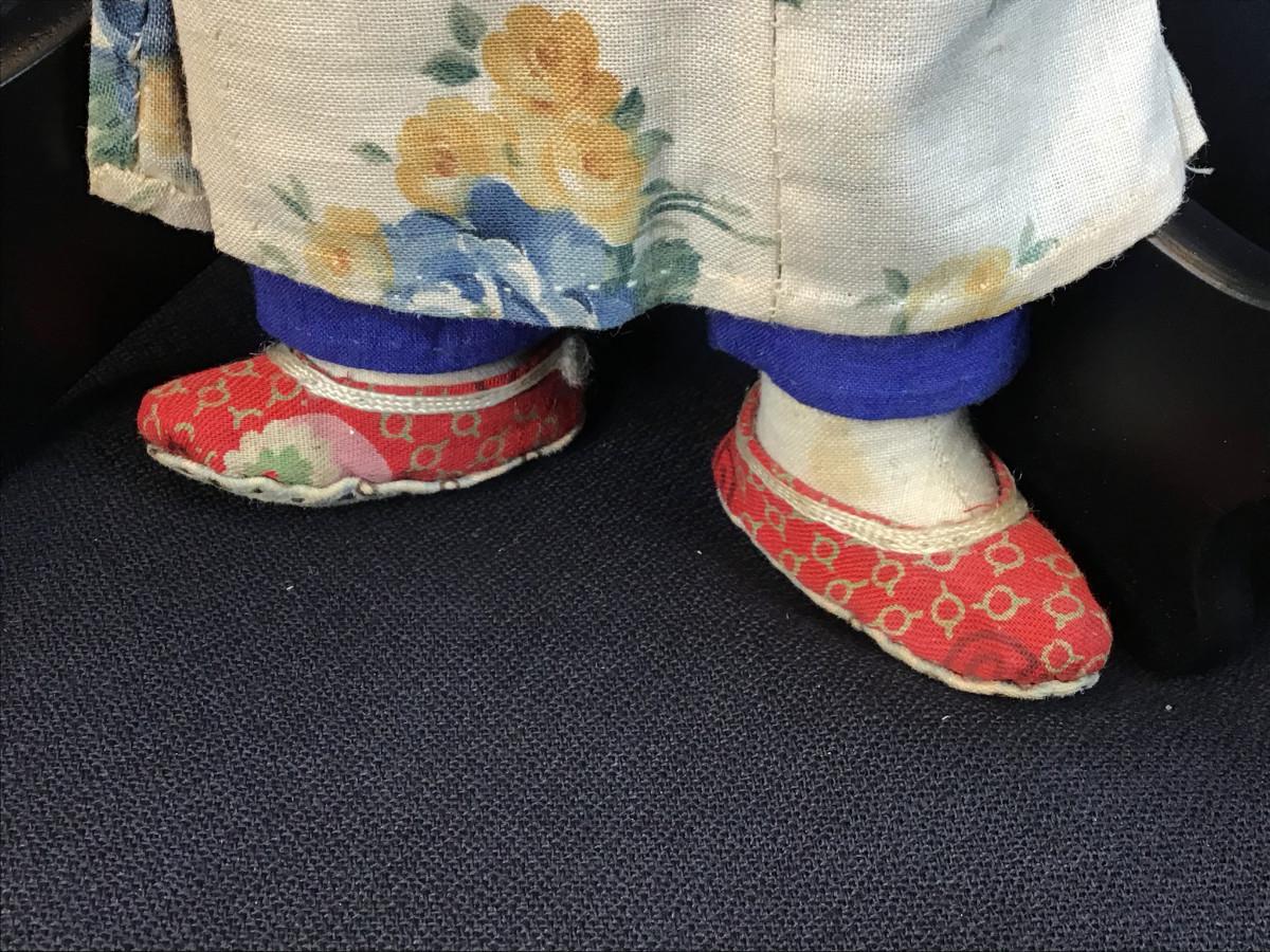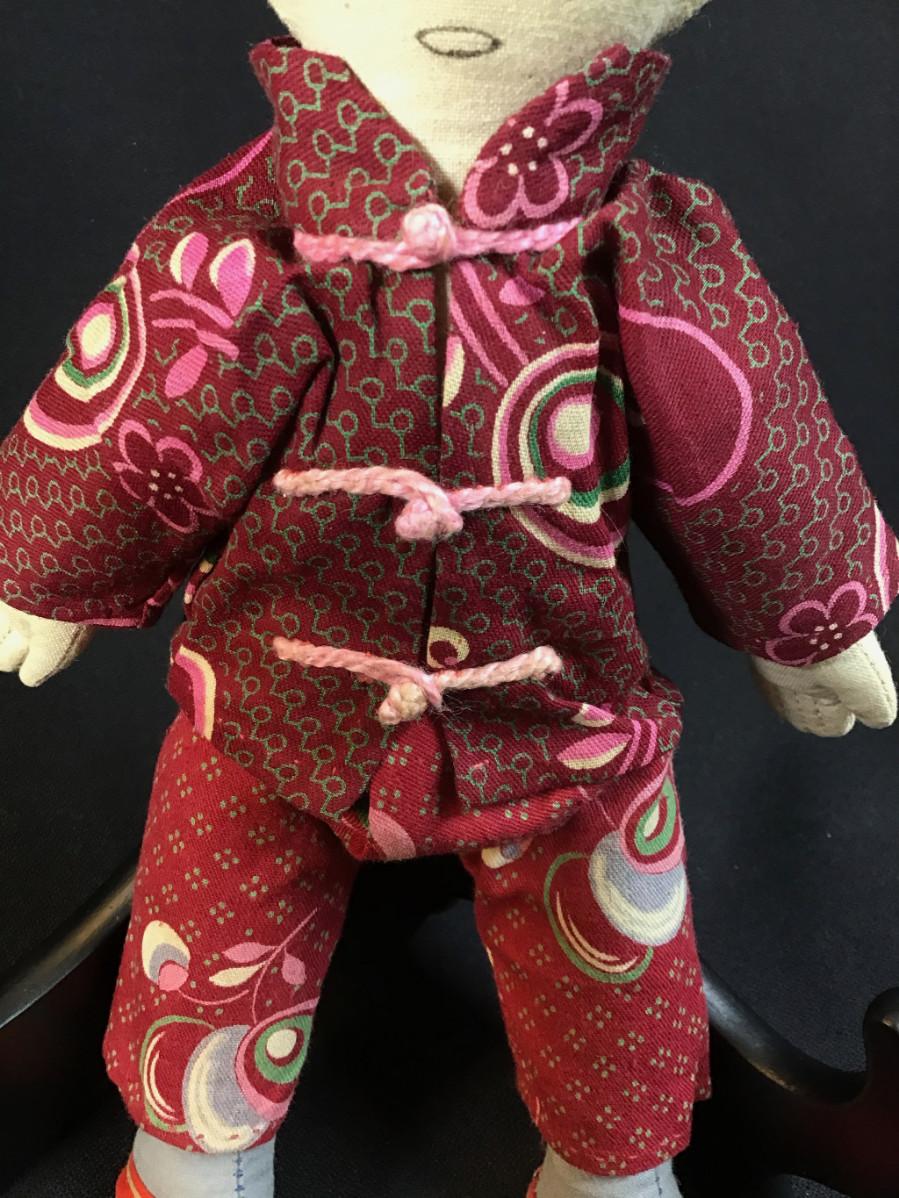 The boys costume is composed of a maroon red fabric print with a floral pattern used for both the pants and jacket that is finished with pink frog closures. His tiny shoes are of red silk with floral soles in different patterns.