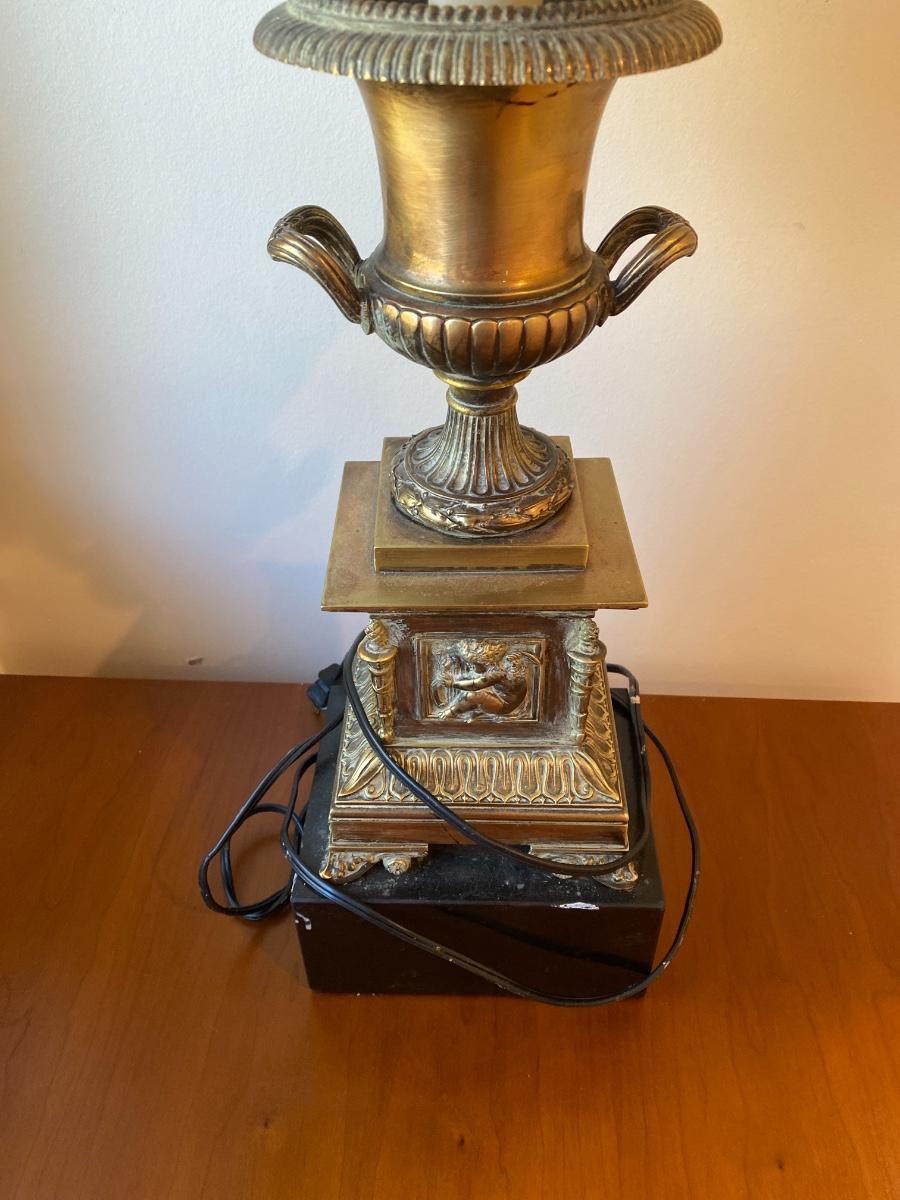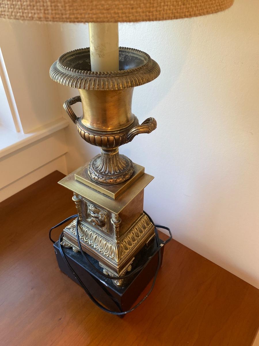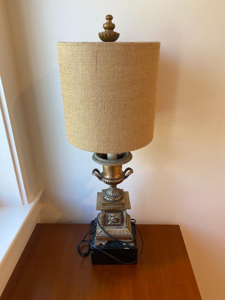 There are two of these lamps. They are each 30 inches high from heavy base to top of finial. One is upstairs and one is downstairs.