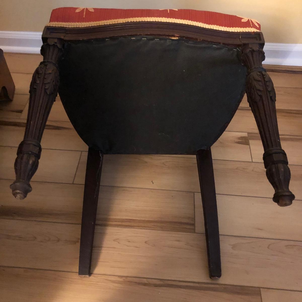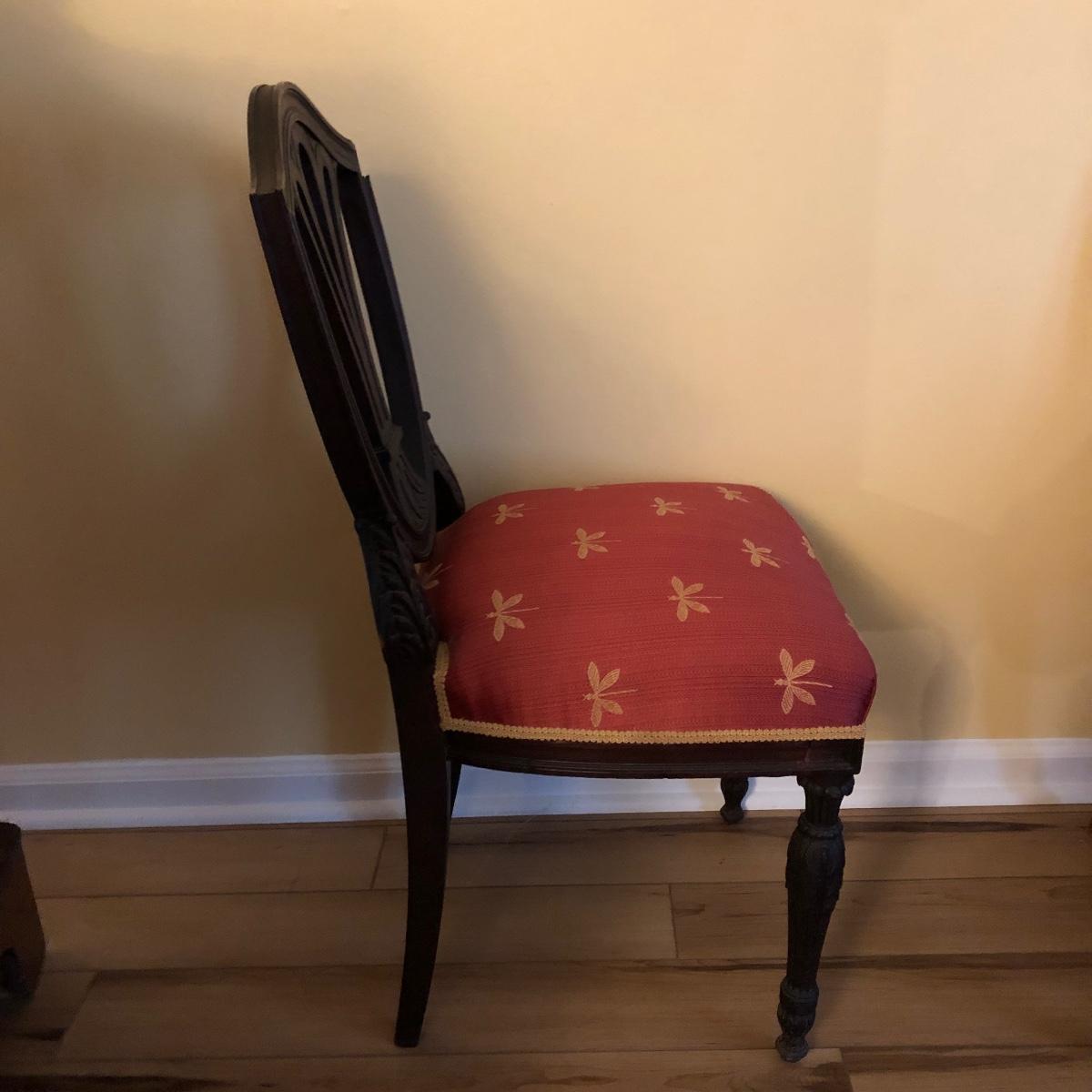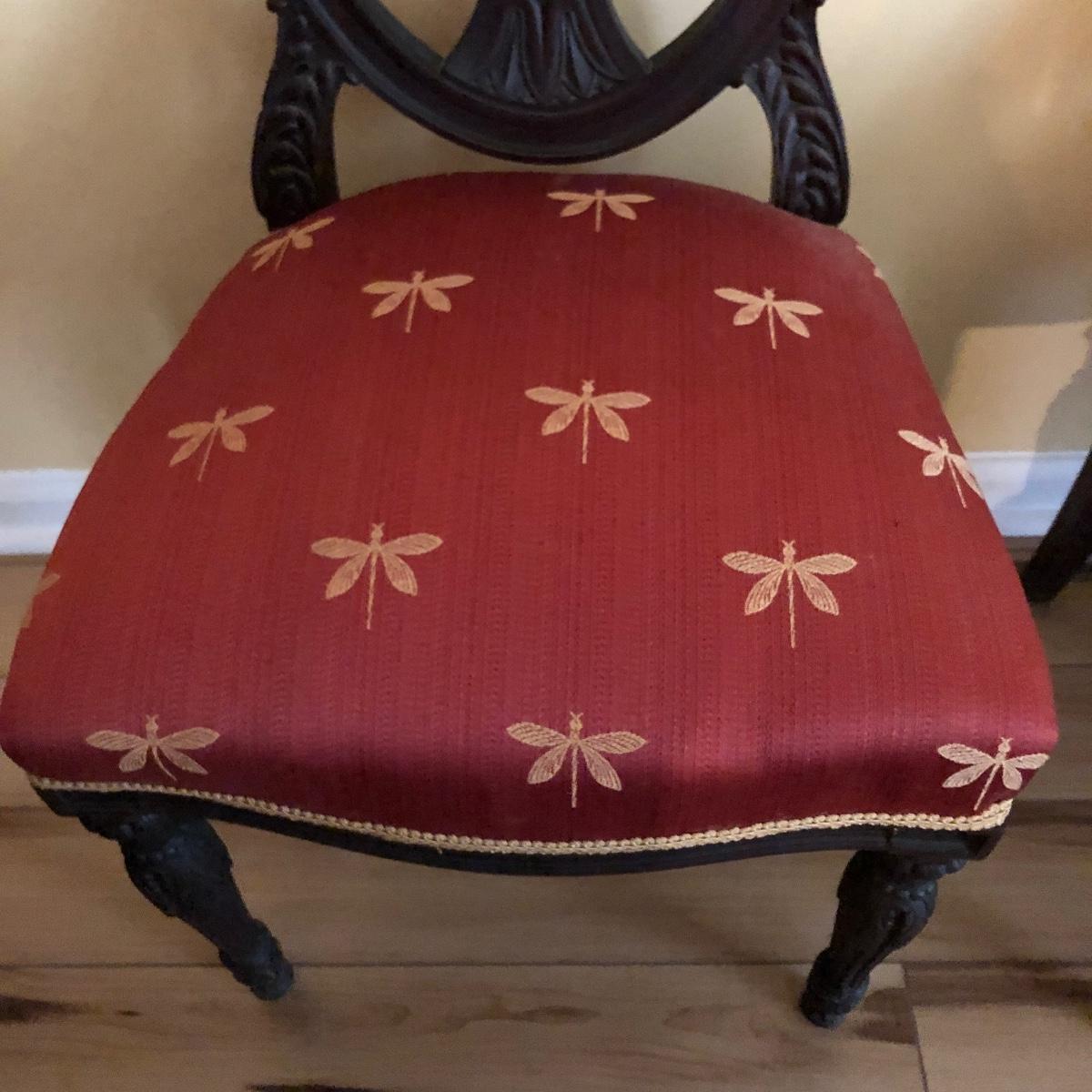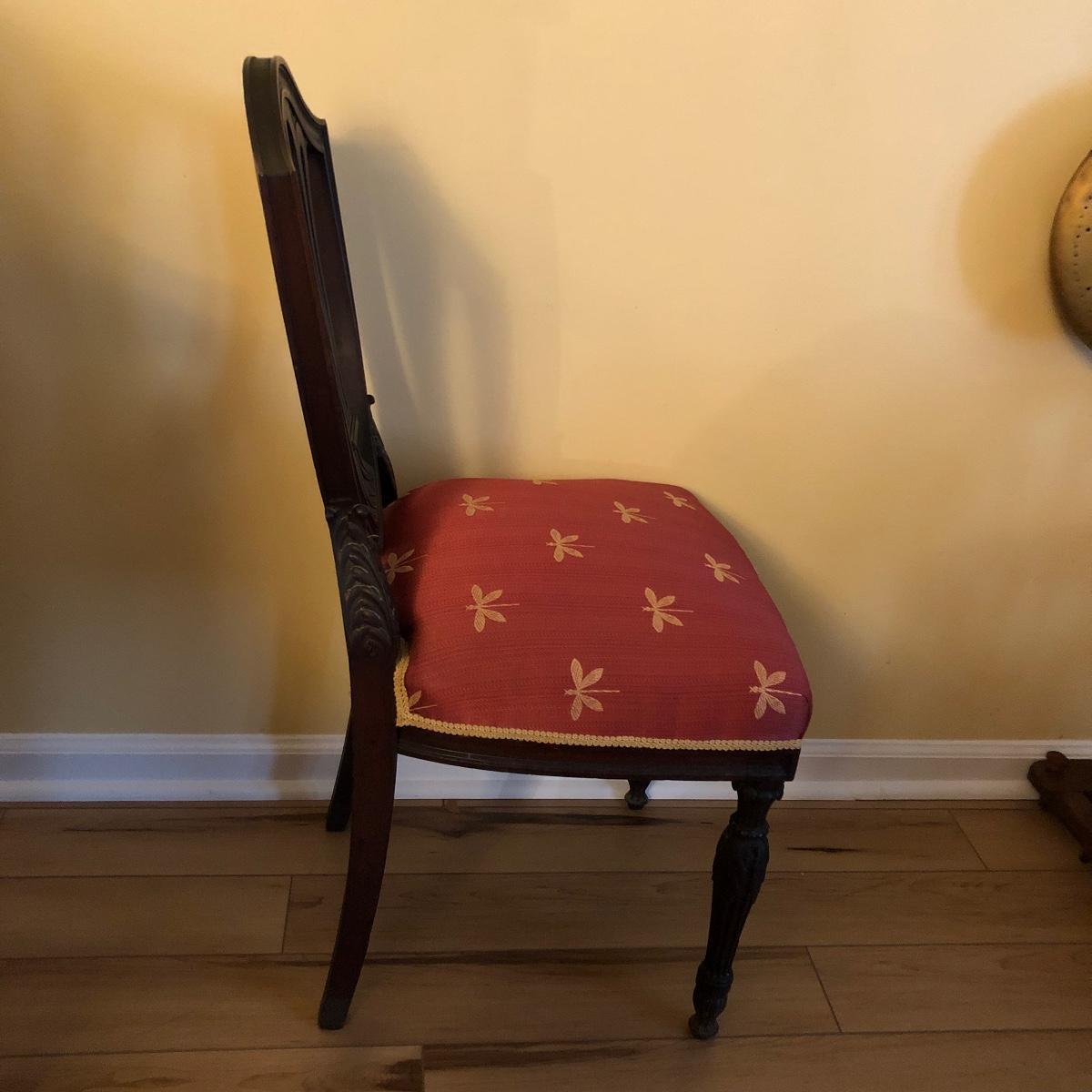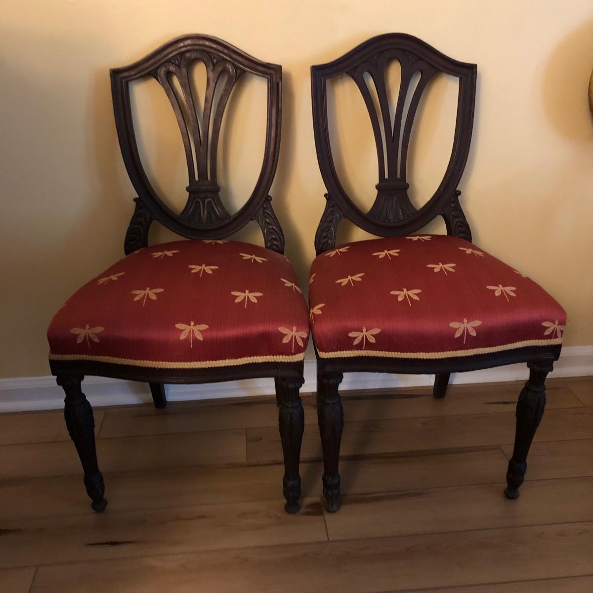 Lot includes two matching antique intricately carved wooden chairs with fabric covered padded seats. Chairs measure 18” x 19” x 35” with a 18” seat height. Appear to be newly upholstered.