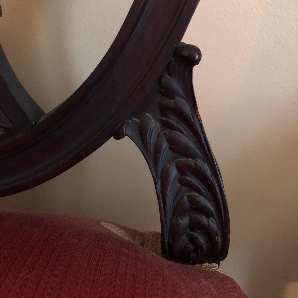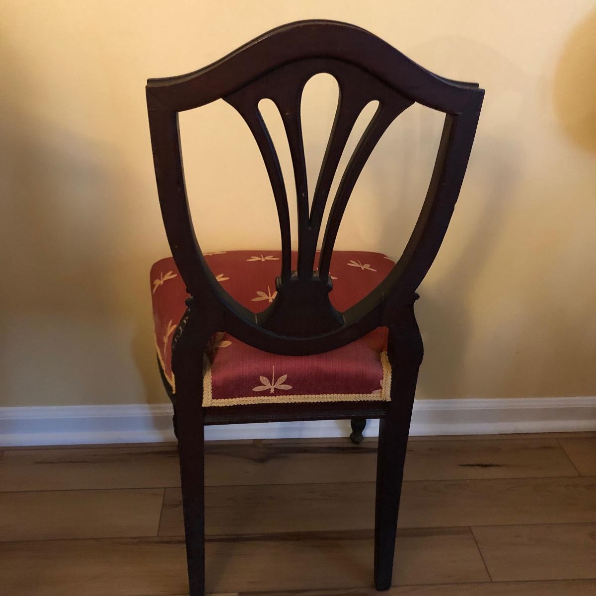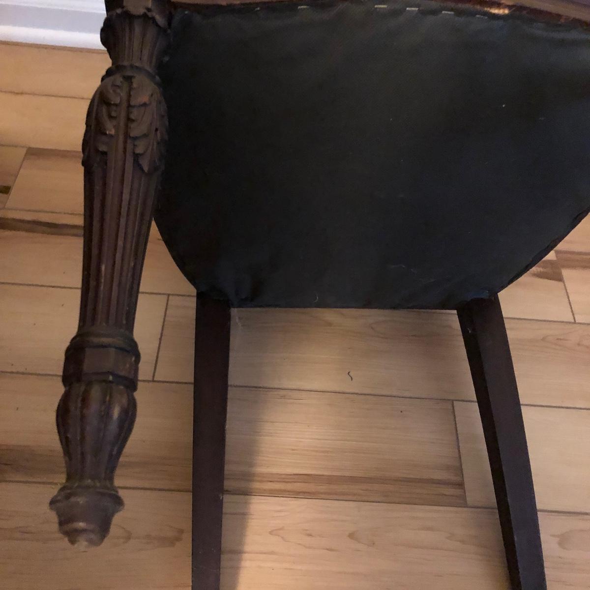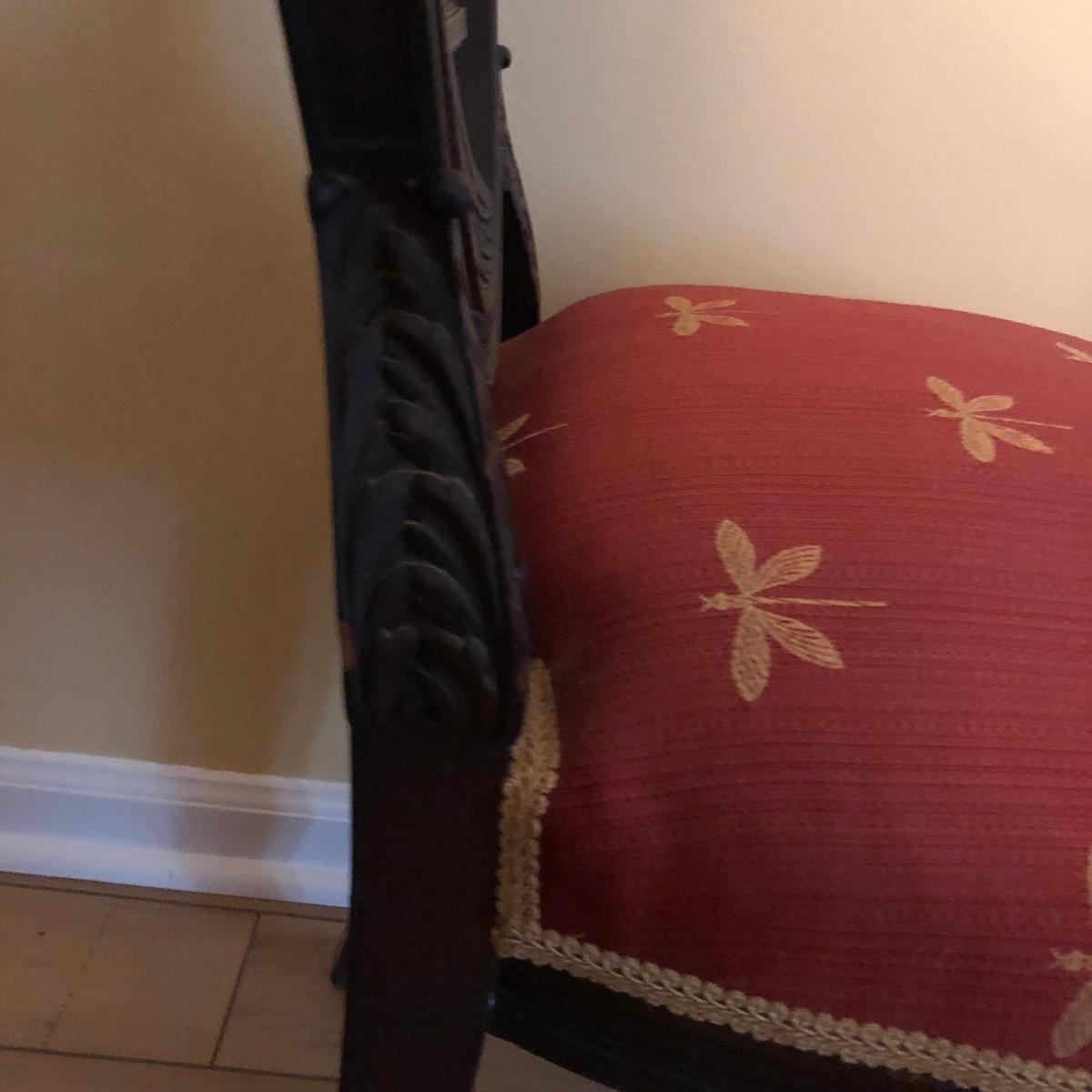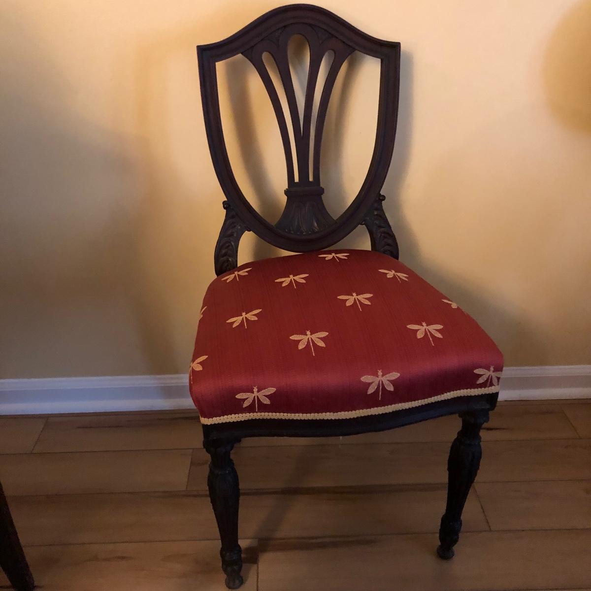 Lot includes two matching antique intricately carved wooden chairs with fabric covered padded seats. Chairs measure 18” x 19” x 35” with a 18” seat height. Appear to be newly upholstered.