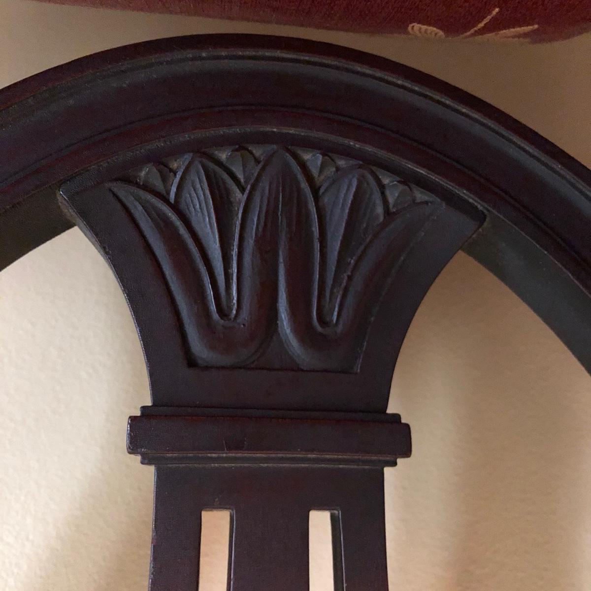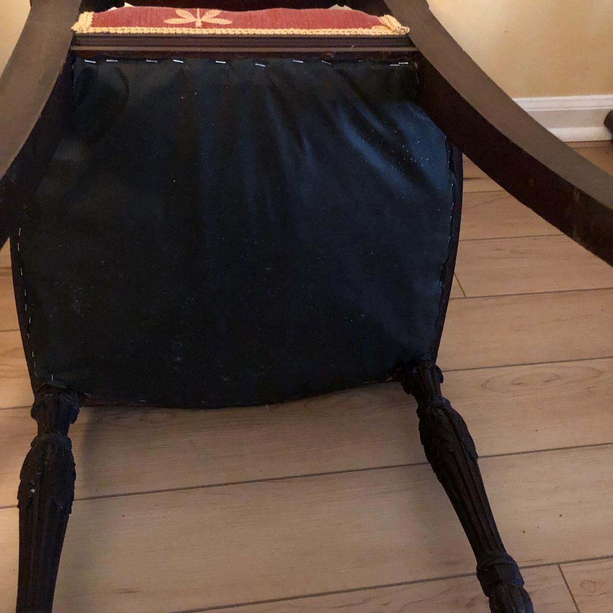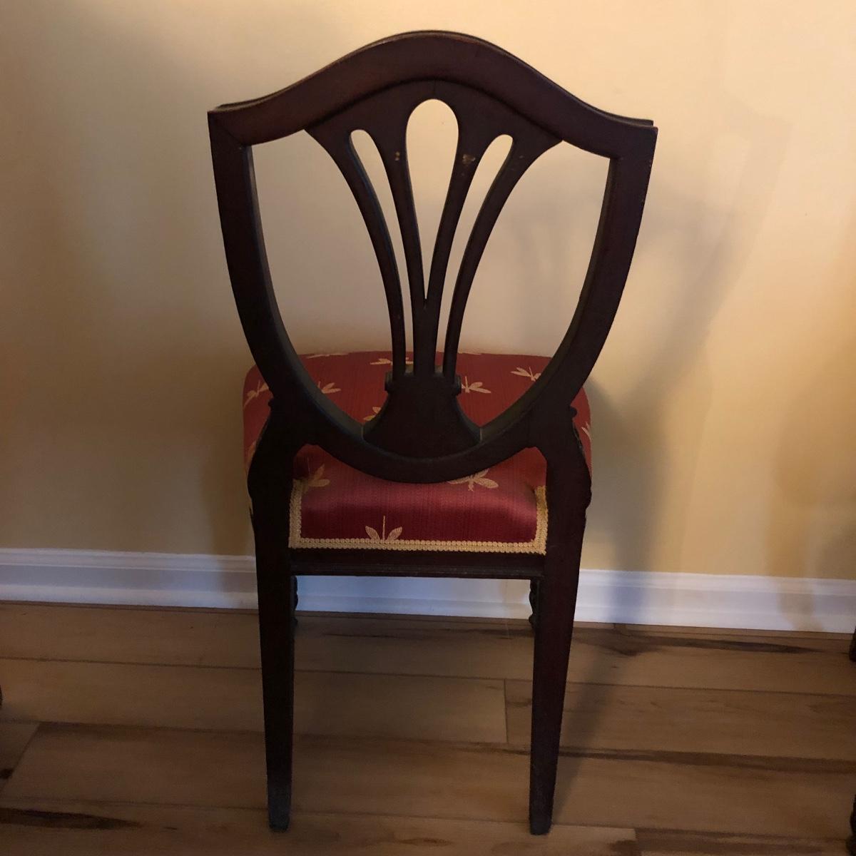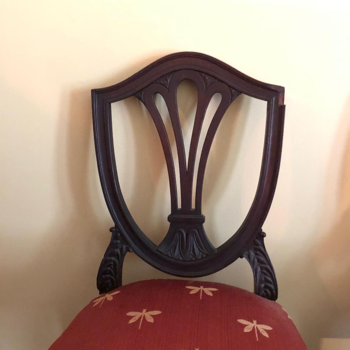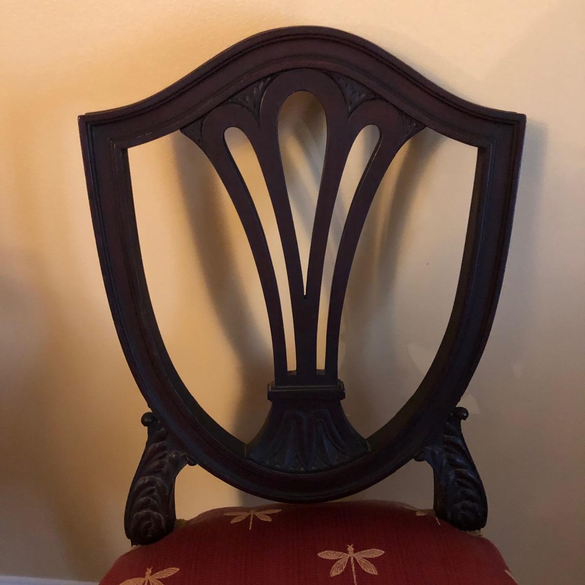 Lot includes two matching antique intricately carved wooden chairs with fabric covered padded seats. Chairs measure 18” x 19” x 35” with a 18” seat height. Appear to be newly upholstered.
