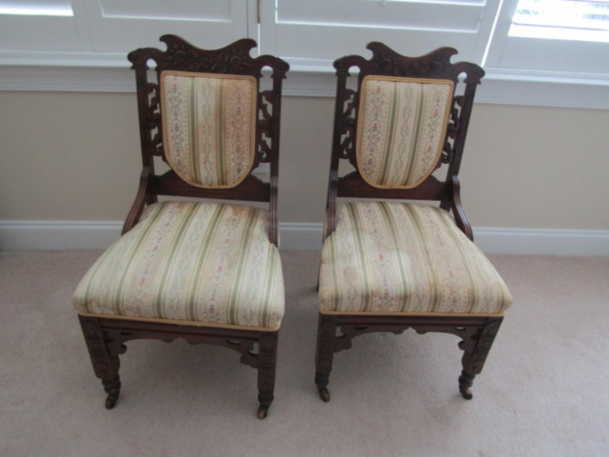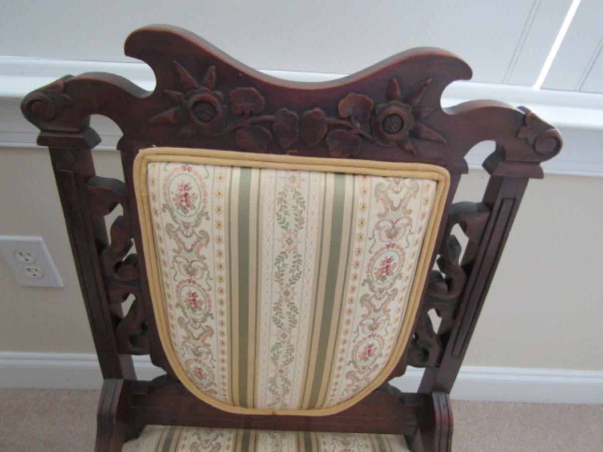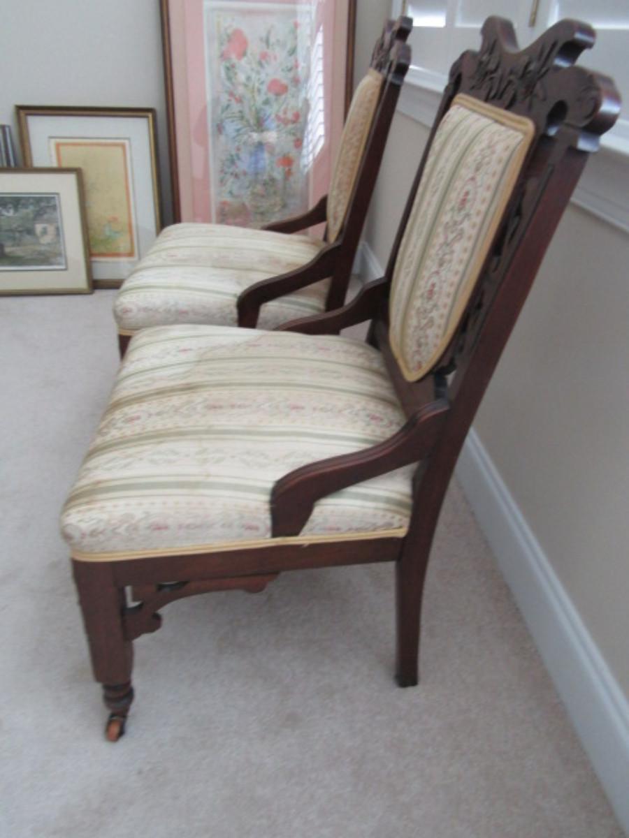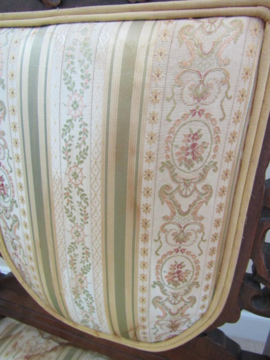 Pair of Antique Carved Wooden Chairs with Upholstered Backs and Seats