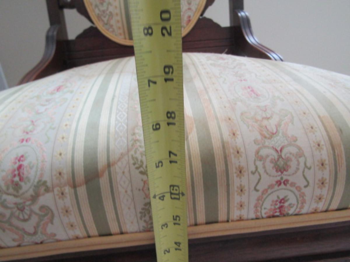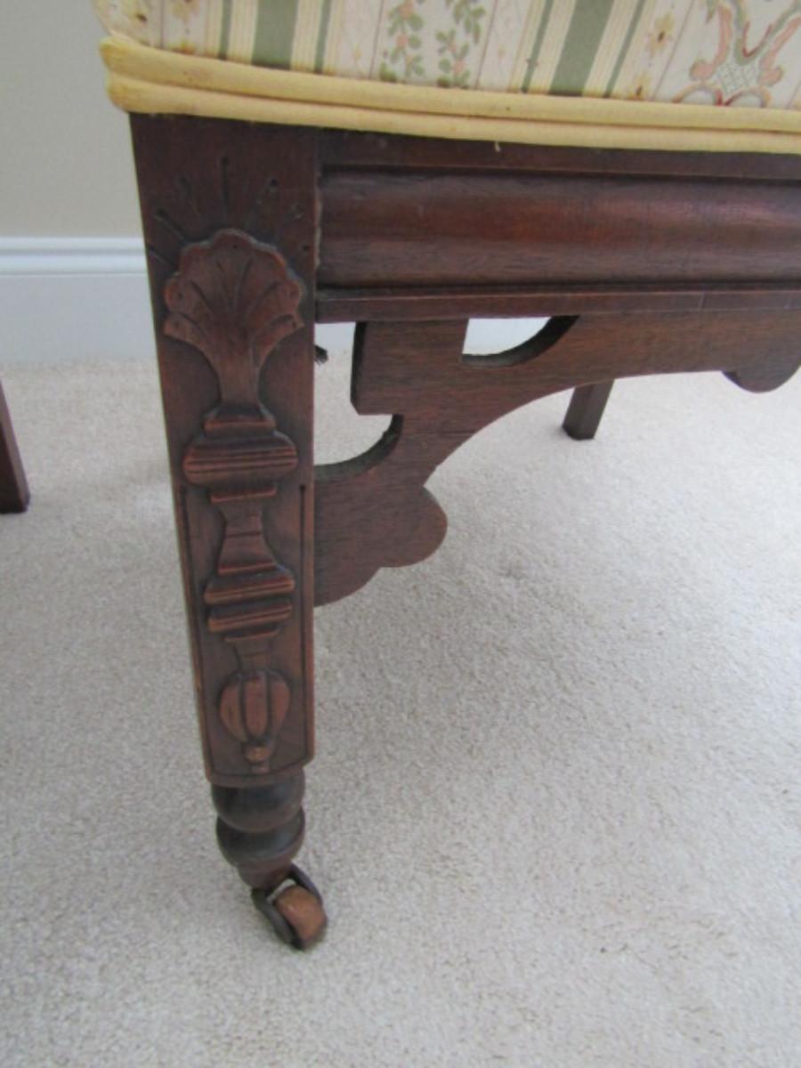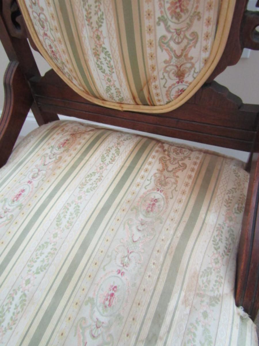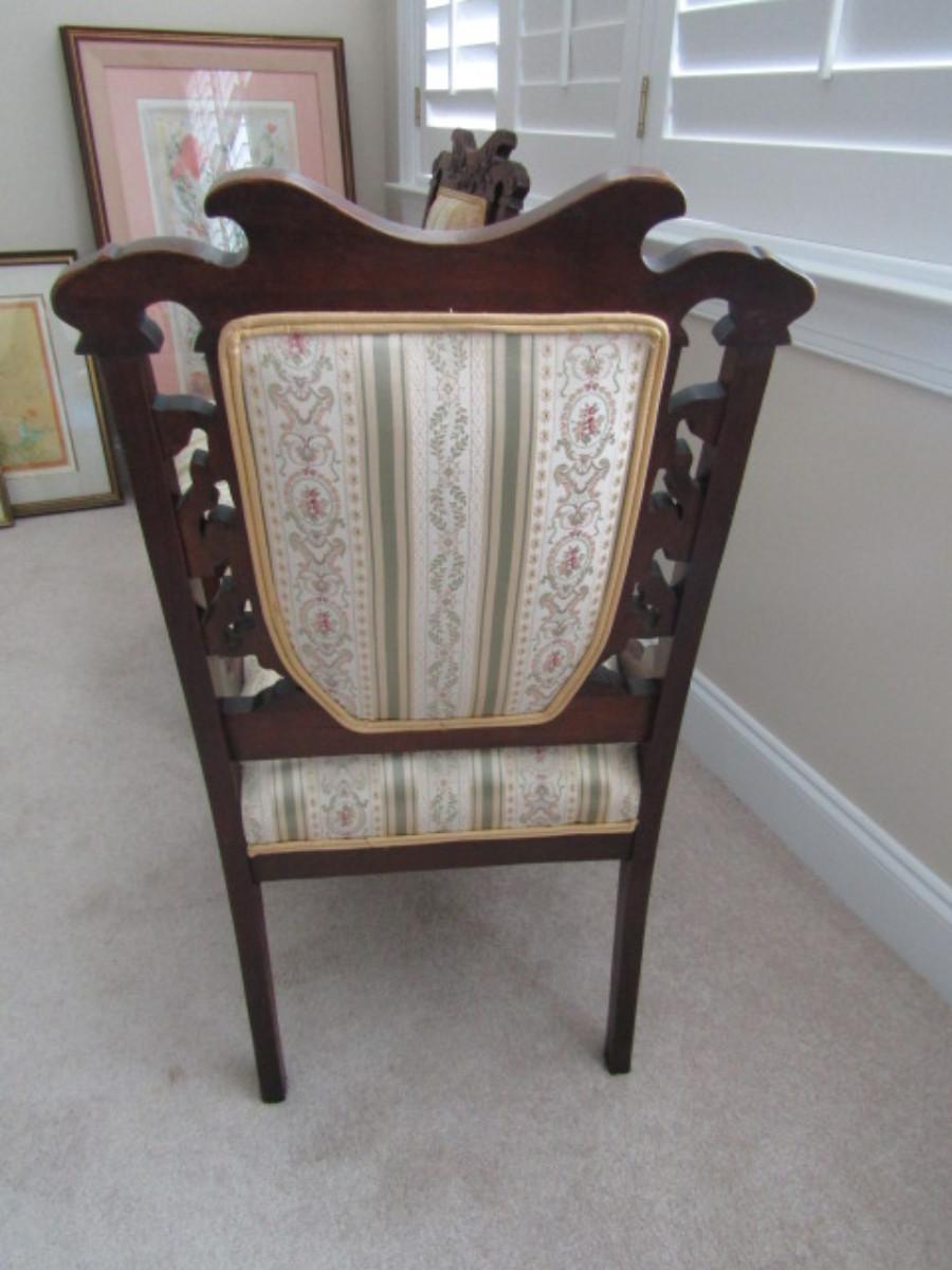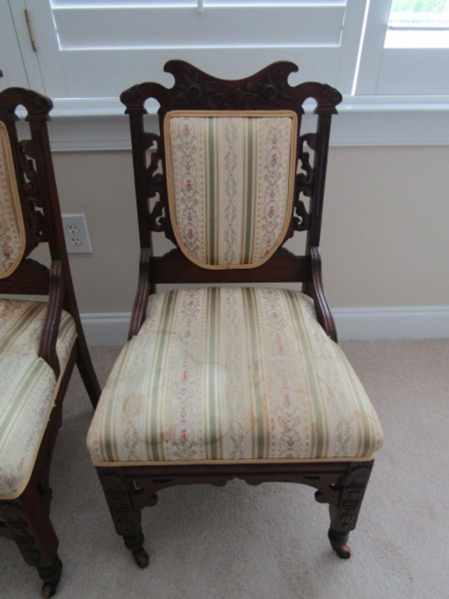 Pair of Antique Carved Wooden Chairs with Upholstered Backs and Seats