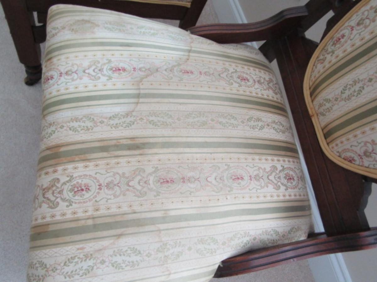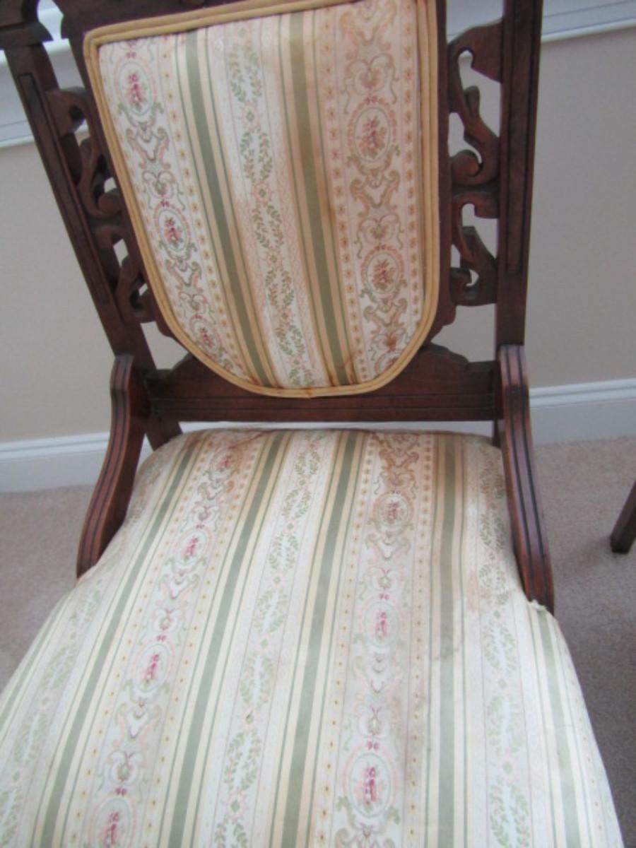 Pair of Antique Carved Wooden Chairs with Upholstered Backs and Seats. Chairs have staining and may need to be re-upholstered.