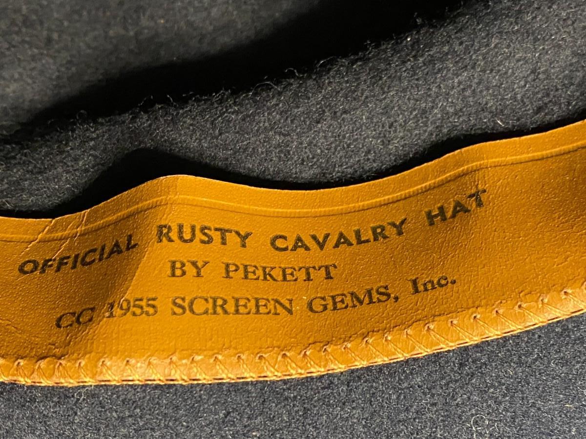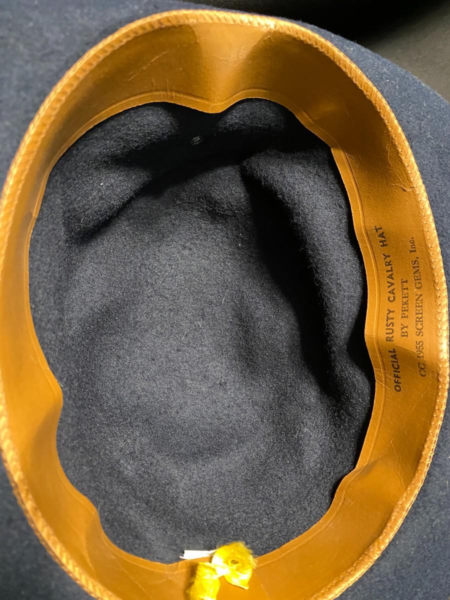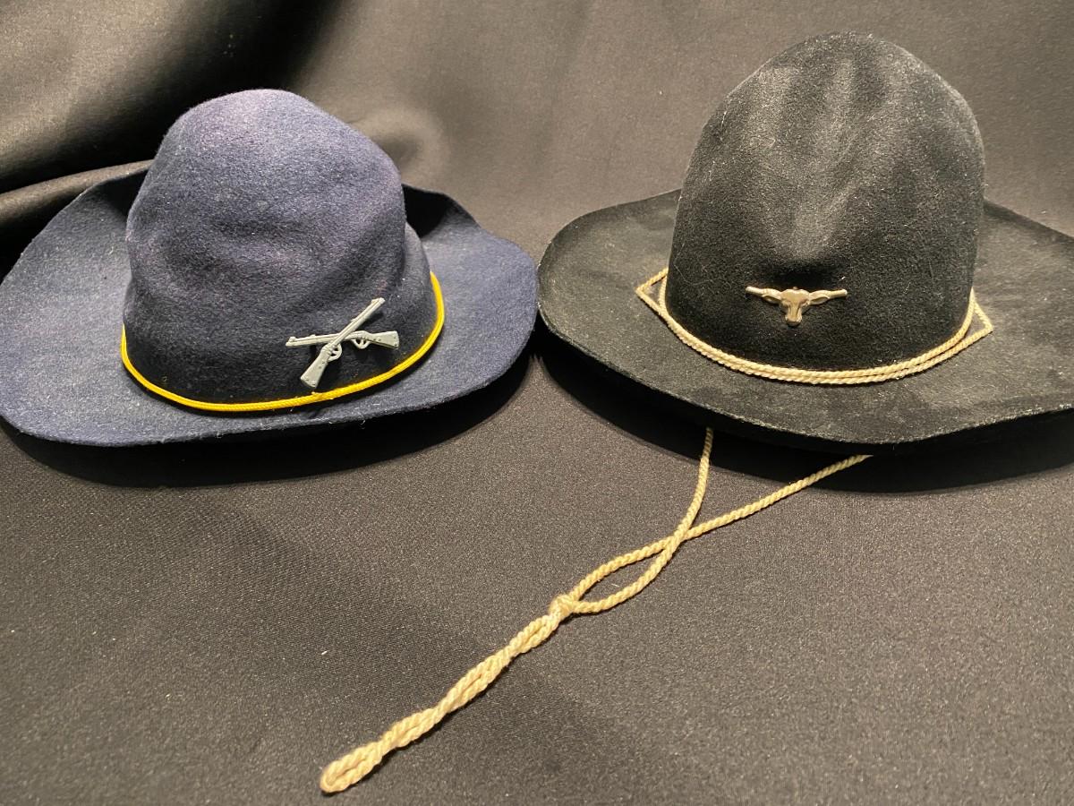 Pair of Vintage Kids Cavalry Hats with Pistol Bull Pins and Rope Strings. One blue and yellow hat with a double rifle pin, and one black and yellow hat with bull pin. 1955 Official Rusty Cavalry Hat by Pekett, Screen Gems Inc. Made in U.S.A. Condition as shown.