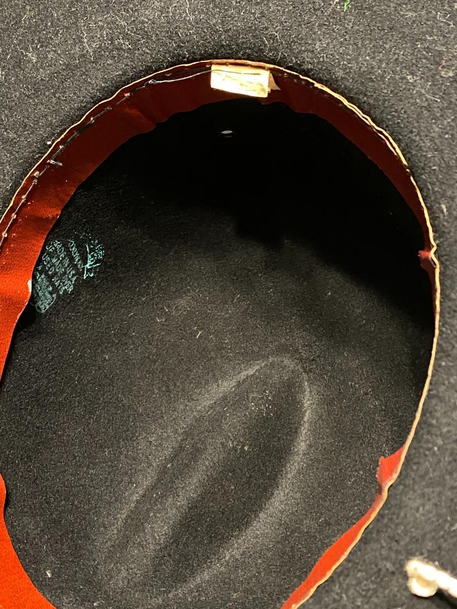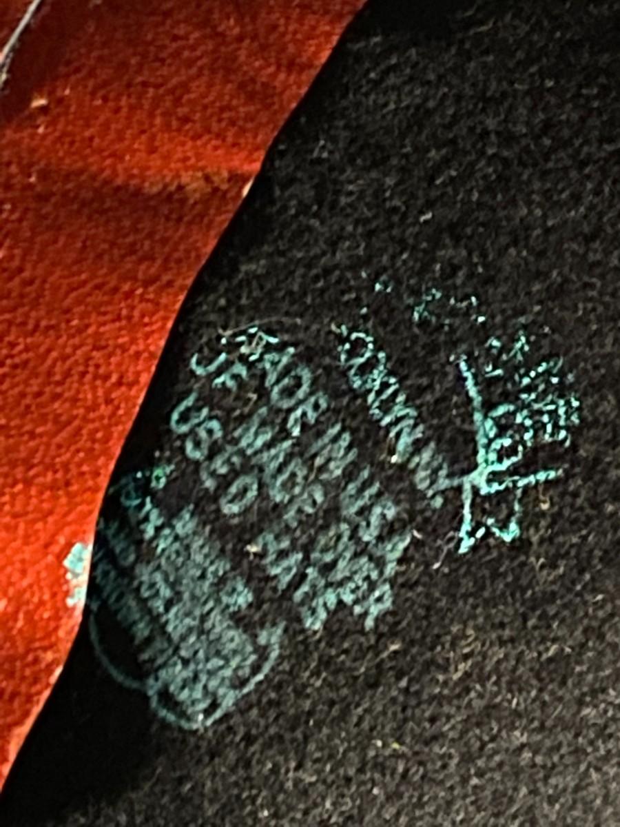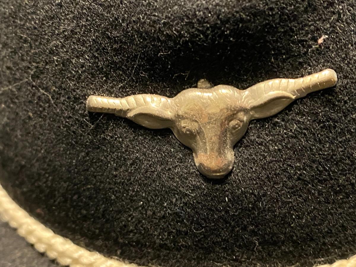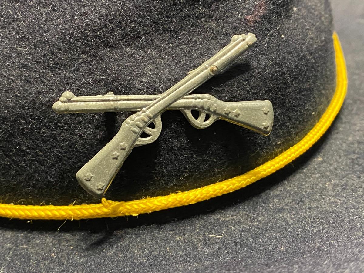 Pair of Vintage Kids Cavalry Hats with Pistol Bull Pins and Rope Strings. One blue and yellow hat with a double rifle pin, and one black and yellow hat with bull pin. 1955 Official Rusty Cavalry Hat by Pekett, Screen Gems Inc. Made in U.S.A. Condition as shown.