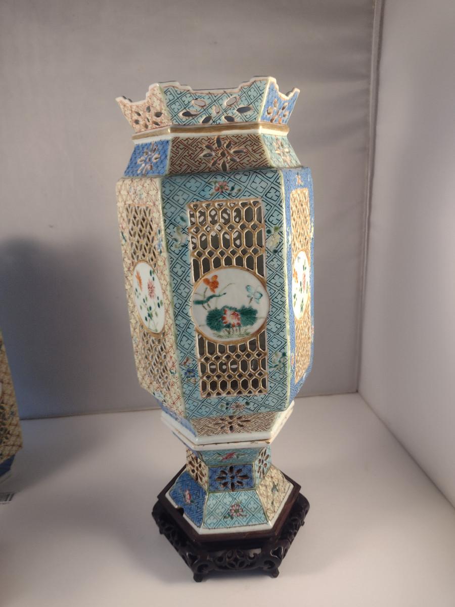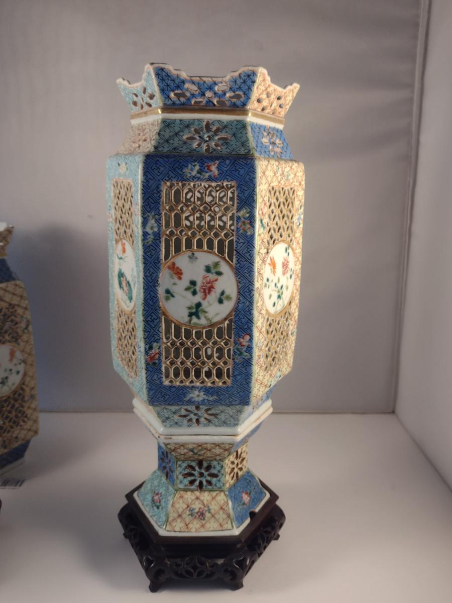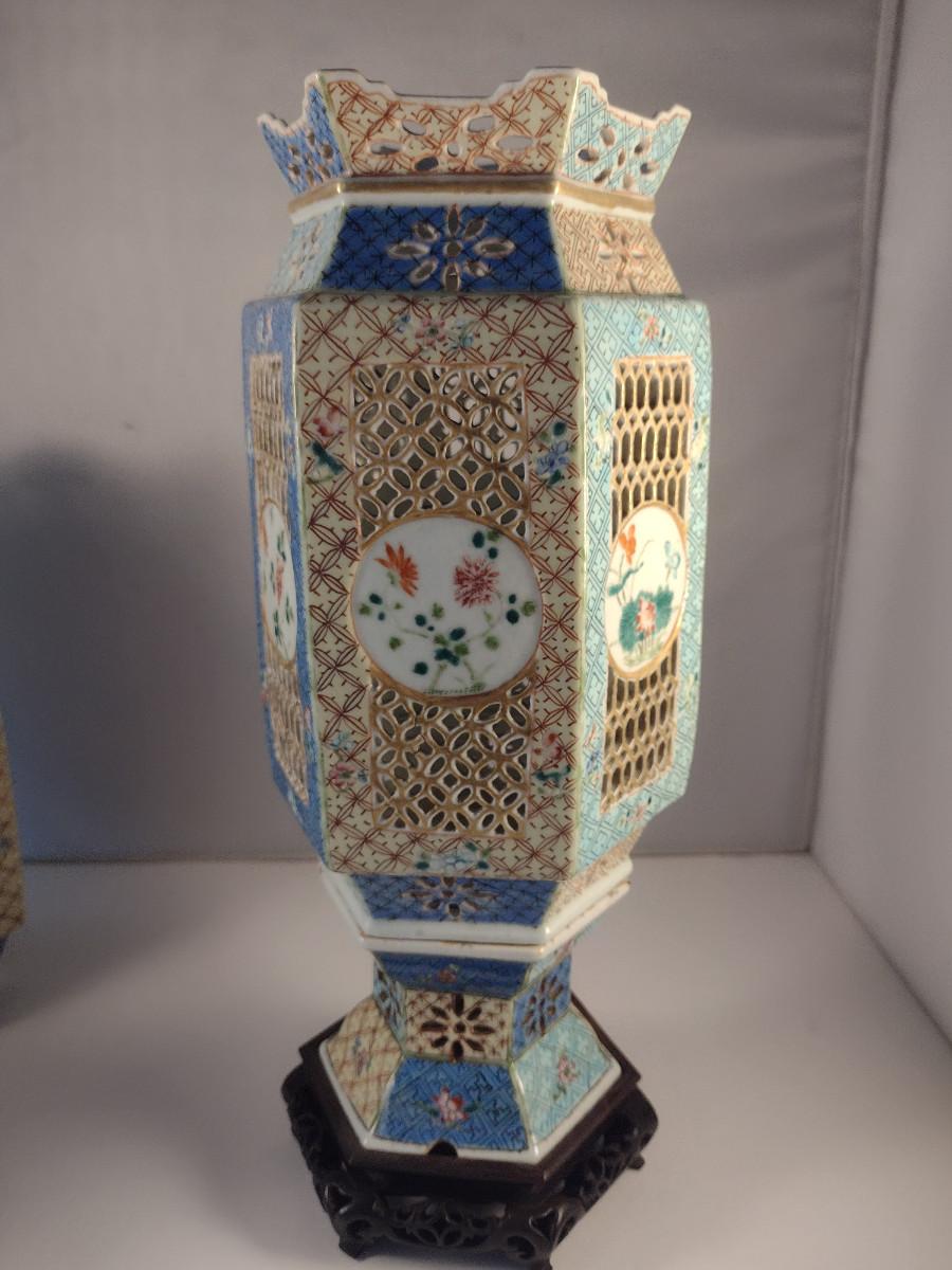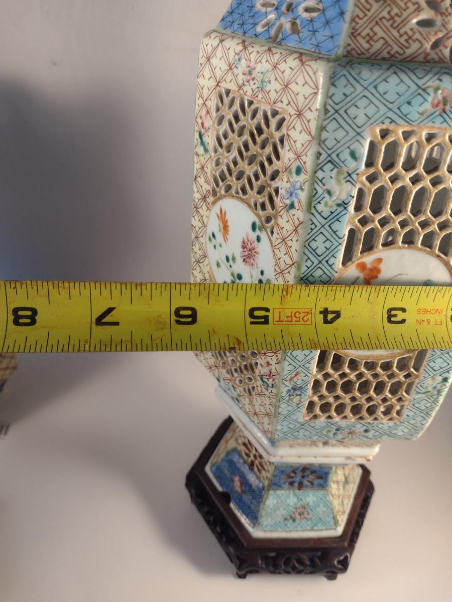 Pair of Antique Ceramic Chinese Wedding Lamps- Circa 1920's- Pierced Design with Wooden Bases. Items may have been electrified at one time, and can be again. Total height when on wooden base, approx 14".