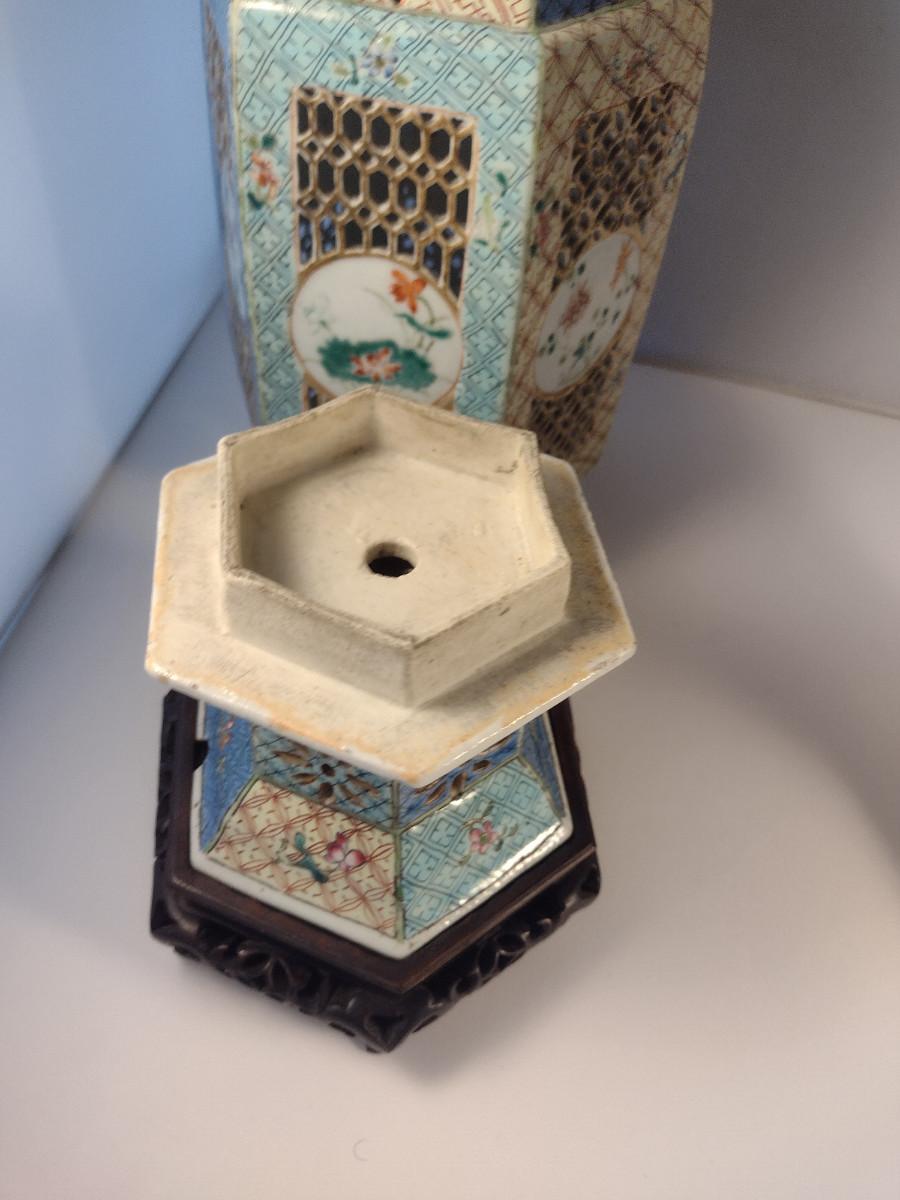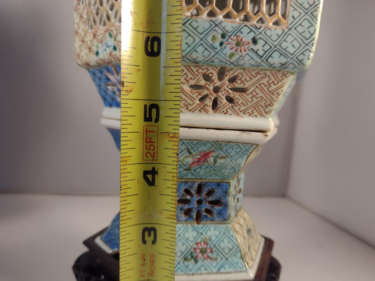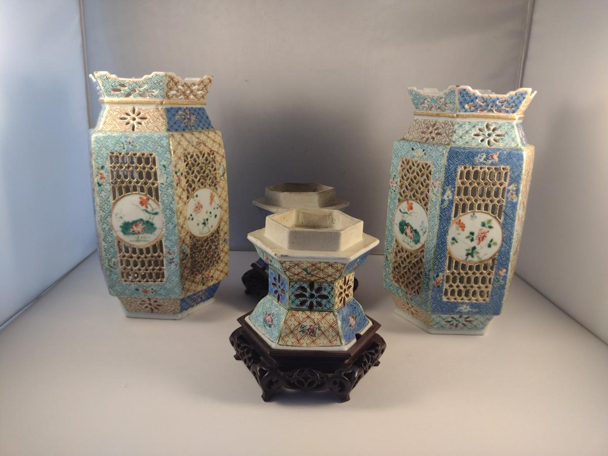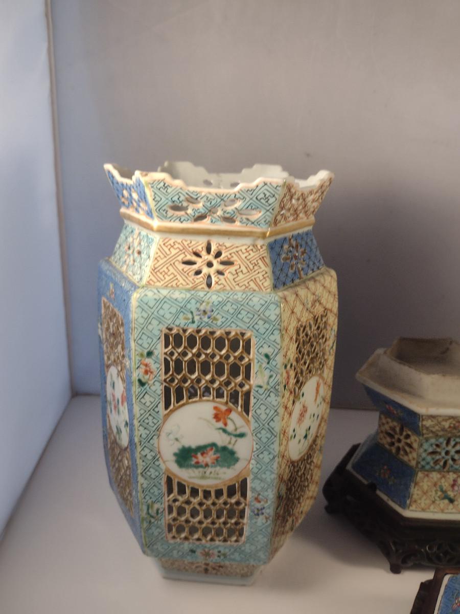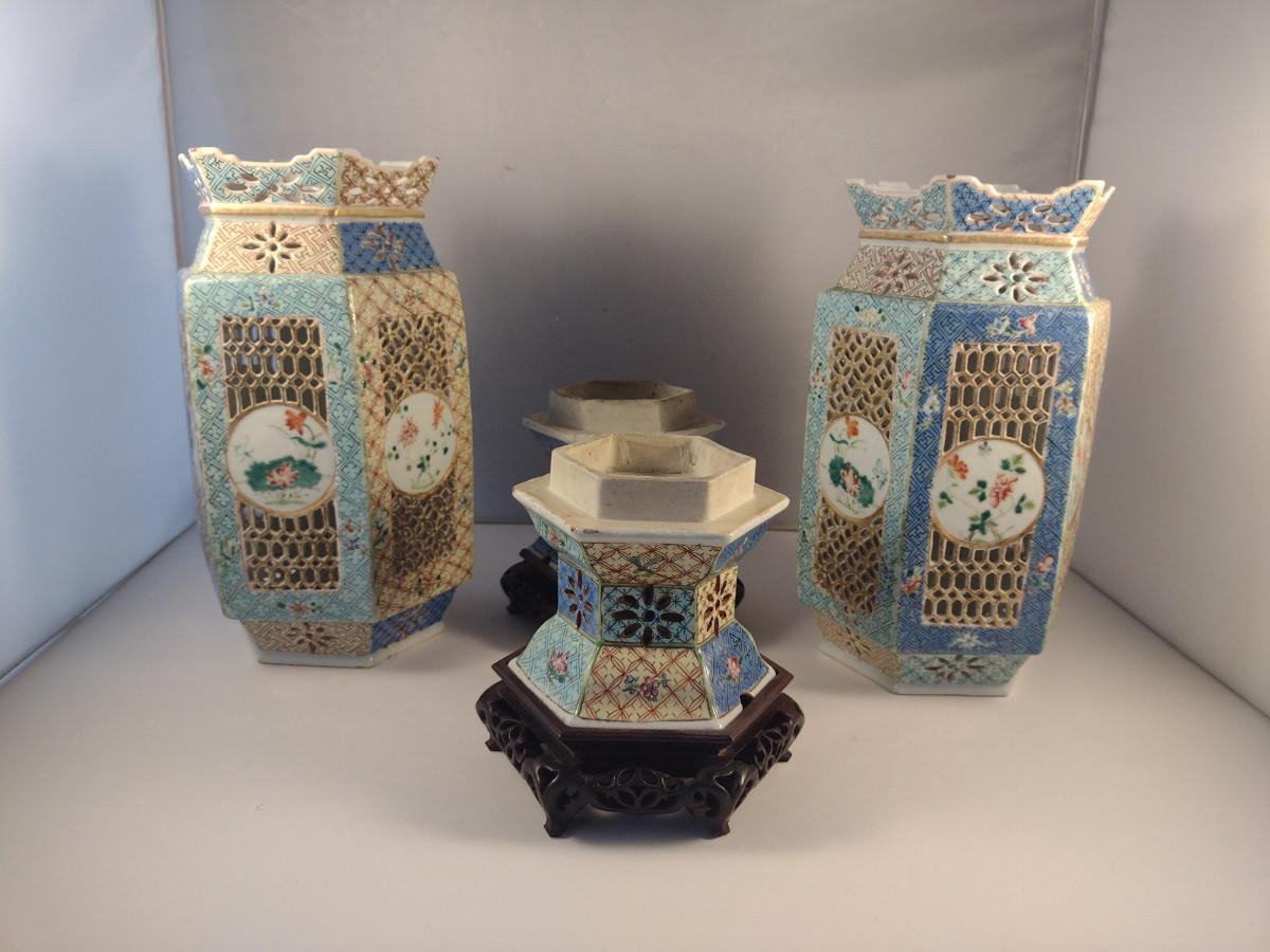 Pair of Antique Ceramic Chinese Wedding Lamps- Circa 1920's- Pierced Design with Wooden Bases. Items may have been electrified at one time, and can be again. Total height when on wooden base, approx 14".