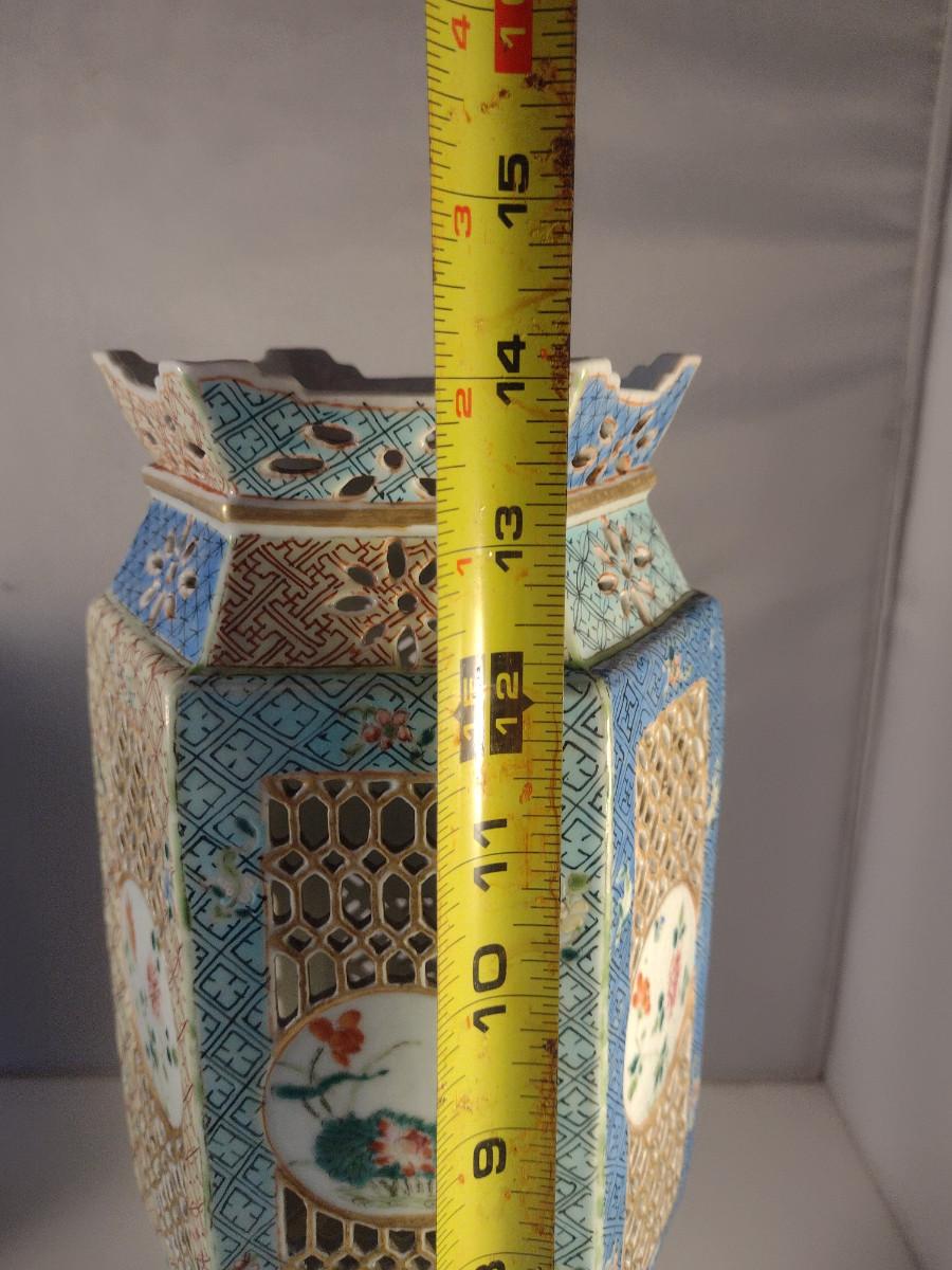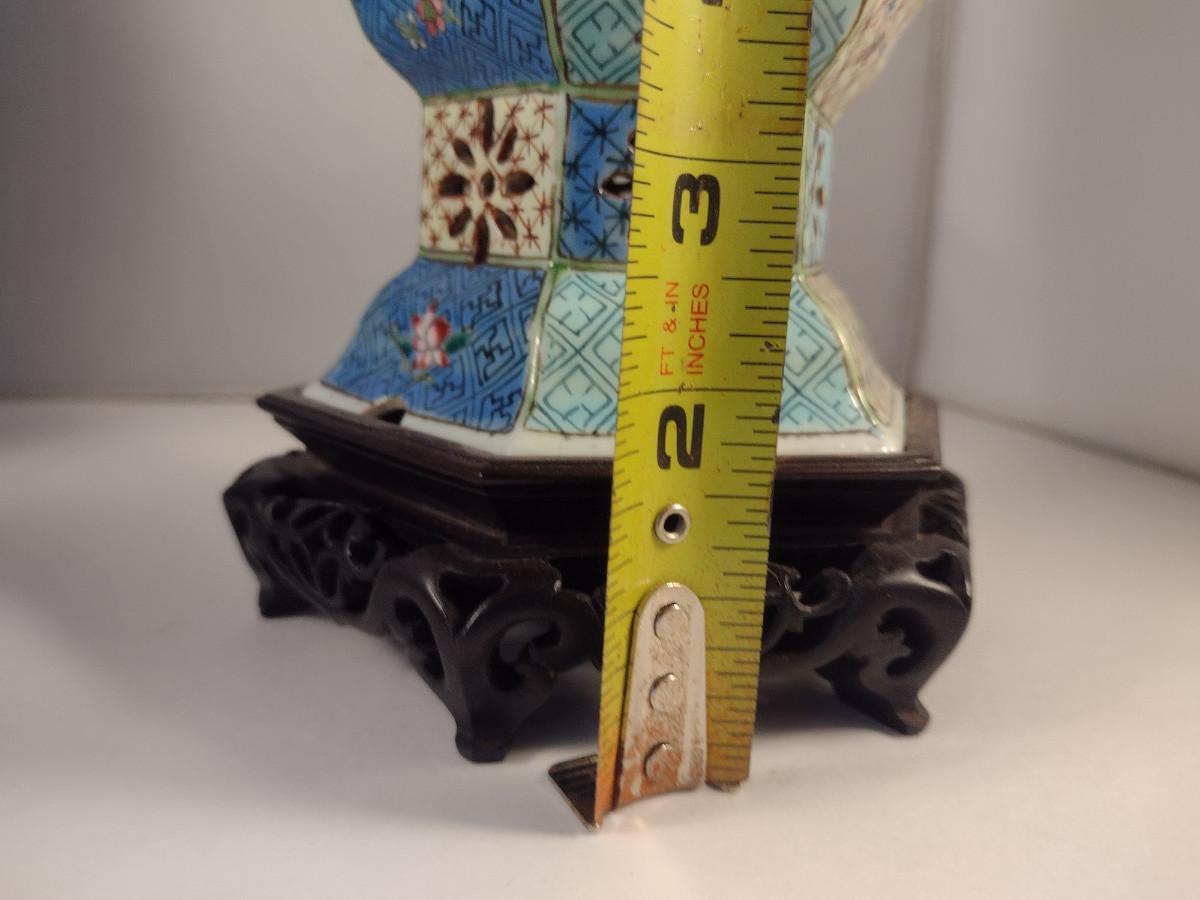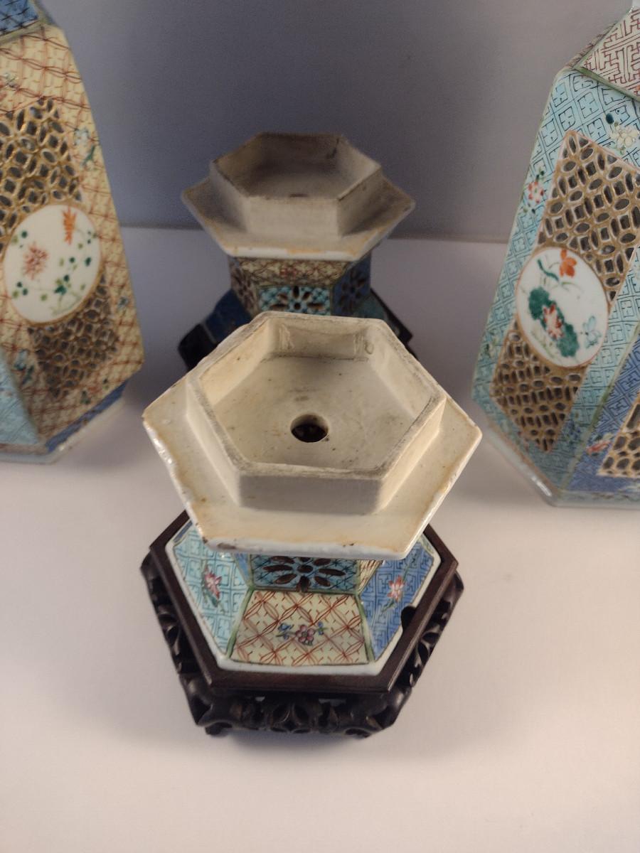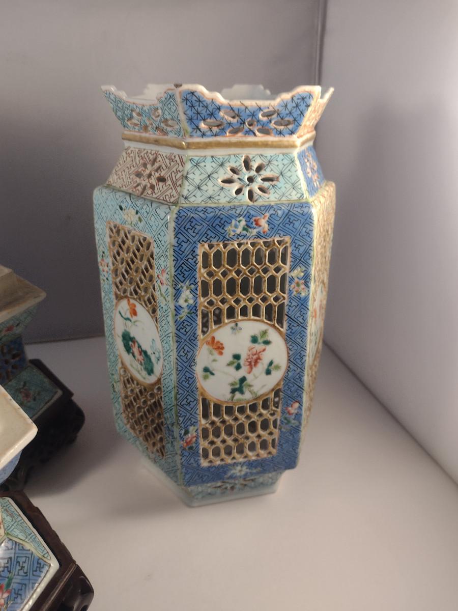 Pair of Antique Ceramic Chinese Wedding Lamps- Circa 1920's- Pierced Design with Wooden Bases. Items may have been electrified at one time, and can be again. Total height when on wooden base, approx 14".