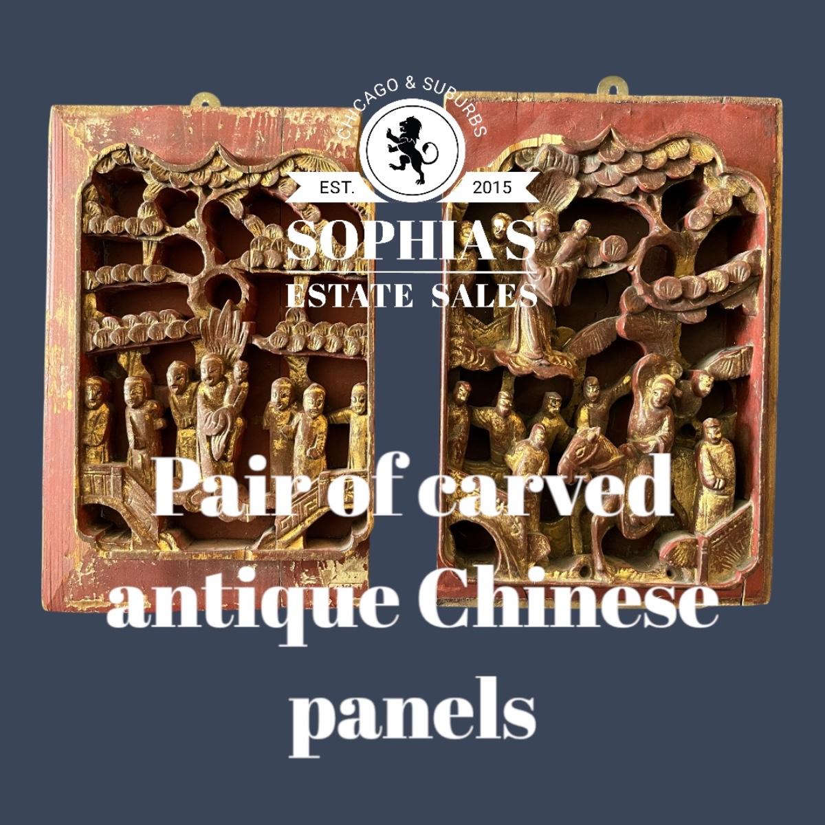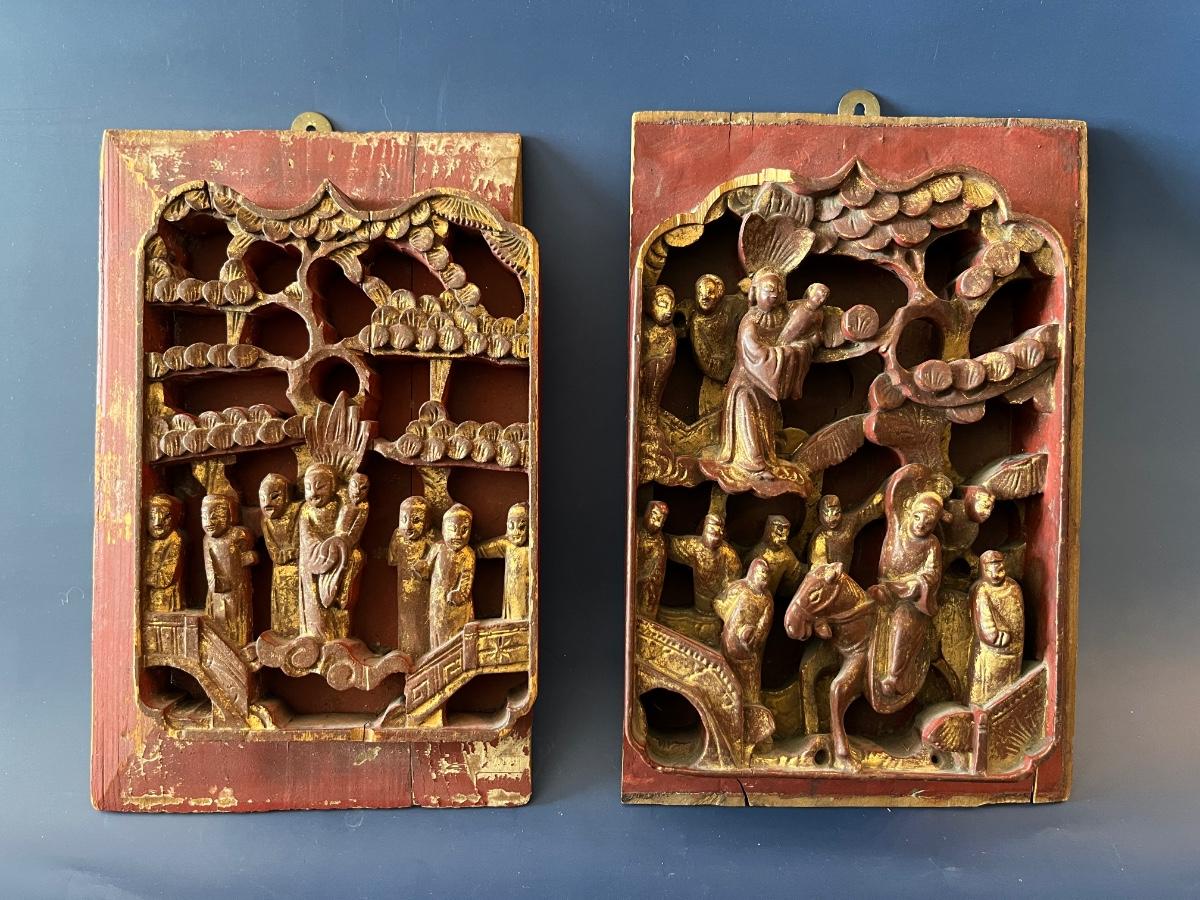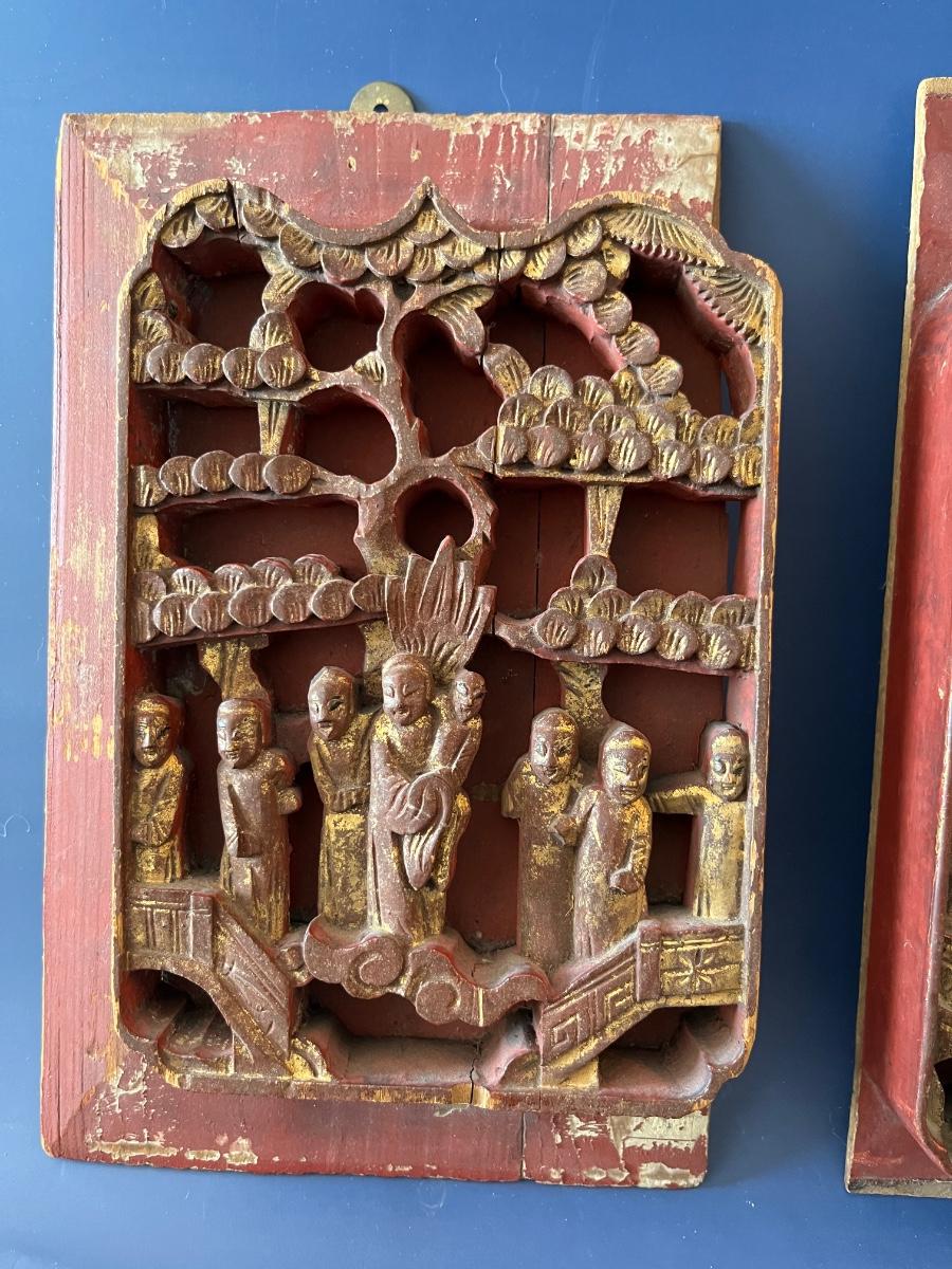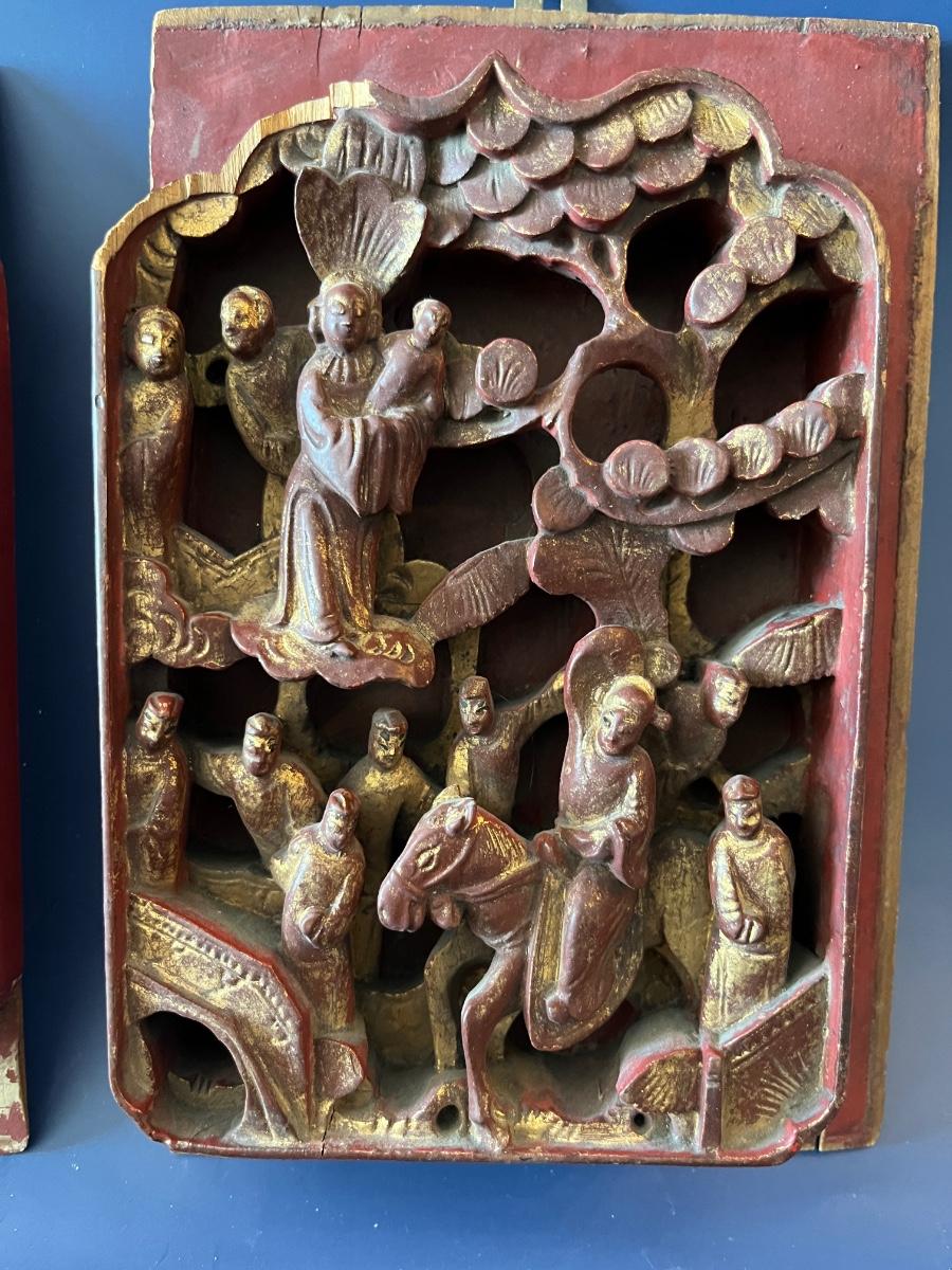 A pair of antique Chinese panels, richly carved with groups of courtiers standing under trees, lacquered in red and gold. These panels would have originally come from a larger piece like a chest or a screen, but now they make a great decorative hanging.