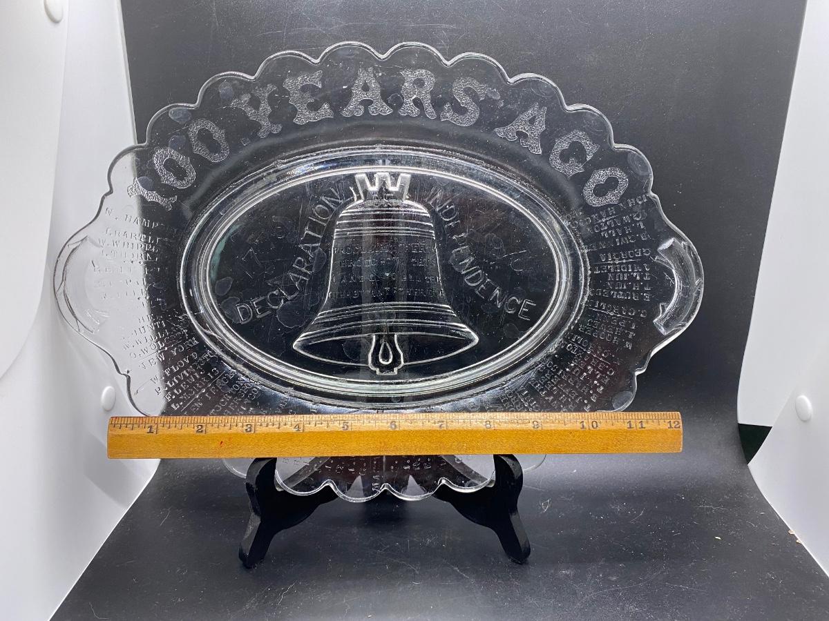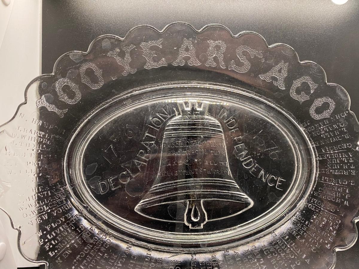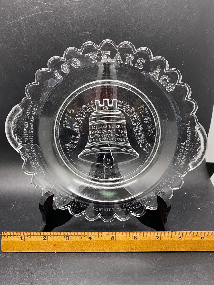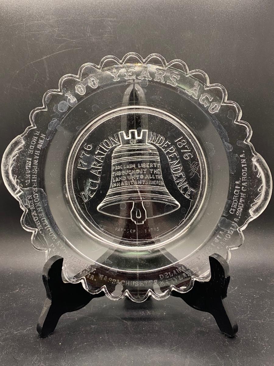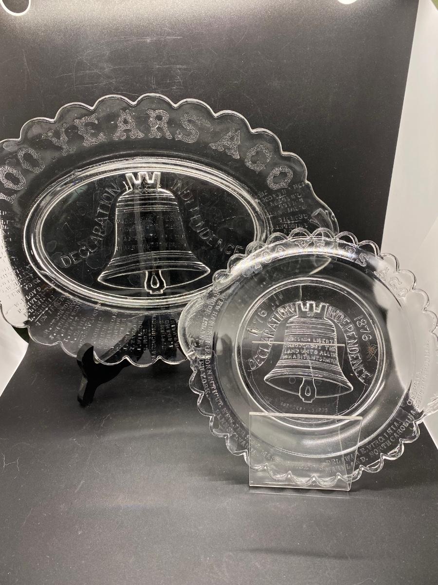 Pair of Antique Declaration of Independence Liberty Bell Commemorative Americana Glass Plates, there is some light cracking on the small Liberty Bell plate, but there is no other significant cracks or chips to either of the plates and is in good collectible condition. The small Liberty Bell plate is patent on Sept 23 1875, check pictures for more details and for sizing.