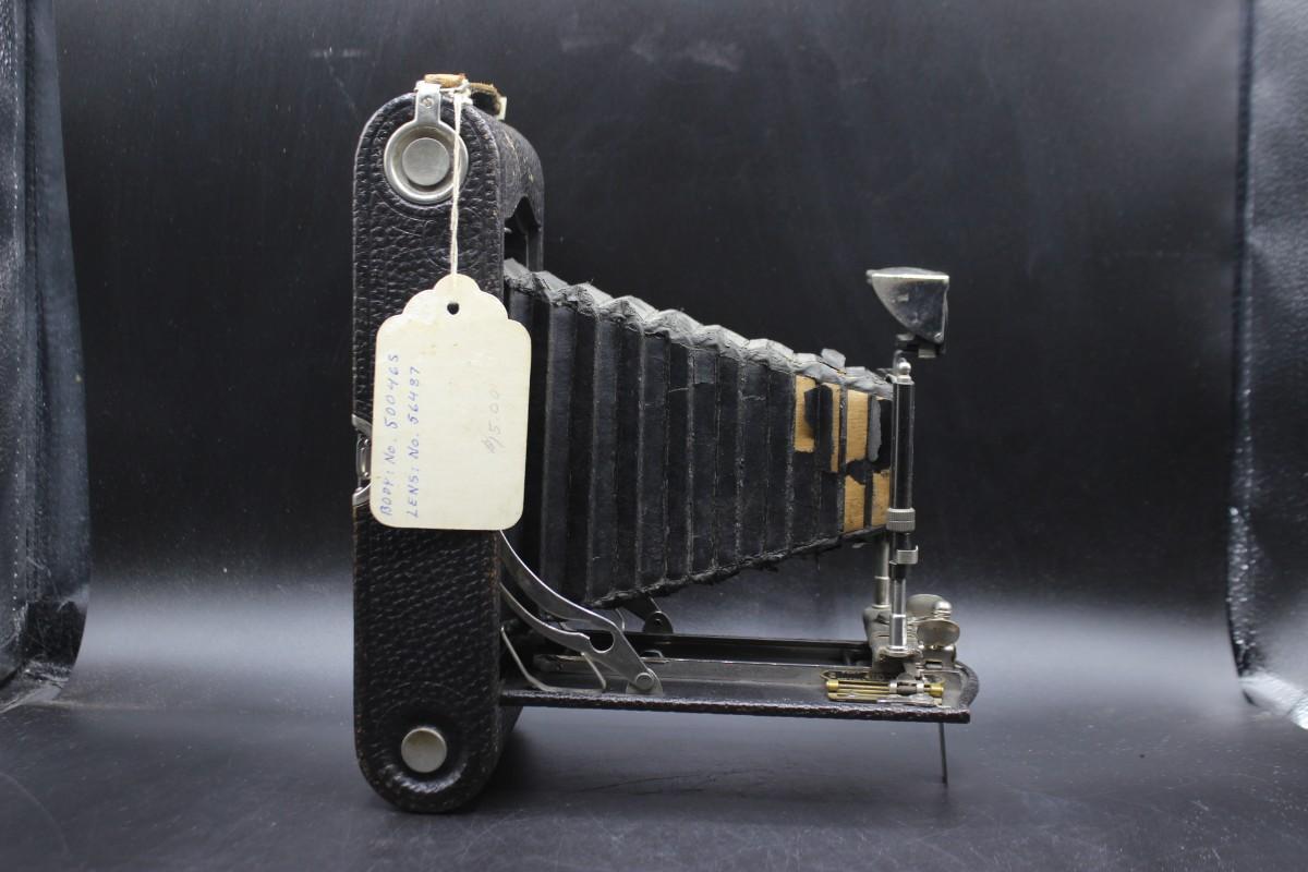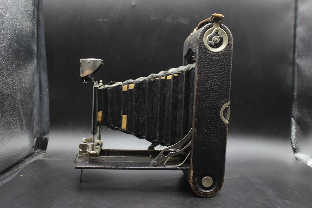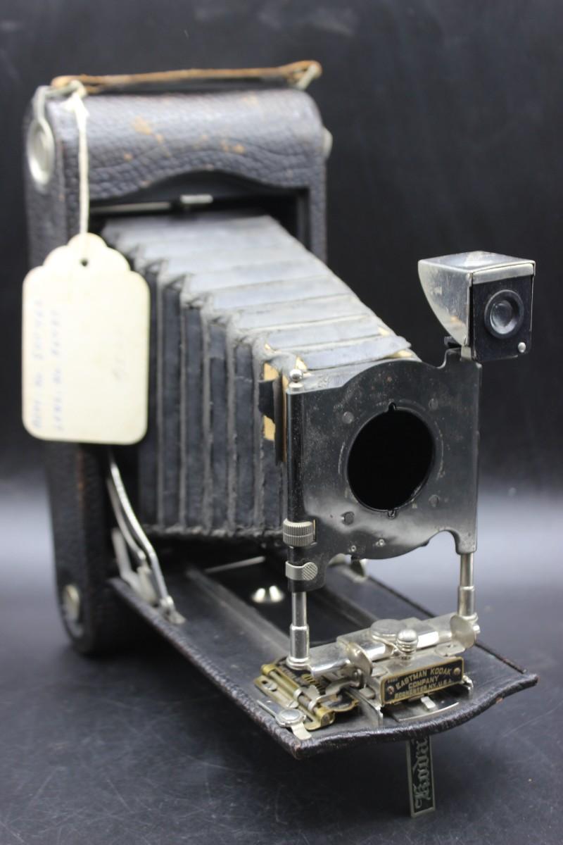 Pair of Antique Folding Kodak Cameras Autographic Junior Rapid Rectilinear & No. 3-A Folding Pocket, there is no lens in the No. 3-A Folding Pocket Camera. There is no other significant damage to the bodies of the cameras and is in overall fair condition. Check pictures for more details and for sizing.