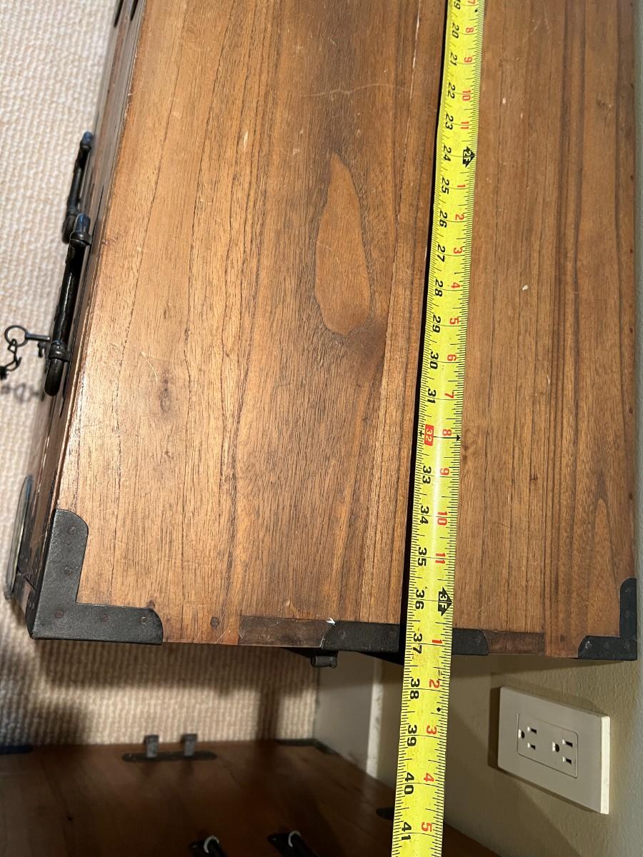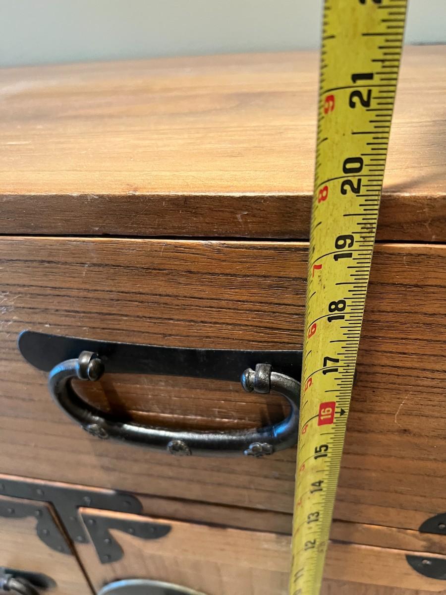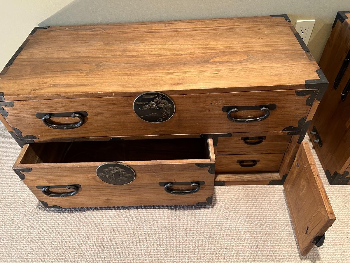 Pair of Japanese Tansu style cabinets. Same dimensions and style, except one has an addition of two small hidden drawers on the bottom. Natural wood stain and black iron metal handles and details. In good condition, with some natural signs of aging.